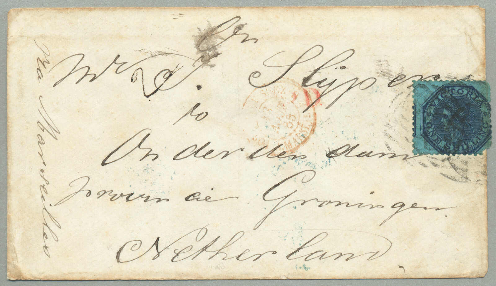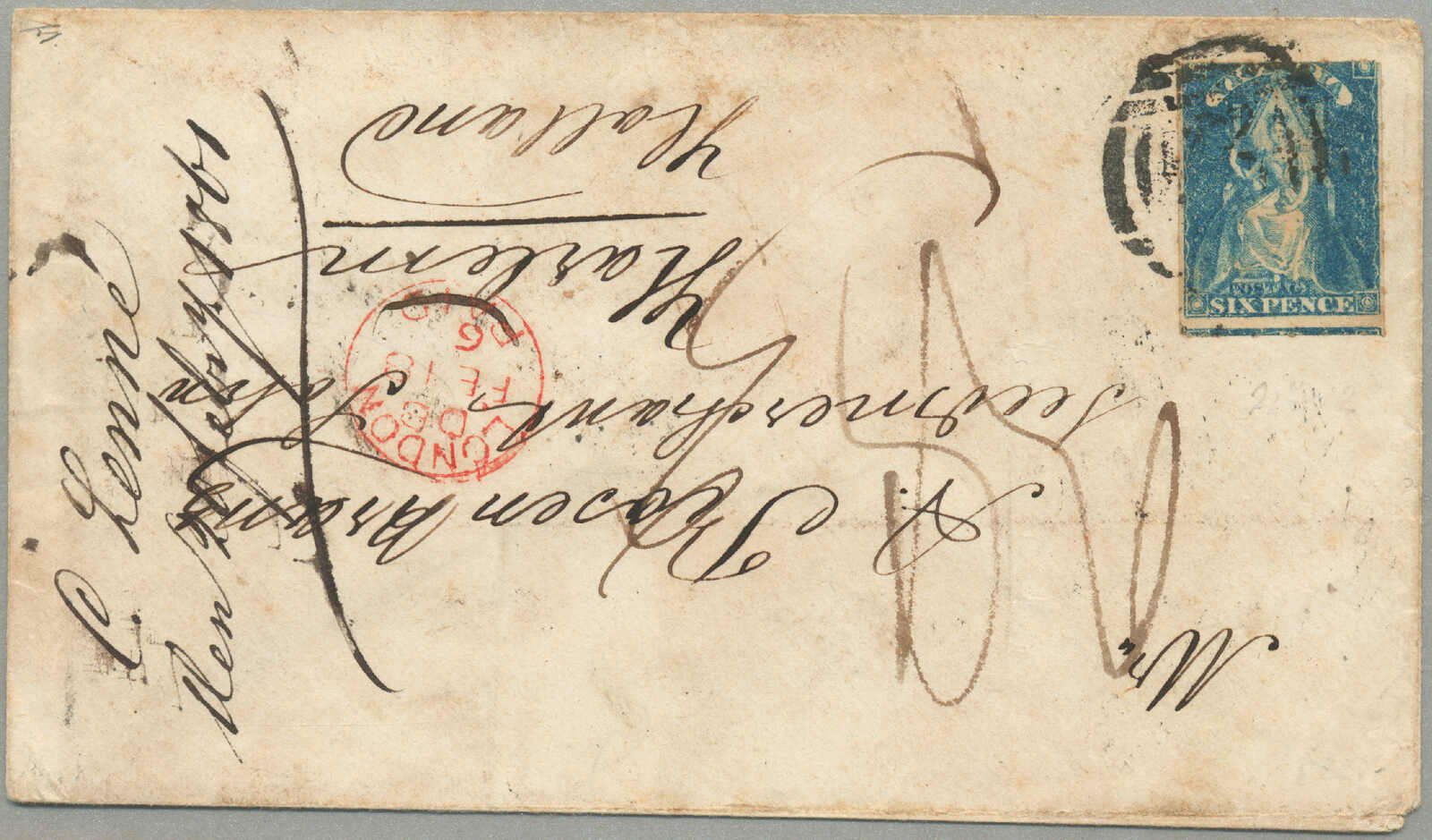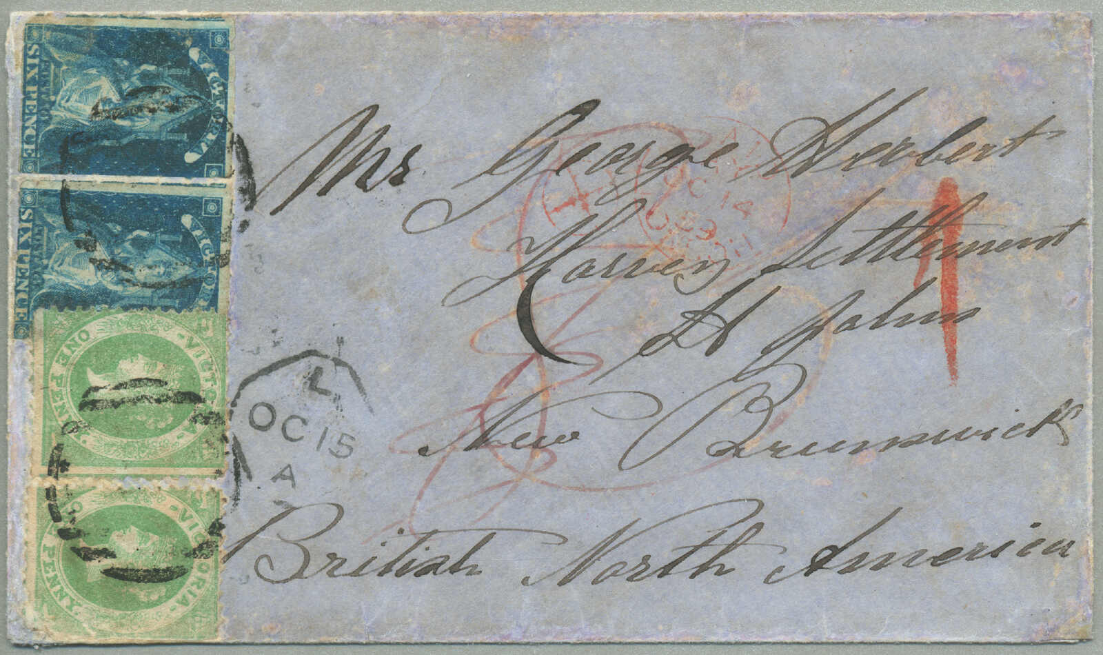 prepaying 1 s. 2 d. for a 1/2 ounce ship letter to New Brunswick, 8 (pence) manuscript in red credit from Victoria to Great Britain for forwarding to New Brunswick scored through and re-rated 3 (d) manuscript in red credit from