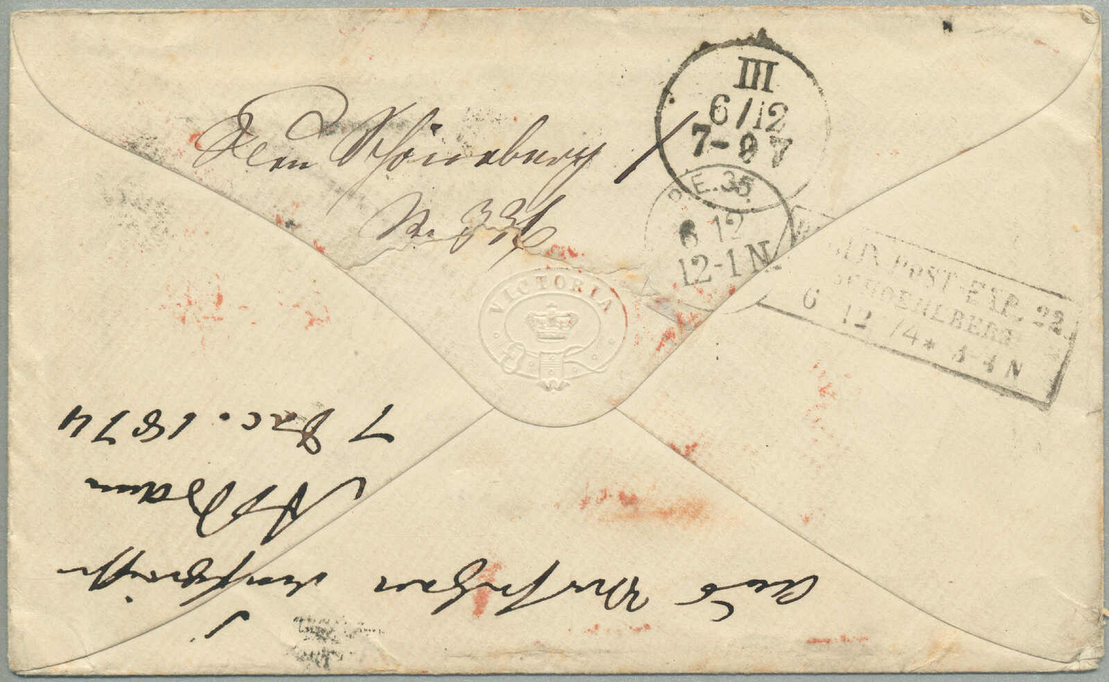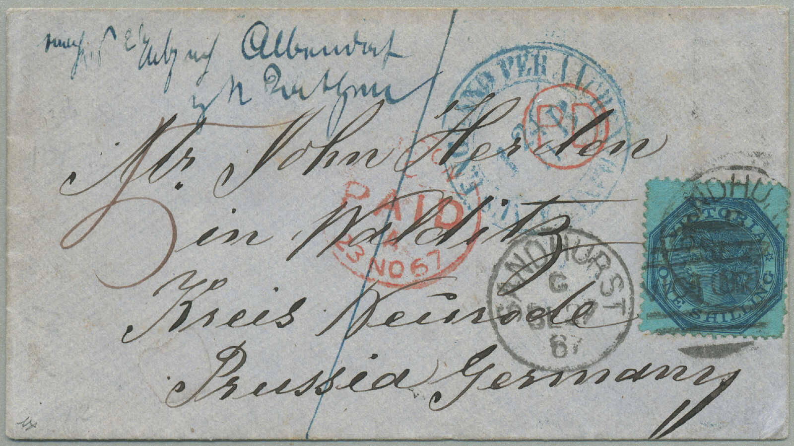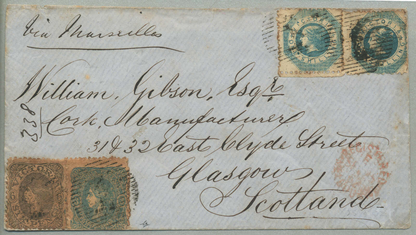 prepaying 1 s. 2 d. for a 1/2 ounce ship letter to New Brunswick, 8 (pence) manuscript in red credit from Victoria to Great Britain for forwarding to New Brunswick scored through and re-rated 3 (d) manuscript in red credit from