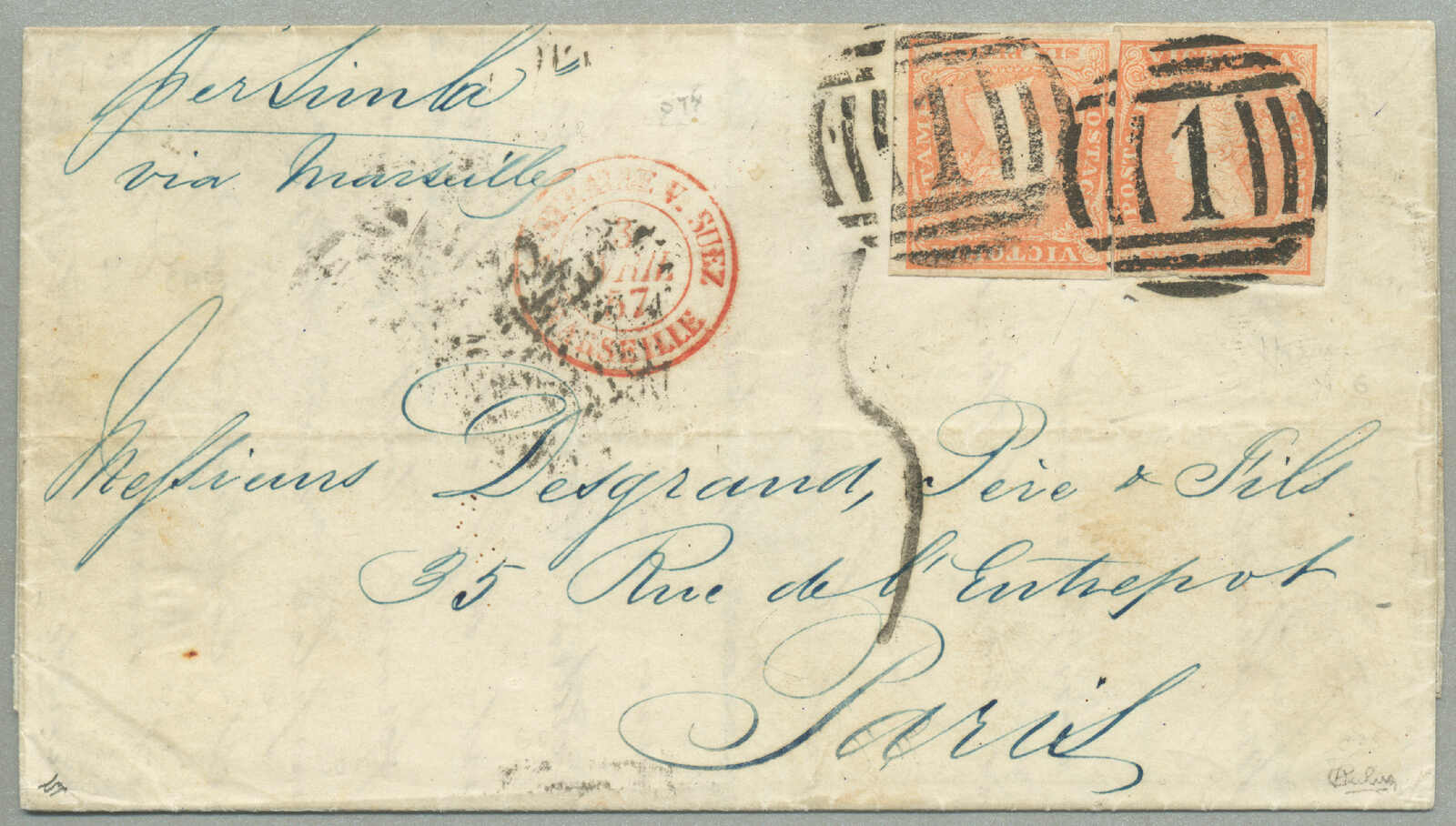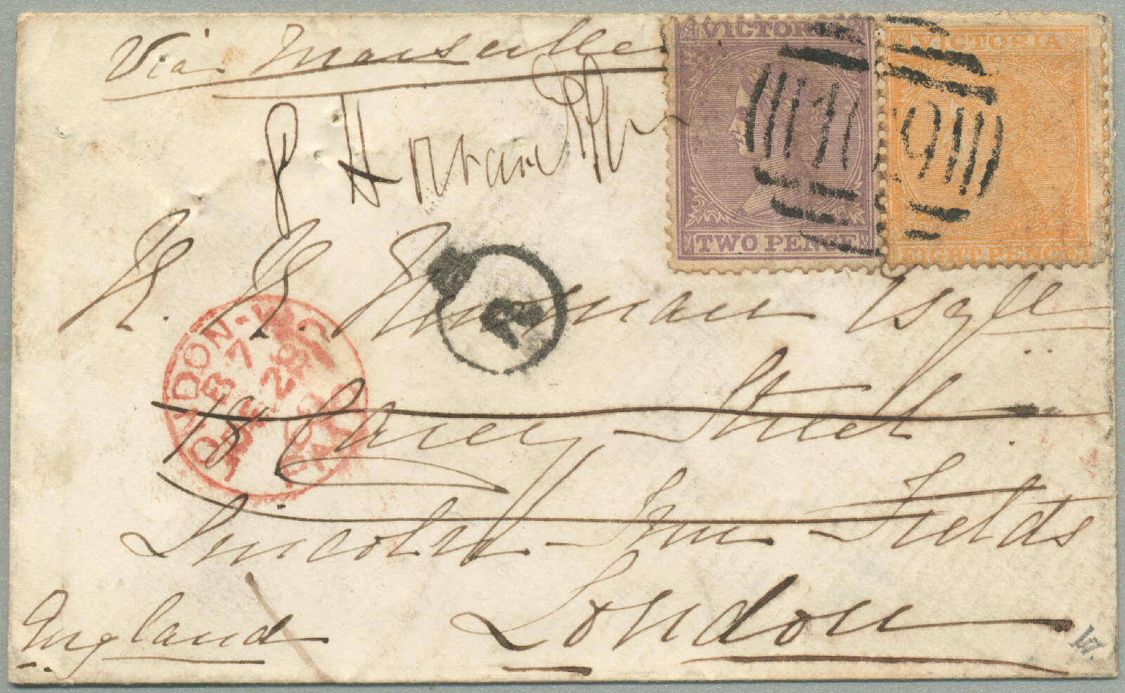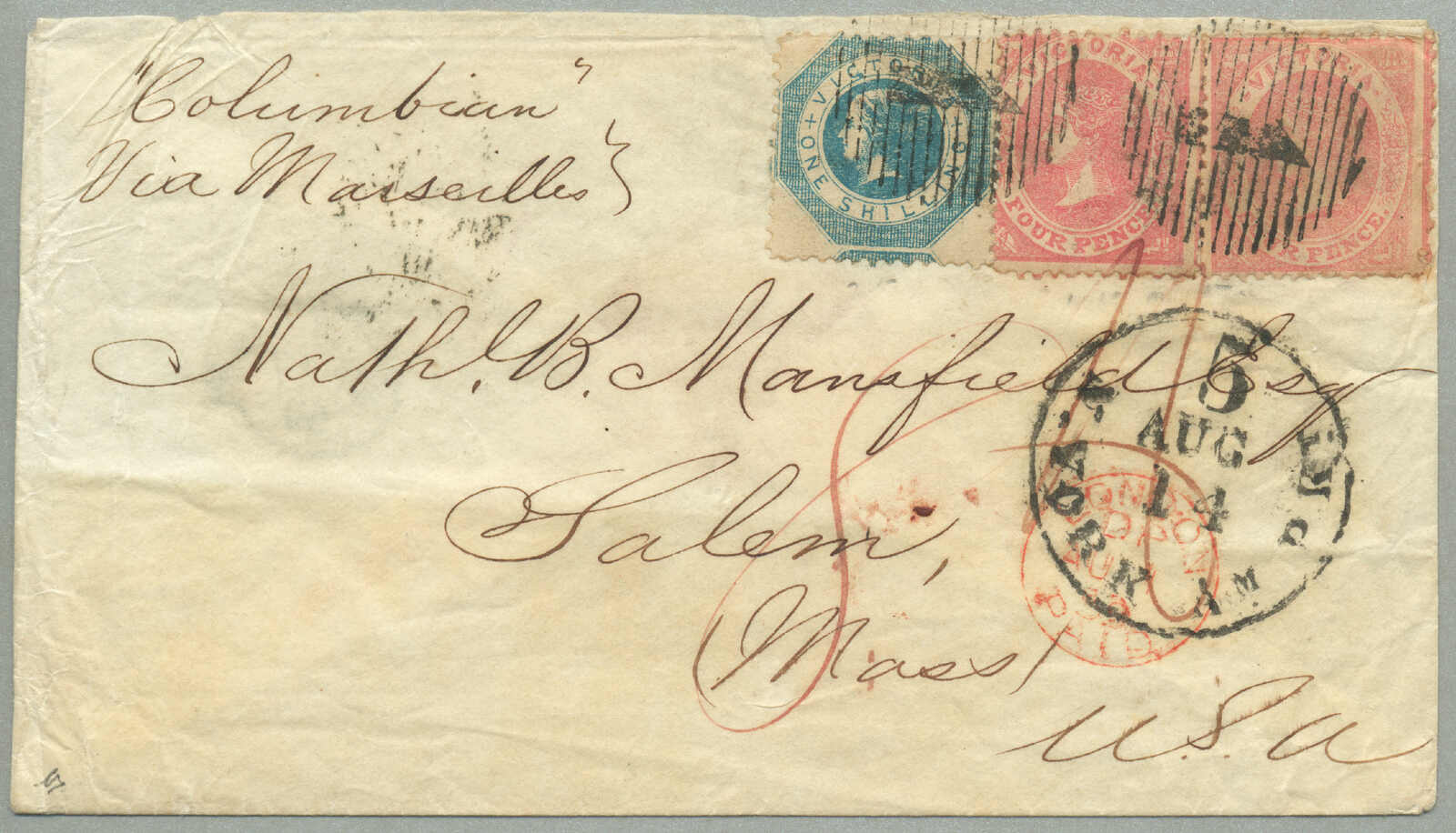 covers recorded from Victoria to New Brunswick, route - P&O Line: departed Melbourne 19 Aug 1859 per Salsette via Port Louis (9 Sept) to Suez (25 Sept), overland to Alexandria, Pera (30 Sept) via Malta (3 Oct) to Southampton (14