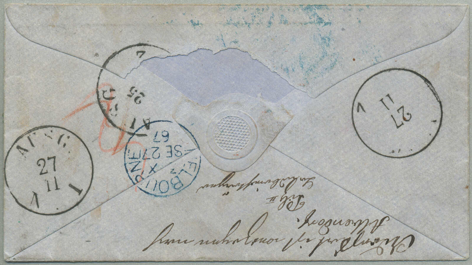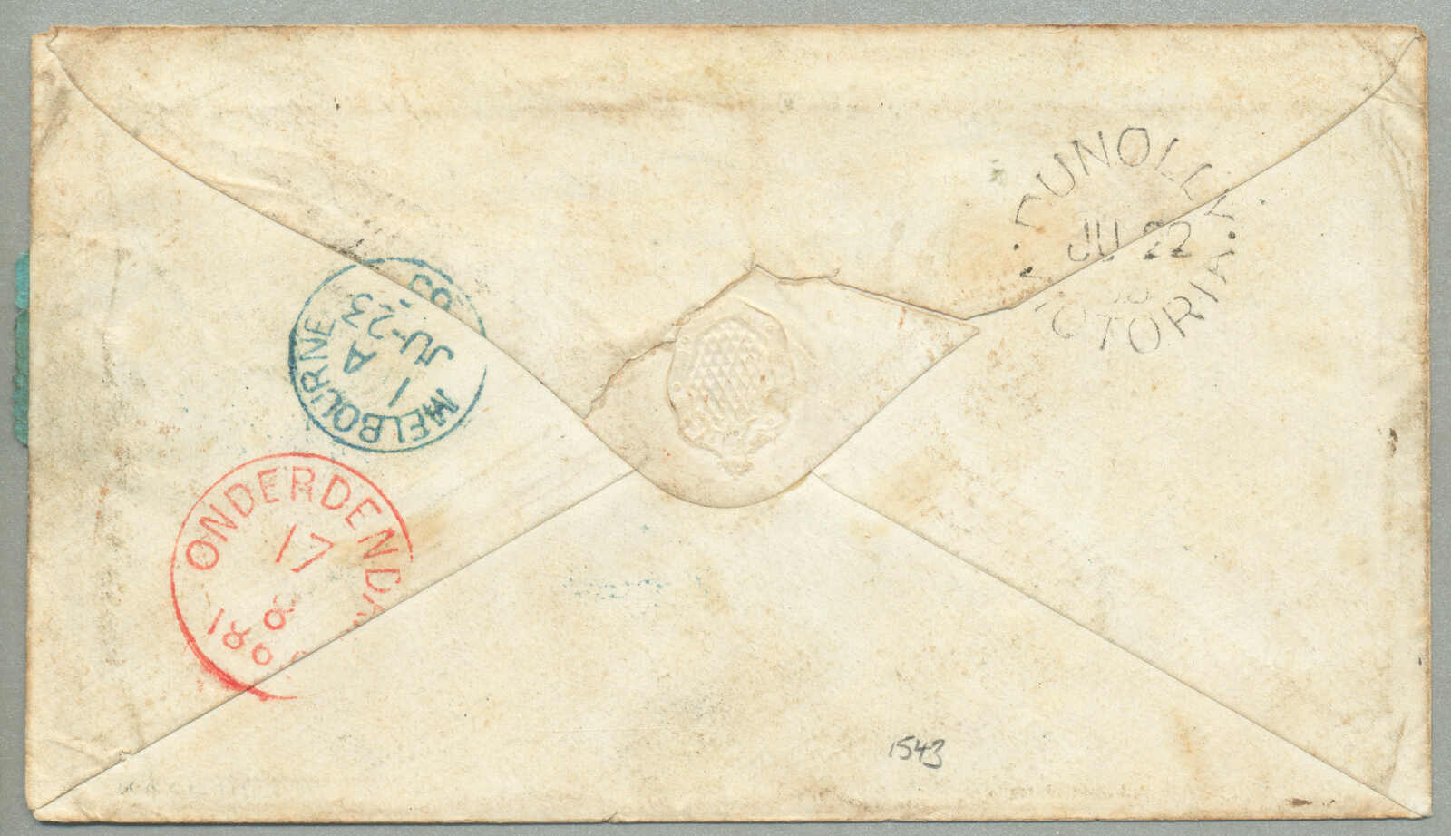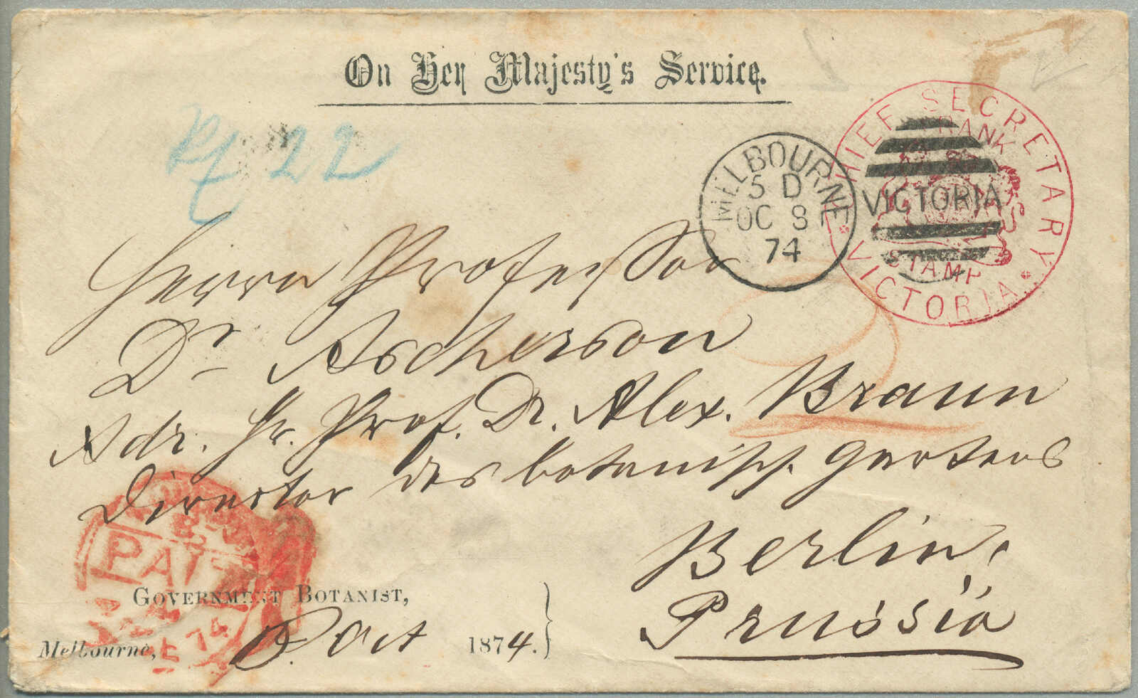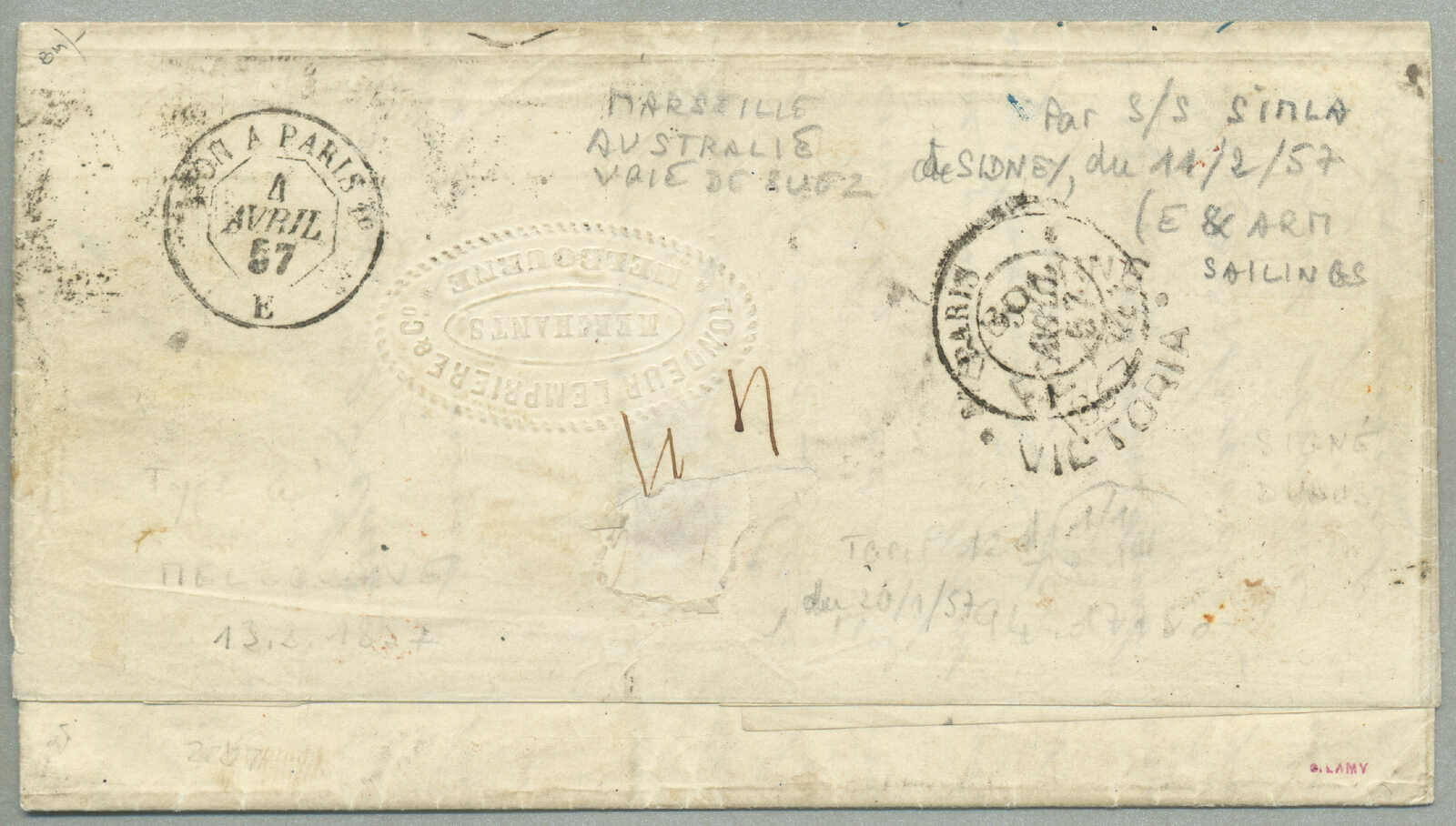 covers recorded from Victoria to New Brunswick, route - P&O Line: departed Melbourne 19 Aug 1859 per Salsette via Port Louis (9 Sept) to Suez (25 Sept), overland to Alexandria, Pera (30 Sept) via Malta (3 Oct) to Southampton (14