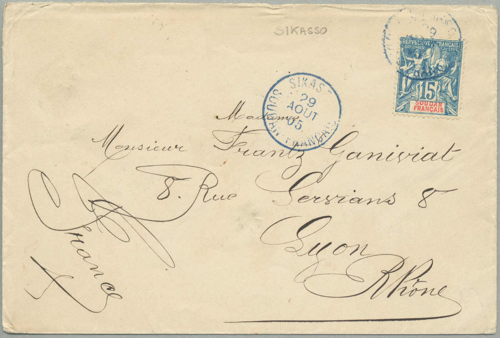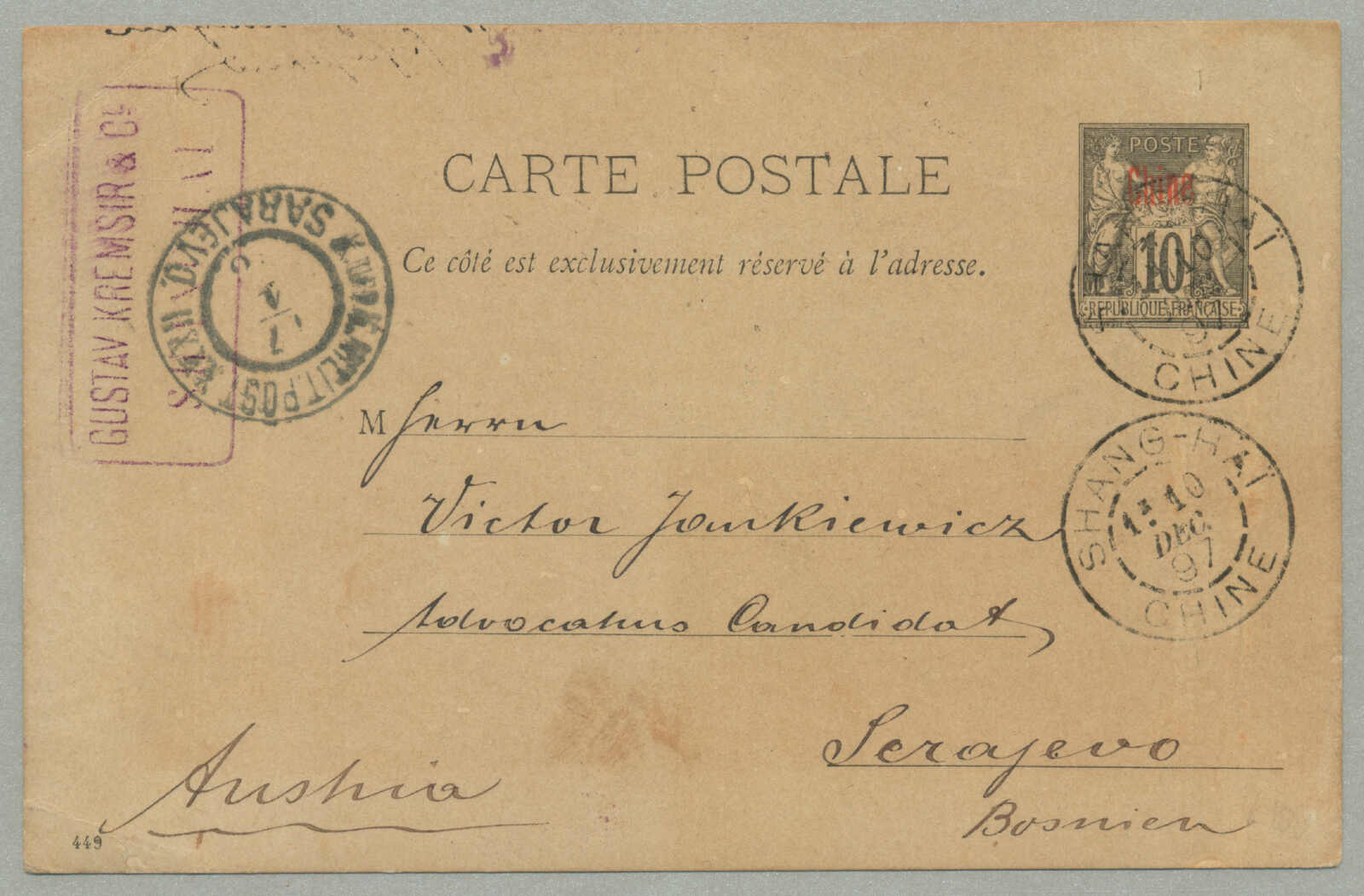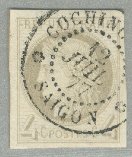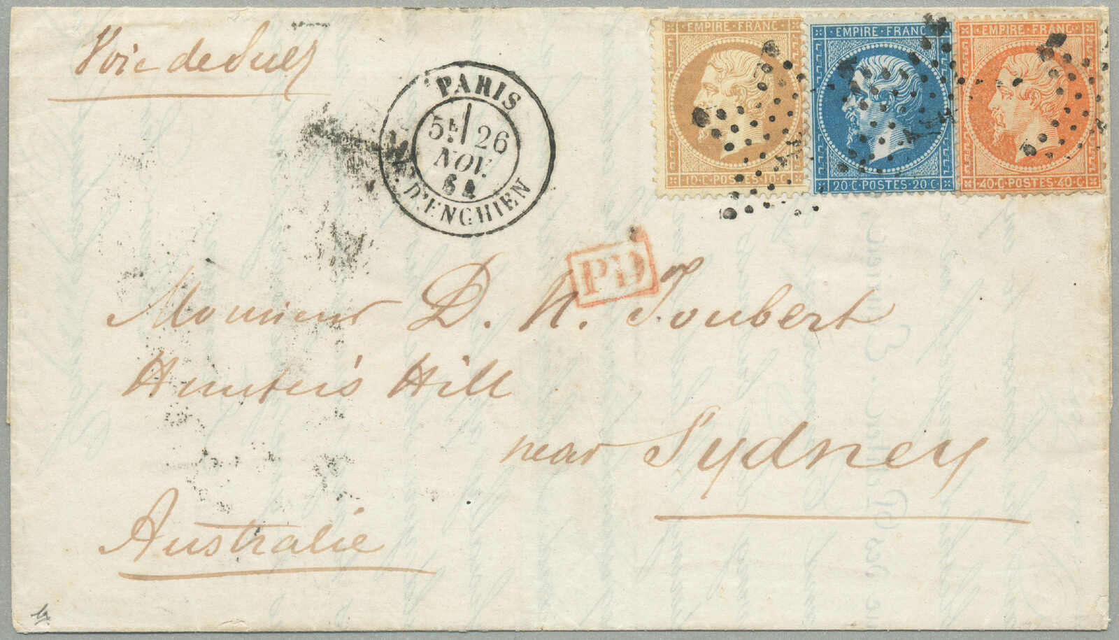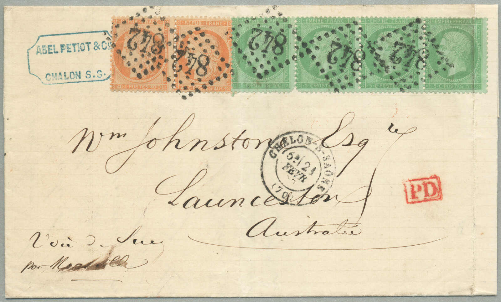 Tasmania, all tied by gros chiffres 842 cancel of Chalon Sur Saone and prepaying 1 franc for a 1/2 ounce ship letter to Tasmania, aside P.D. handstamp in red and transit datestamps for Dijon, Lyon, Marseilles and arrival of Launceston