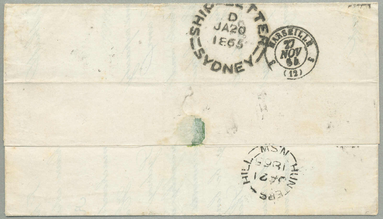 Automatisch generierte Übersetzung: 1872, eingehende Post Überland über Marseilles, 1862 Frankreich 5 c. grün auf grünlich im waagrechten