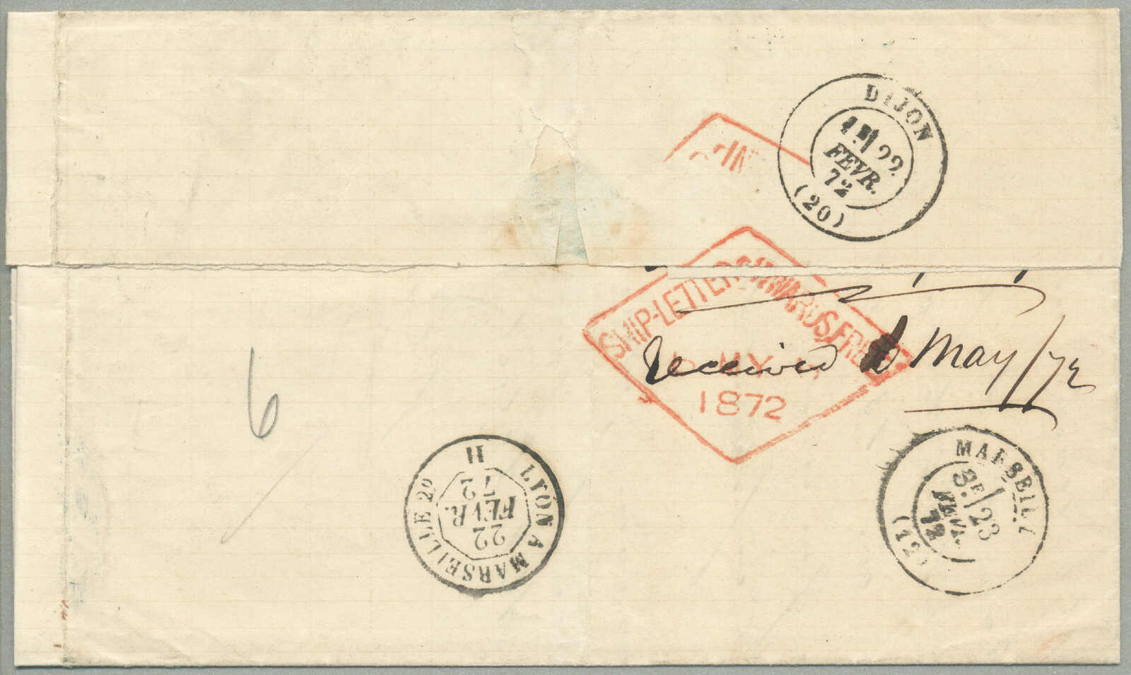 / 2 Unze Schiffsbrief zu Tasmania, beiseite P.D. Handstempel in rot und Transit Datumsstempel für Dijon, Lyon, Marseilles und Ankunft von Launceston in rot auf der Rückseite, Strecke - abgefahren Chalon Sur Saone 21 Feb 1872 mit der Eisenbahn über