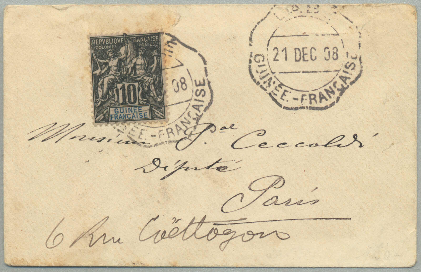 Sumatra to Galle (13 April), Baroda (13 April) via King Georges Sound (28 April) to Melbourne (5 May), Tasmanian Steam Navigation Co: Departed Melbourne (5 May) per Derwent to Launceston, arriving 6 May 1872 (74 days), Note: Whilst most of the covers from France are addressed to New South Wales and Victoria, covers to the other Australian Colonies are very rare, particularly Tasmania, vertical filing folds cross the first and final stamp in the 5 cent multiple,