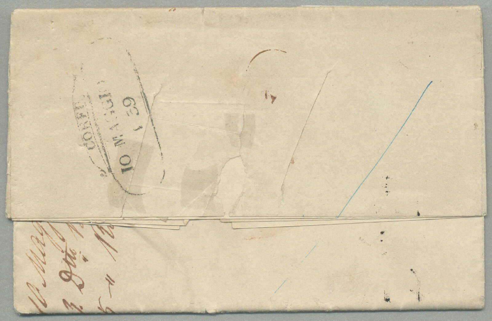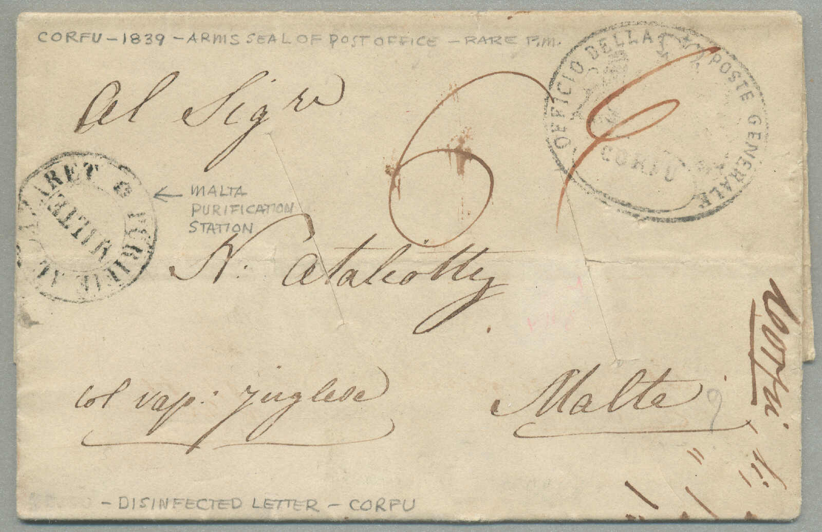 1839, Desinfected mail, letter from Corfu to Malta, top right with senders cachet OFFICIO DELLA POSE GENERALE and m/s rating 6, left with desinfection cancel MALTE, and m/s Col. Vap. Inglese, diagonal desinfection slits are