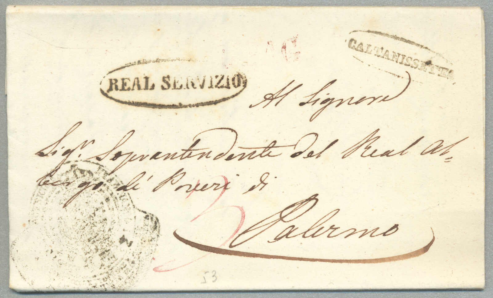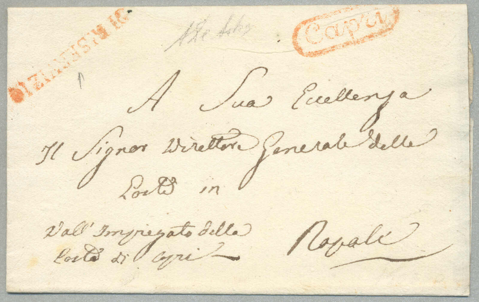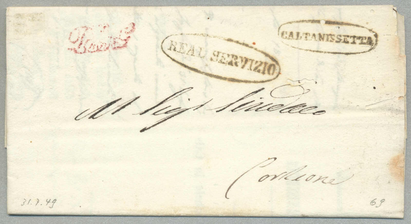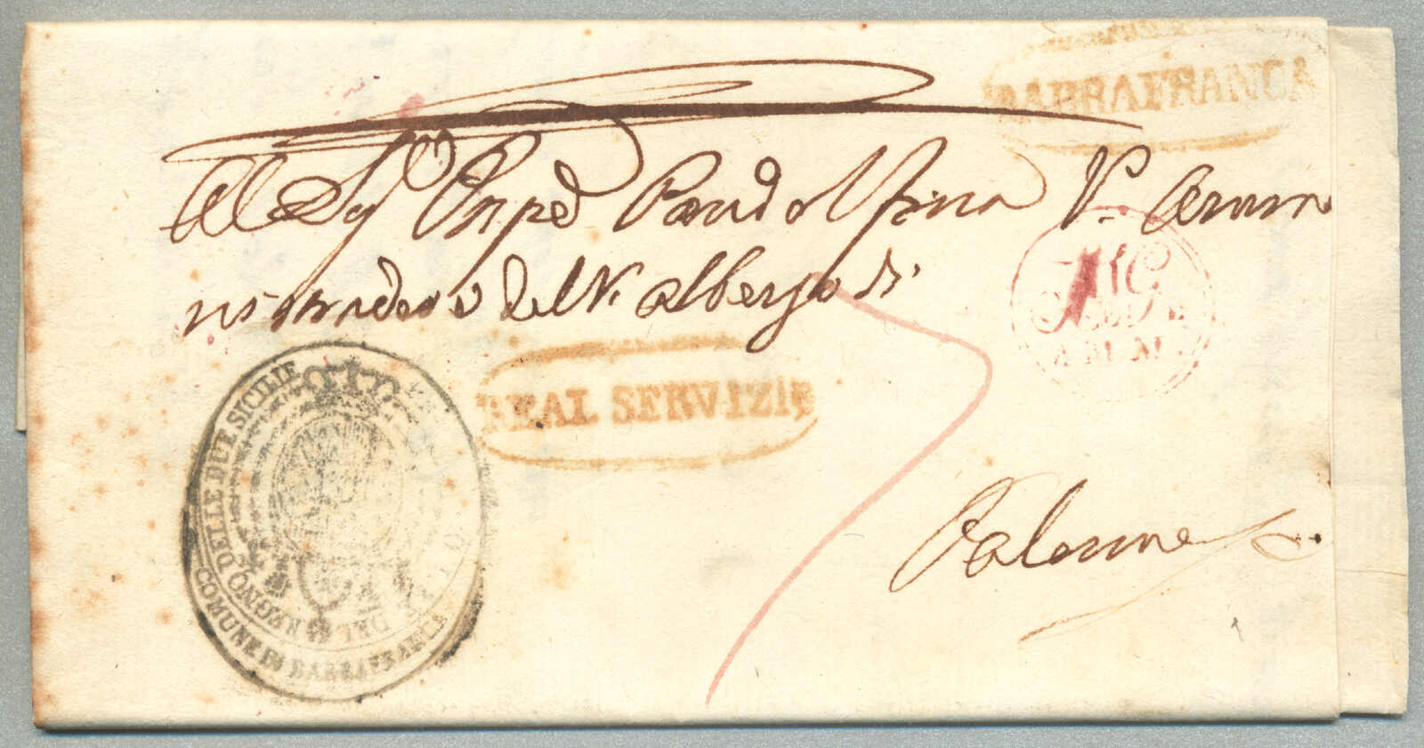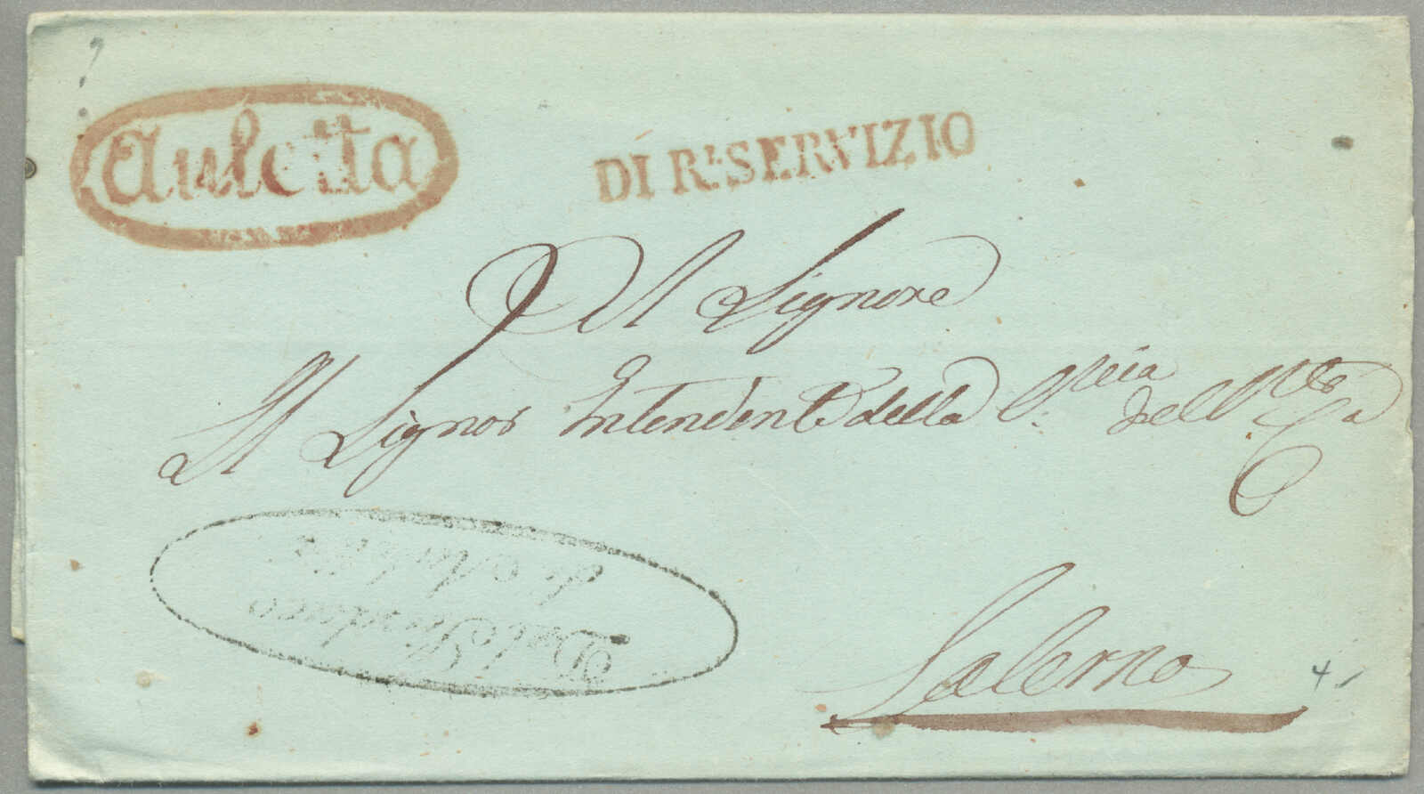 about 1830s, with neatly strike of red AULETTA and red DI RISERVIZIO, on folded letter, ex Provera, XF! Estimate 200€.