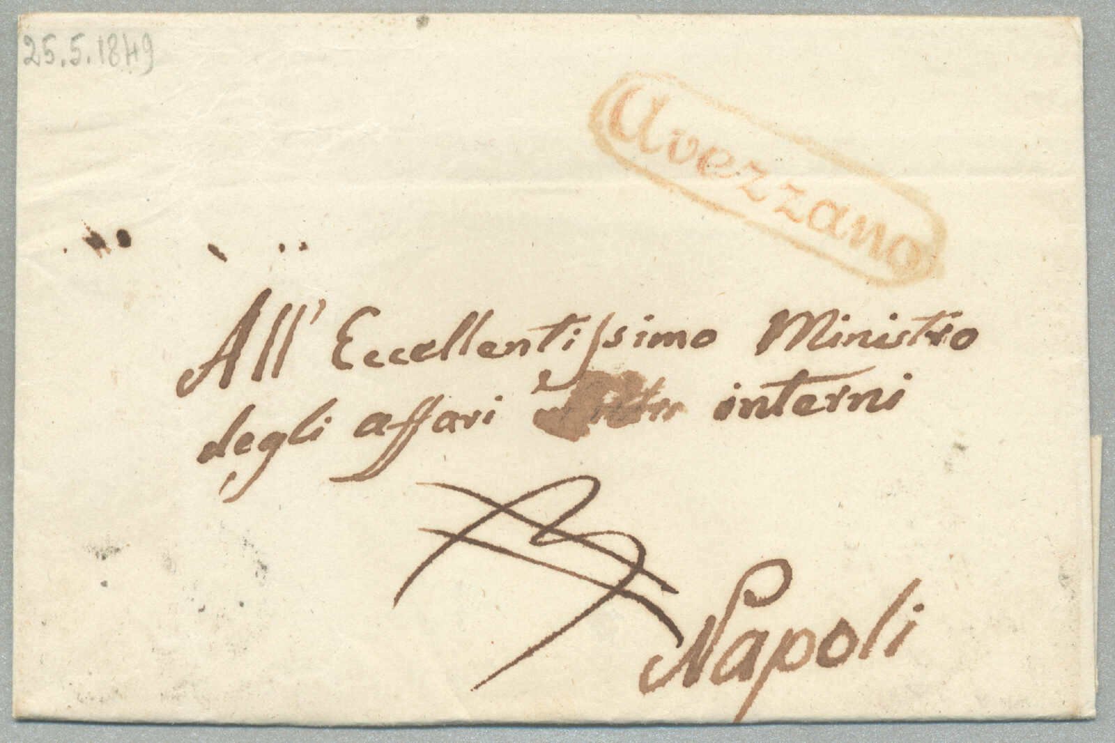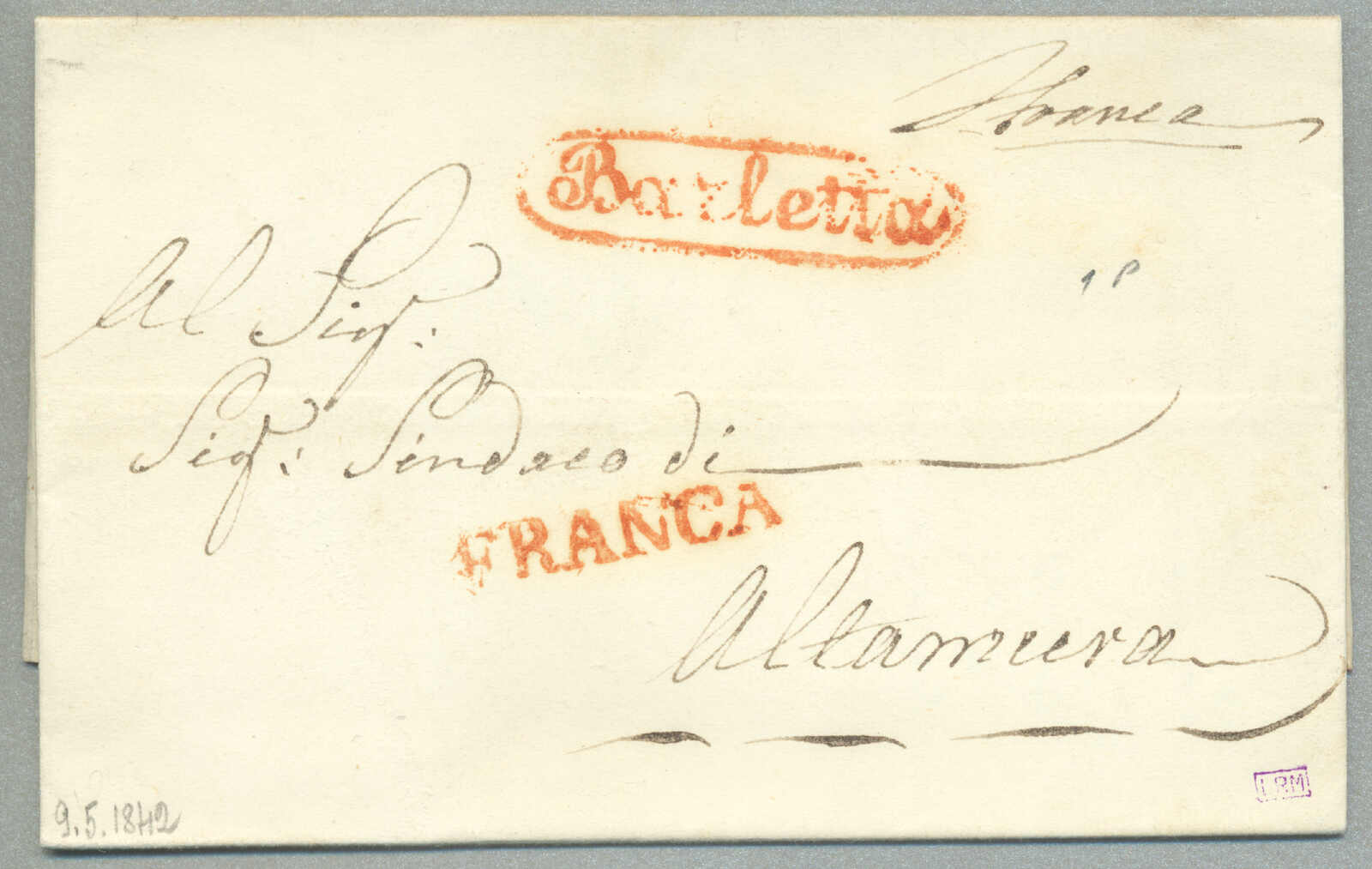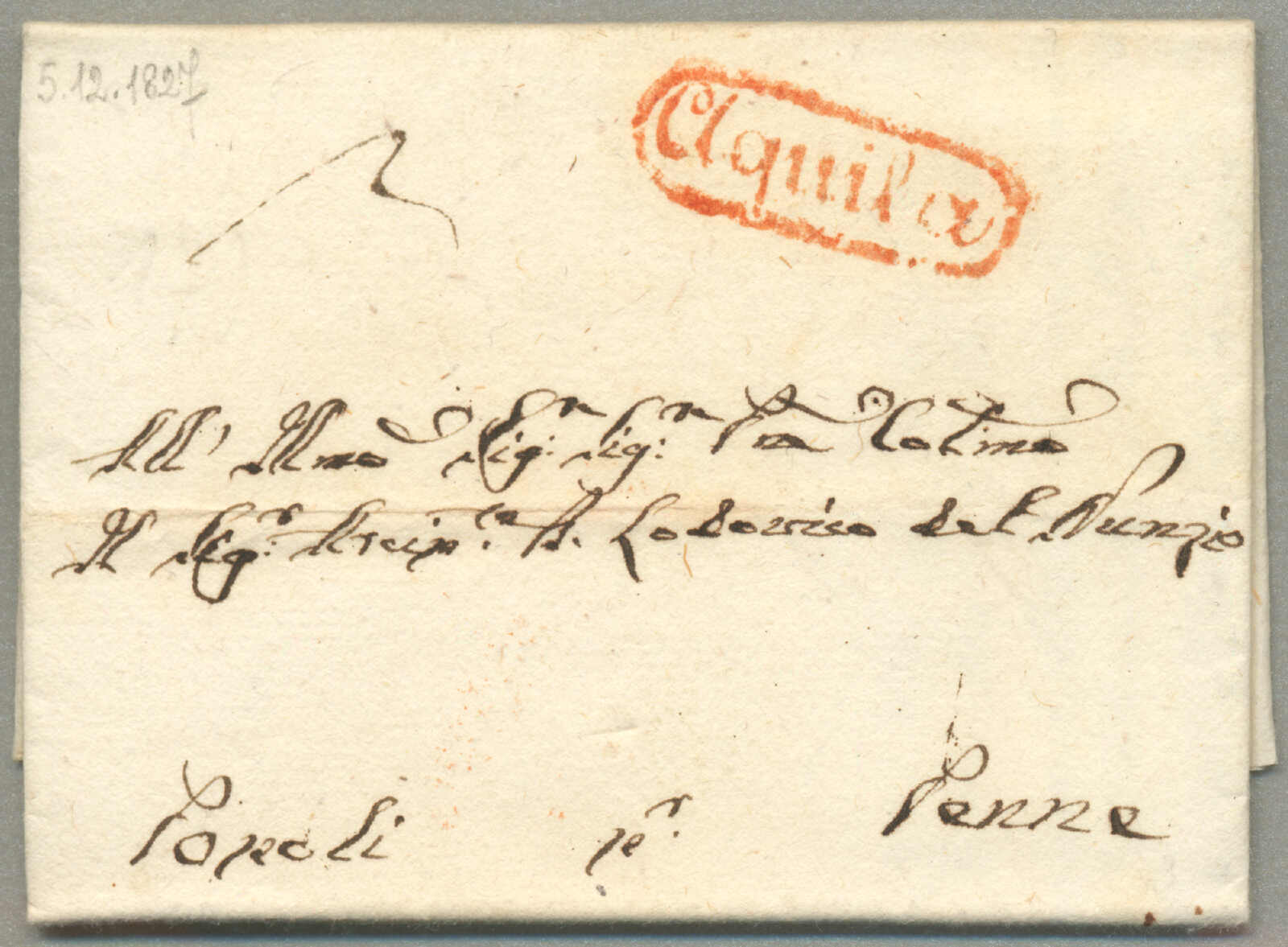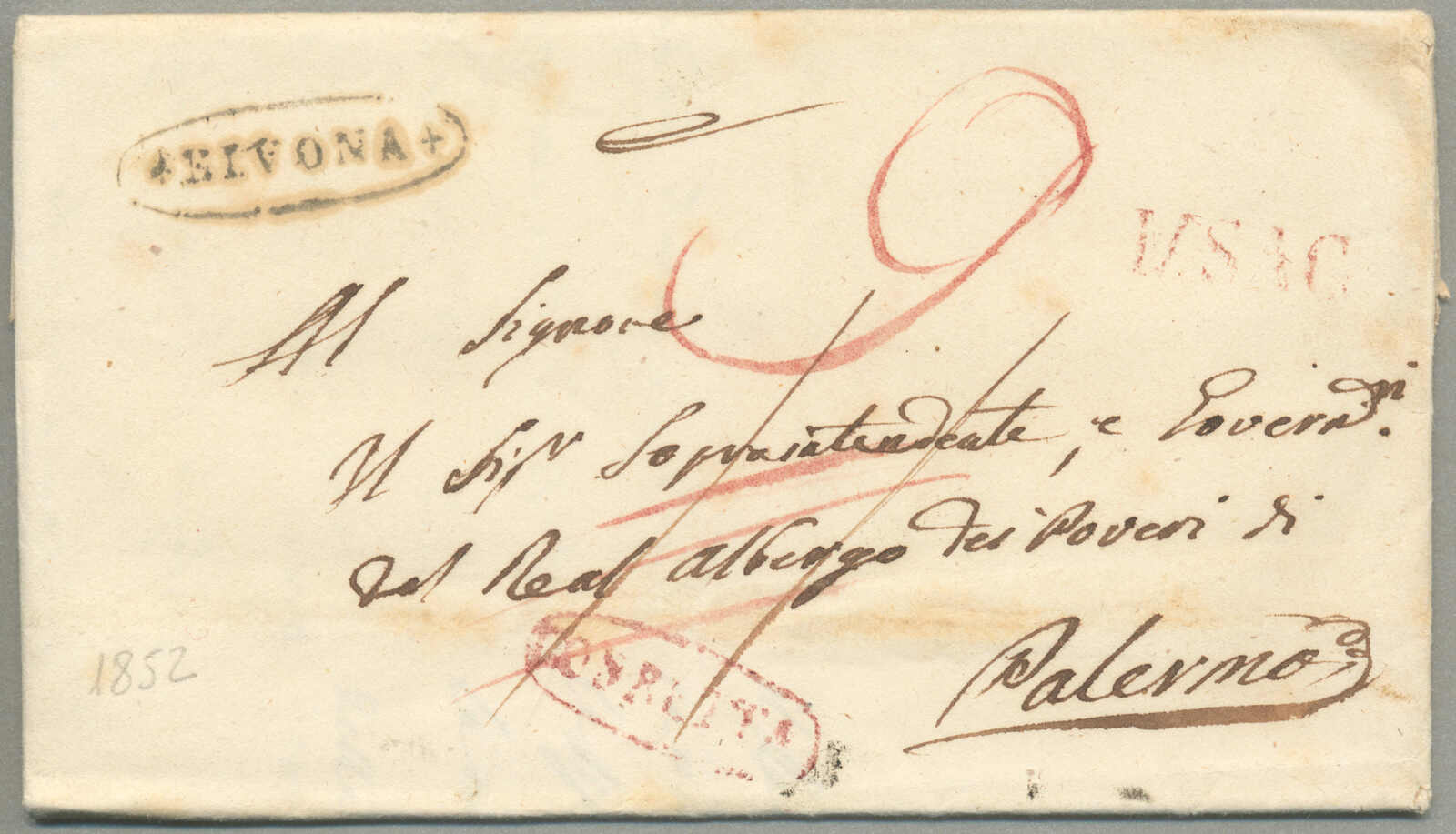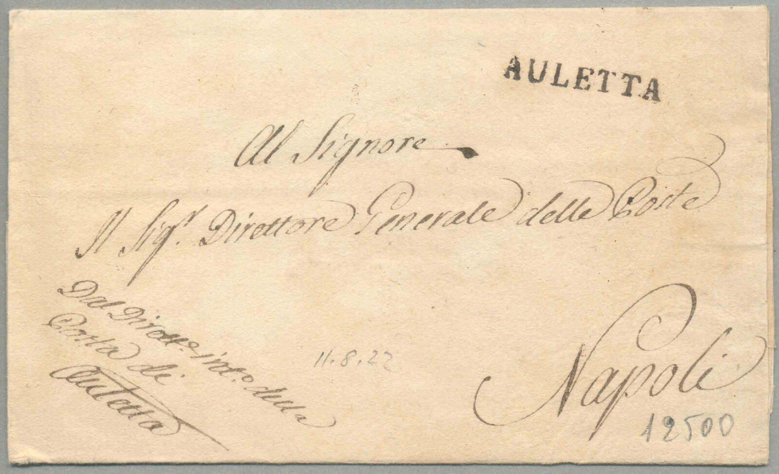 about 1830s, with neatly strike of red AULETTA and red DI RISERVIZIO, on folded letter, ex Provera, XF! Estimate 200€.