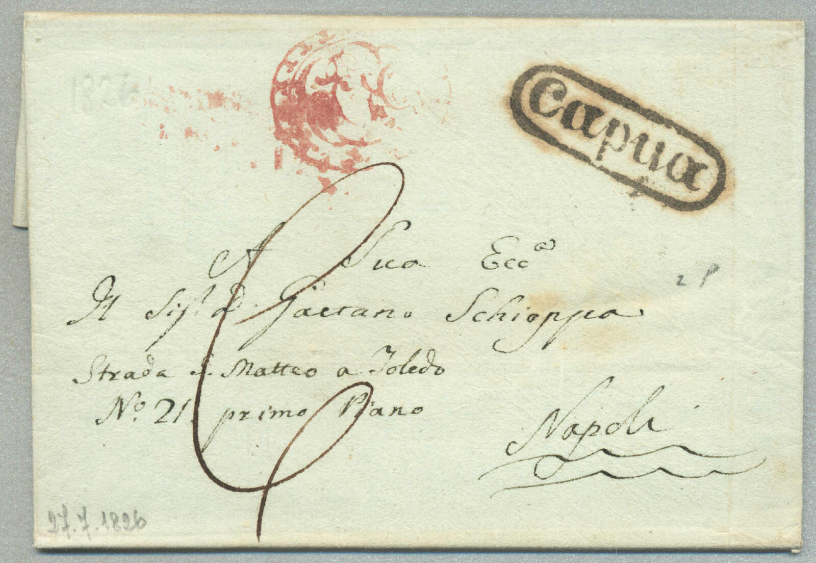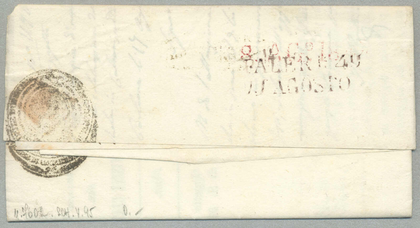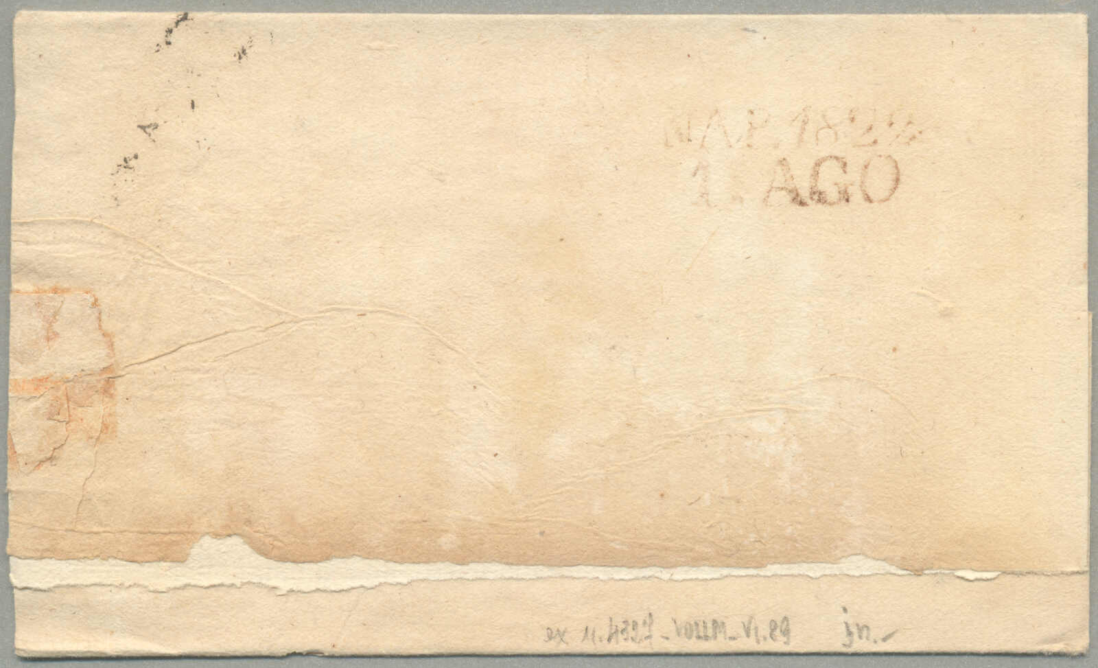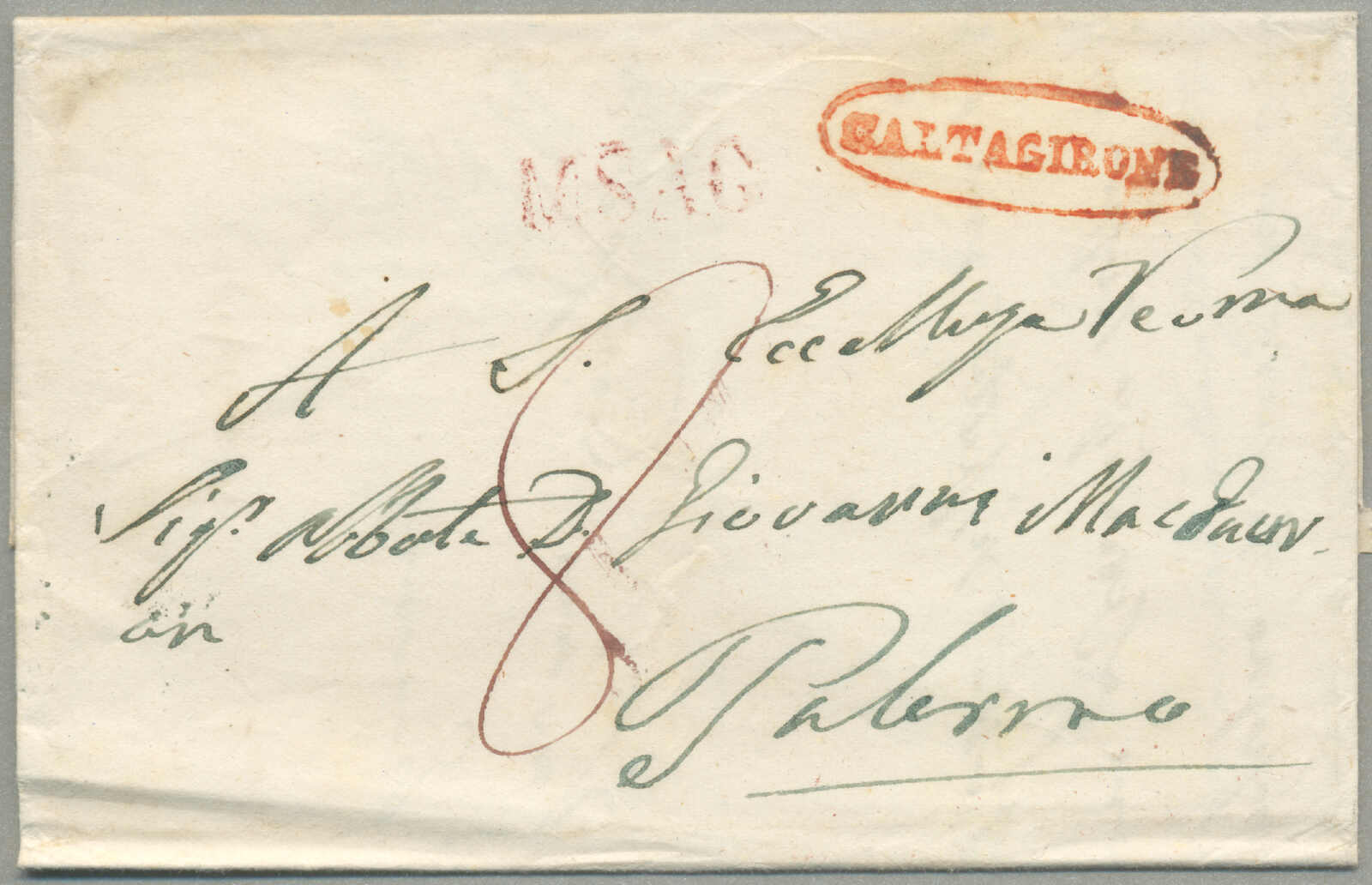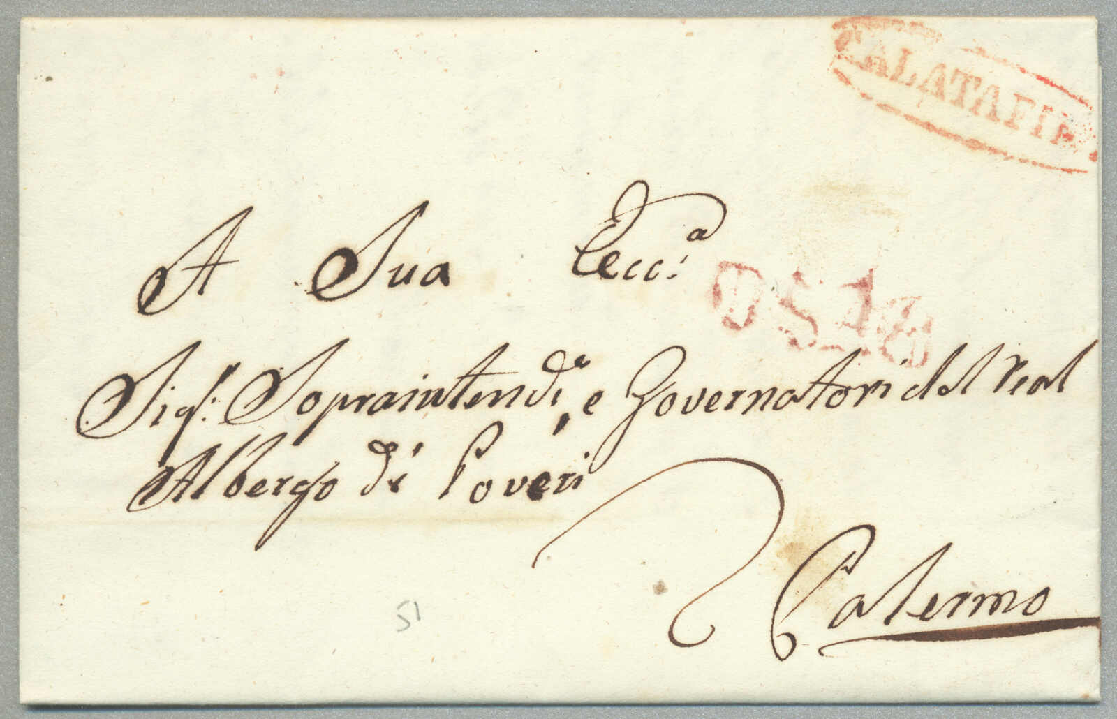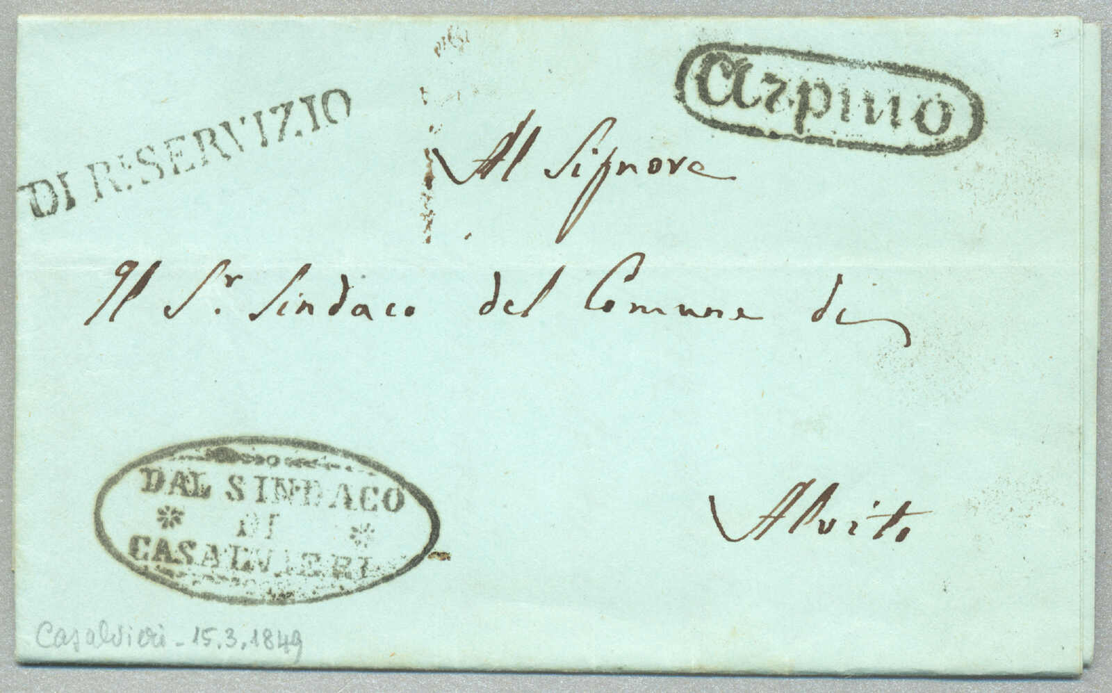 about 1830s, with neatly strike of red AULETTA and red DI RISERVIZIO, on folded letter, ex Provera, XF! Estimate 200€.