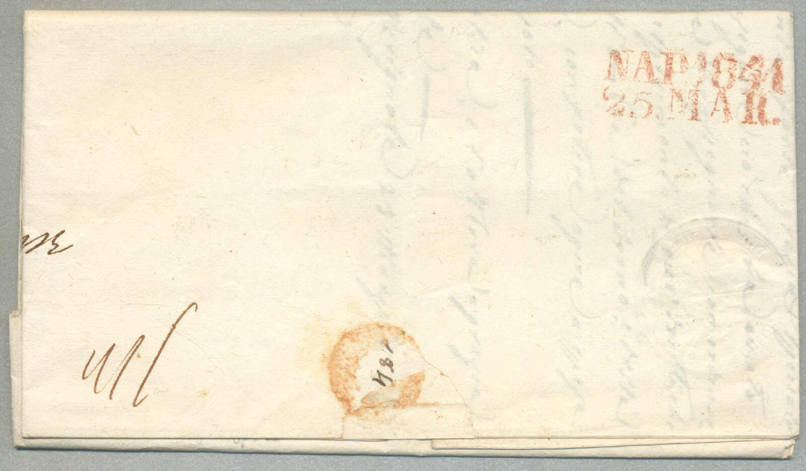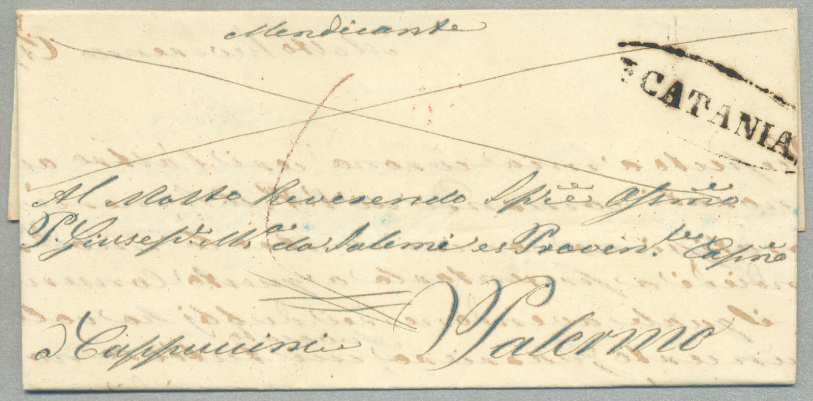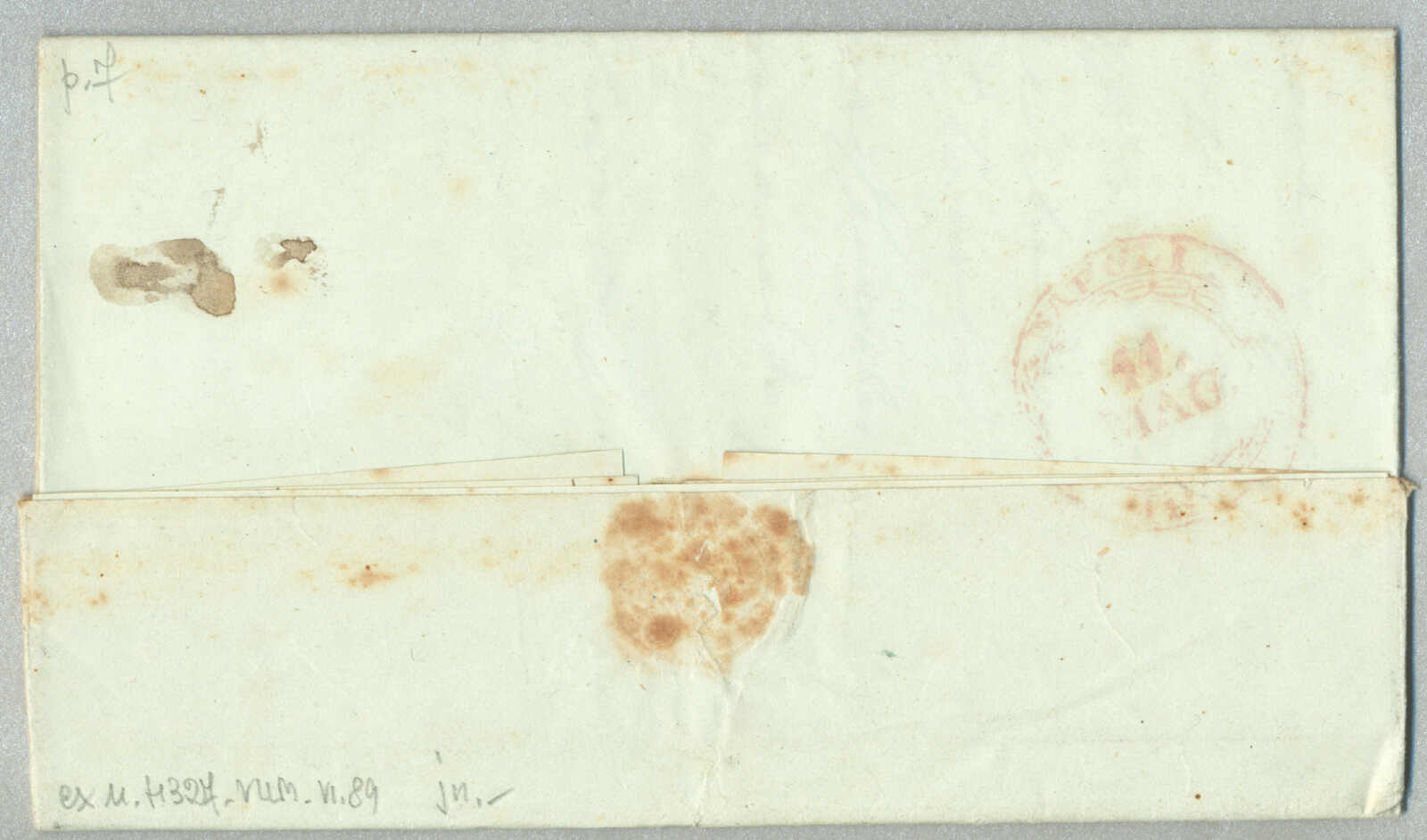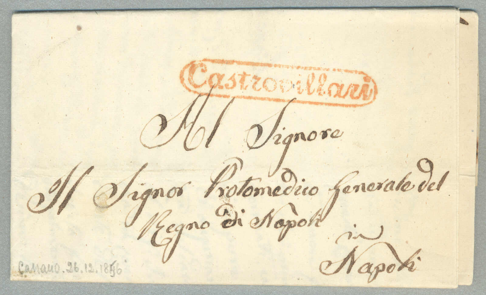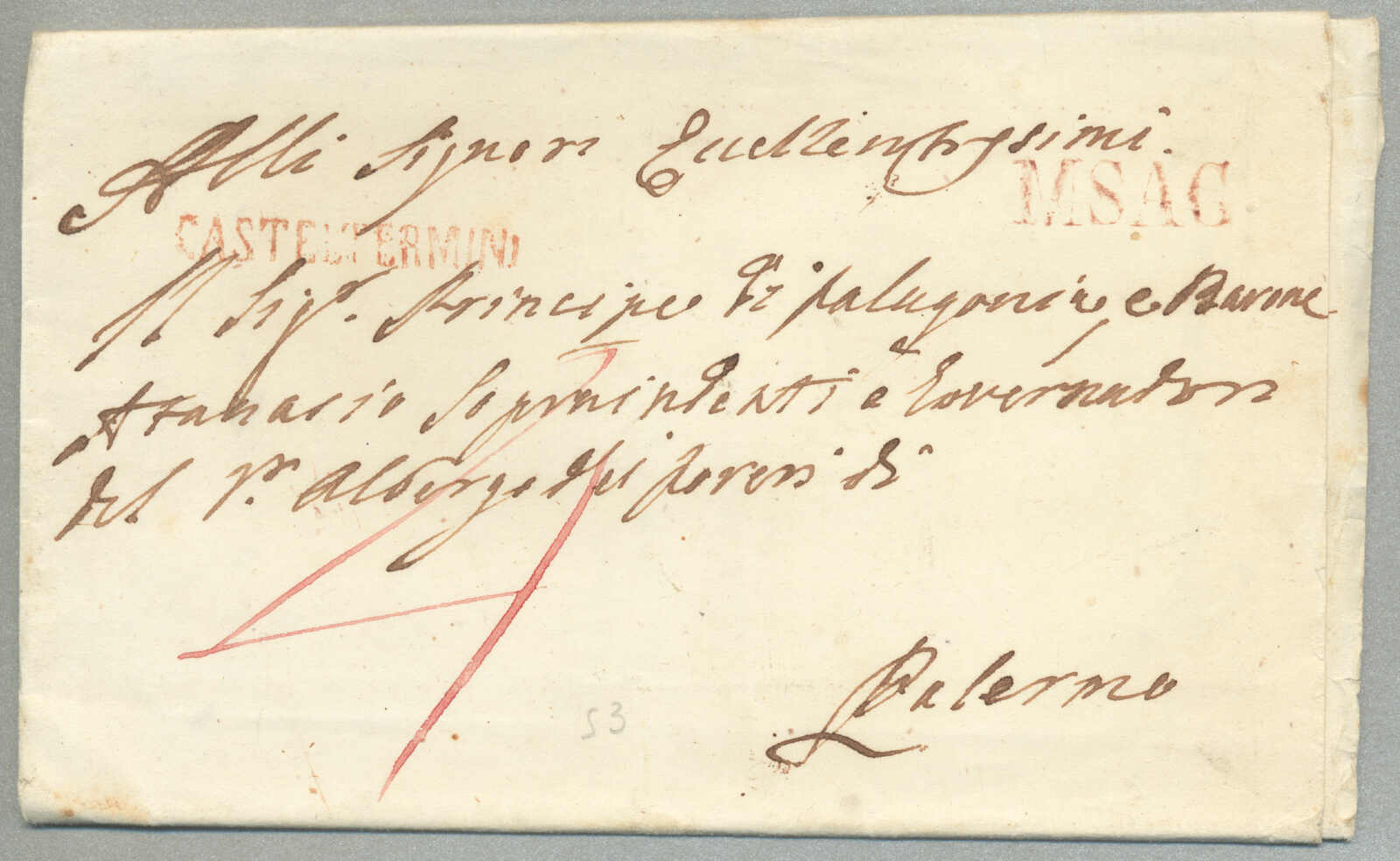 1832, with neatly strike of red CASTELTERMINI also red MSAC, red ink 4 tax remark, on folded letter, ex Provera, XF! Estimate 200€.