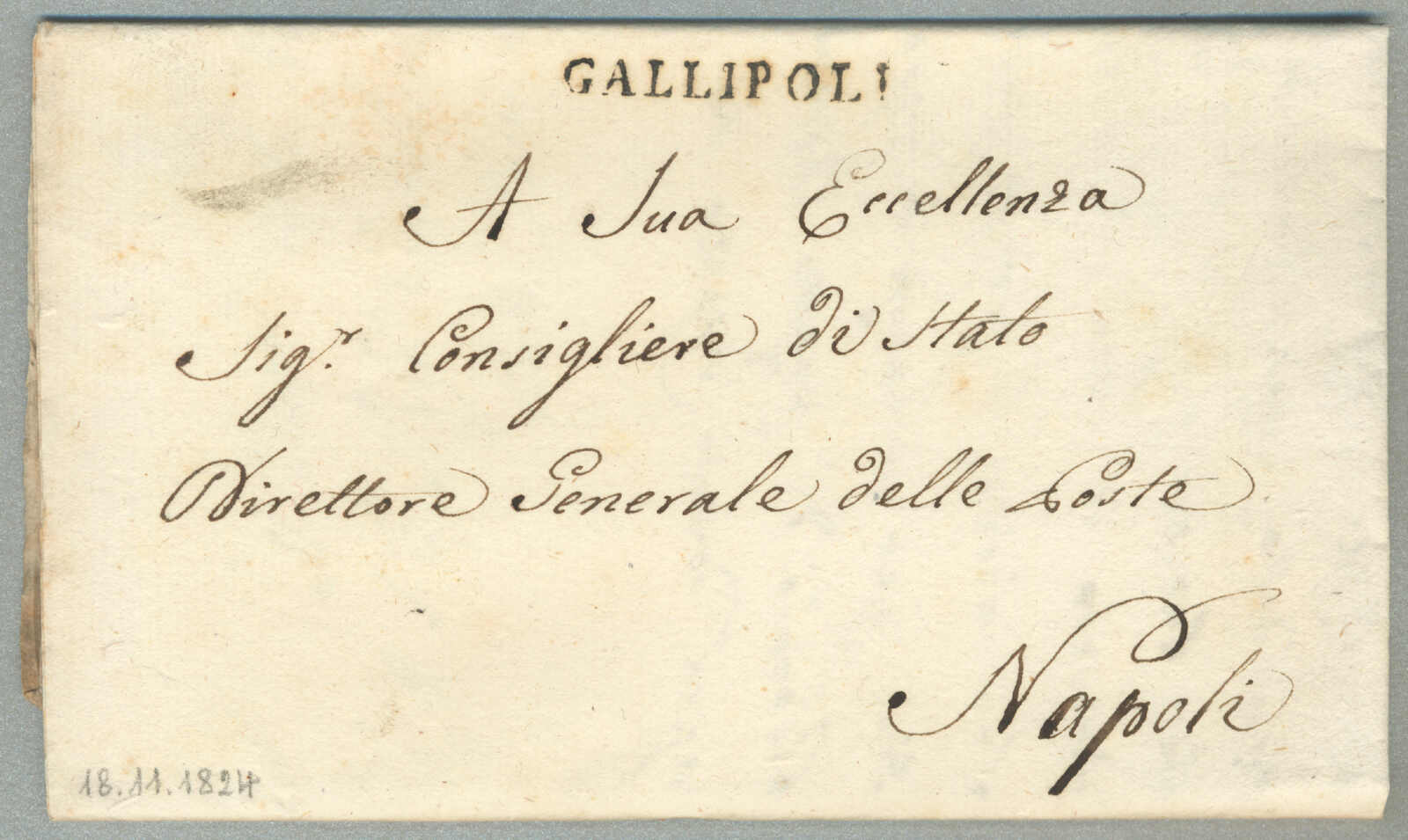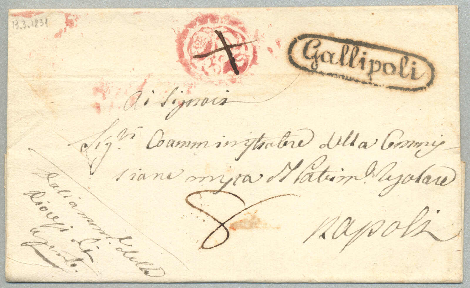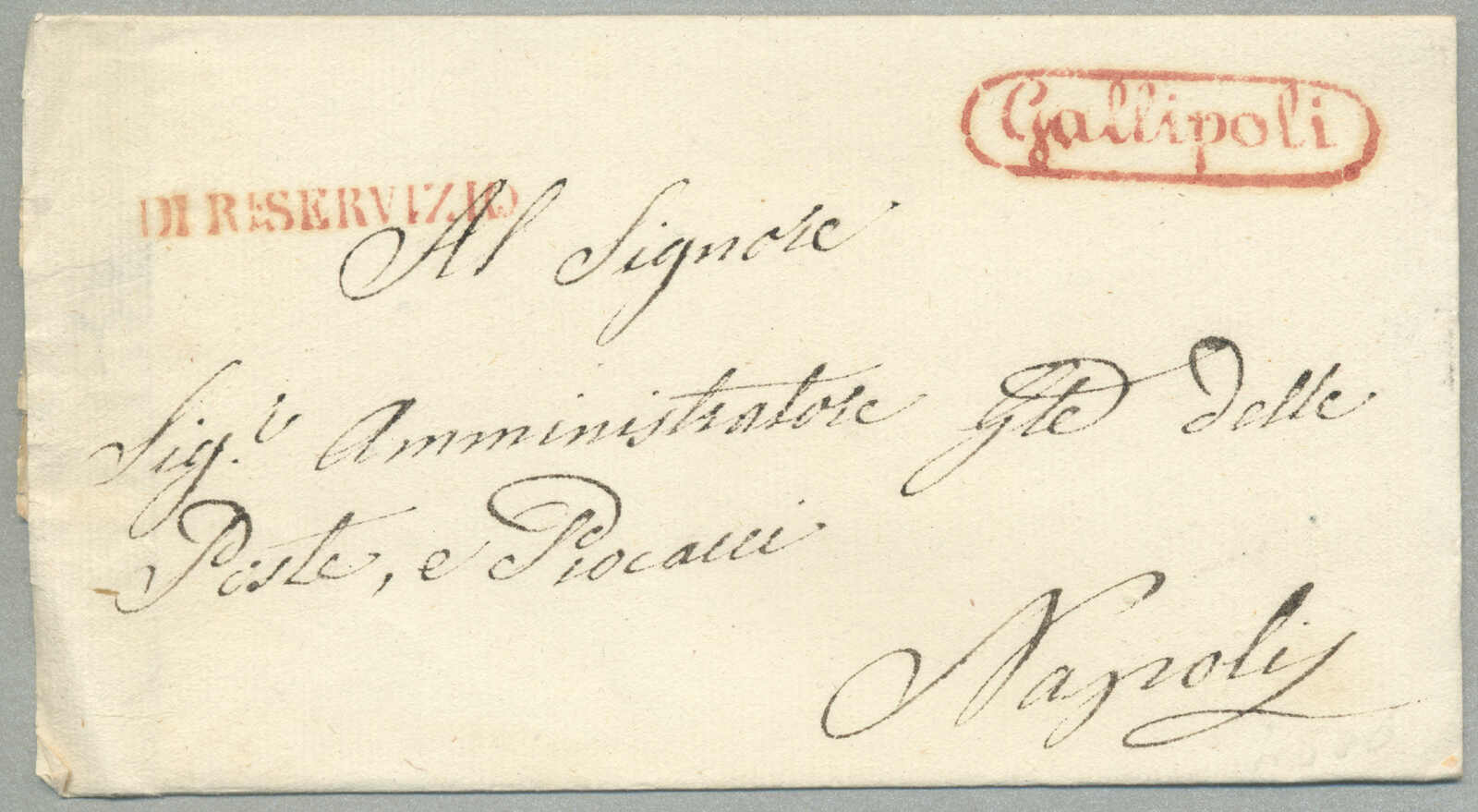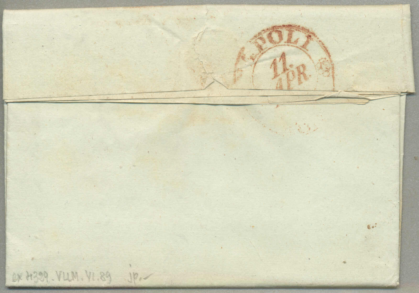 about 1830s, with neatly strike of red GALLIPOLI, on folded letter, ex Provera, XF! Estimate 200€.