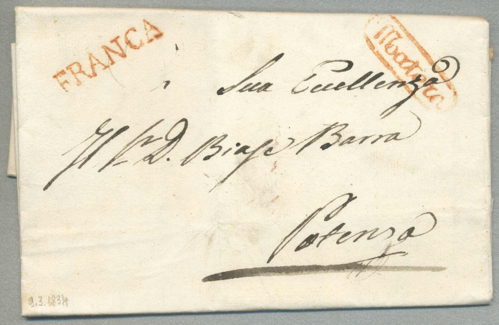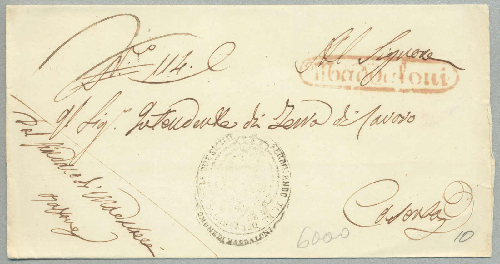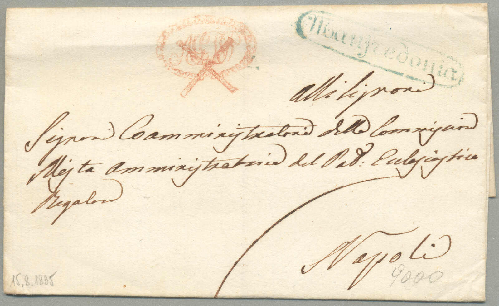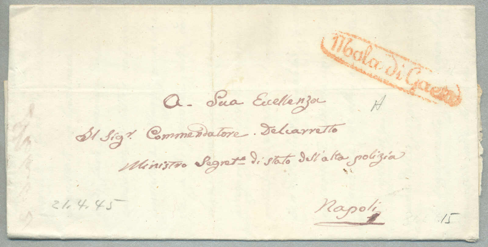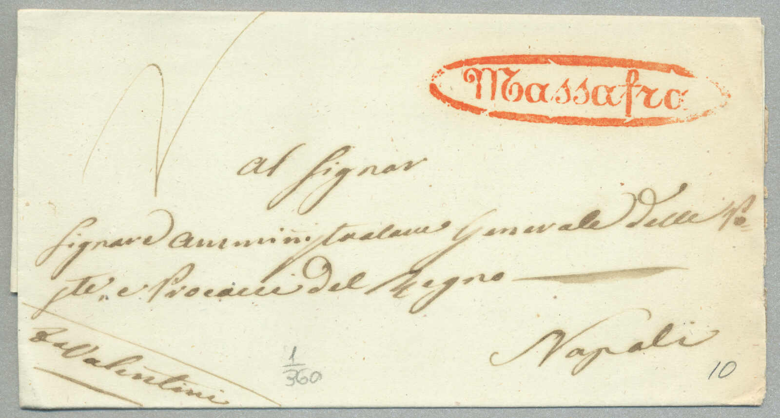 about 1830s, with neatly strike of red MARDALONI, on folded letter, ex Provera, XF! Estimate 200€.