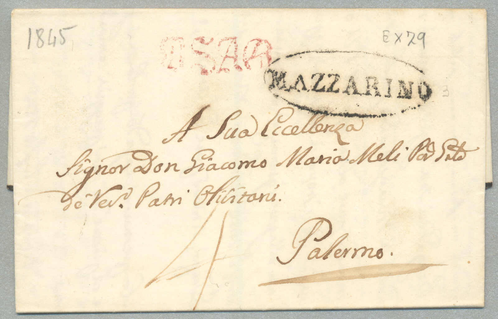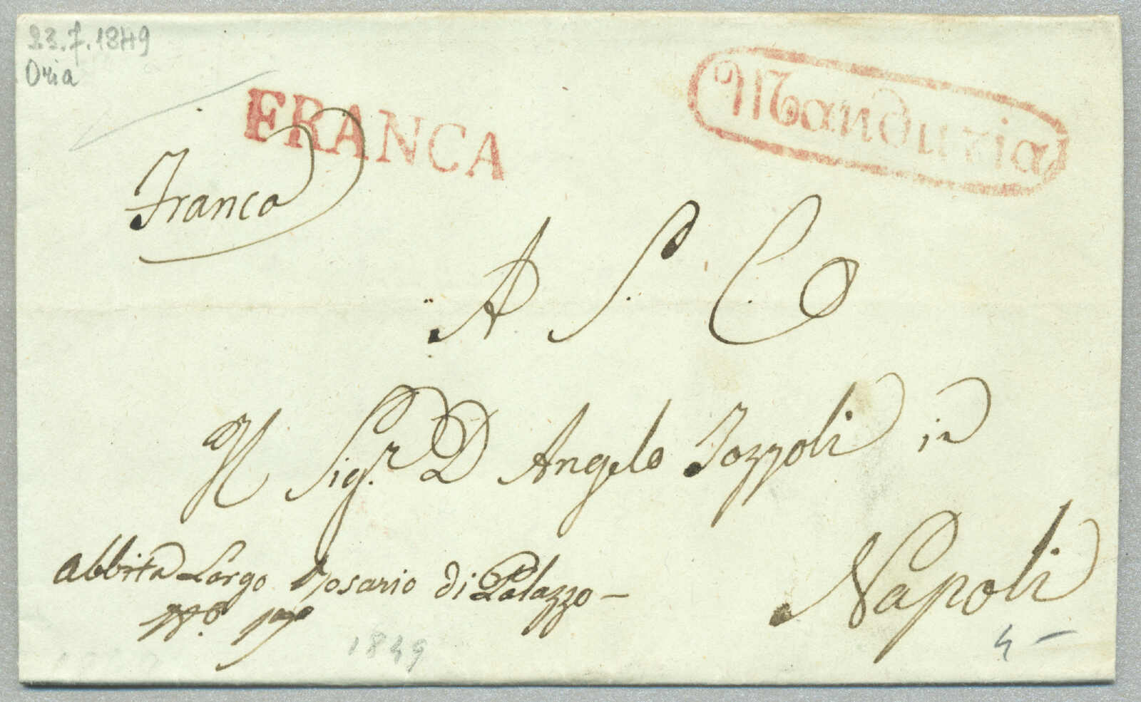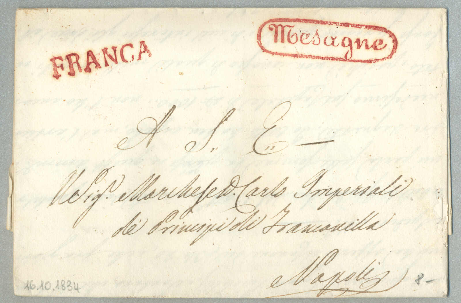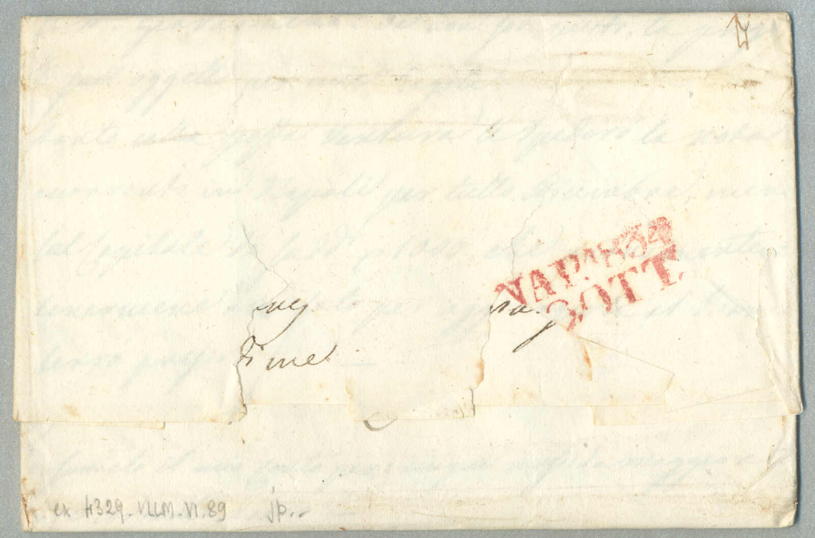 about 1830s, with neatly strike of red MARDALONI, on folded letter, ex Provera, XF! Estimate 200€.
