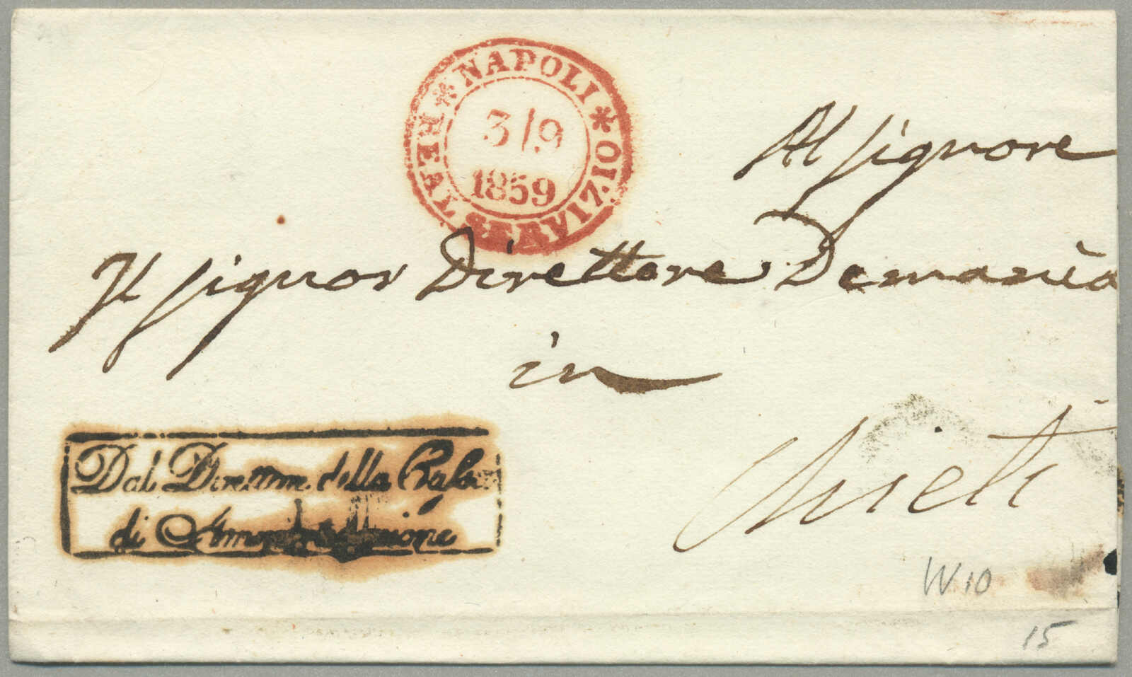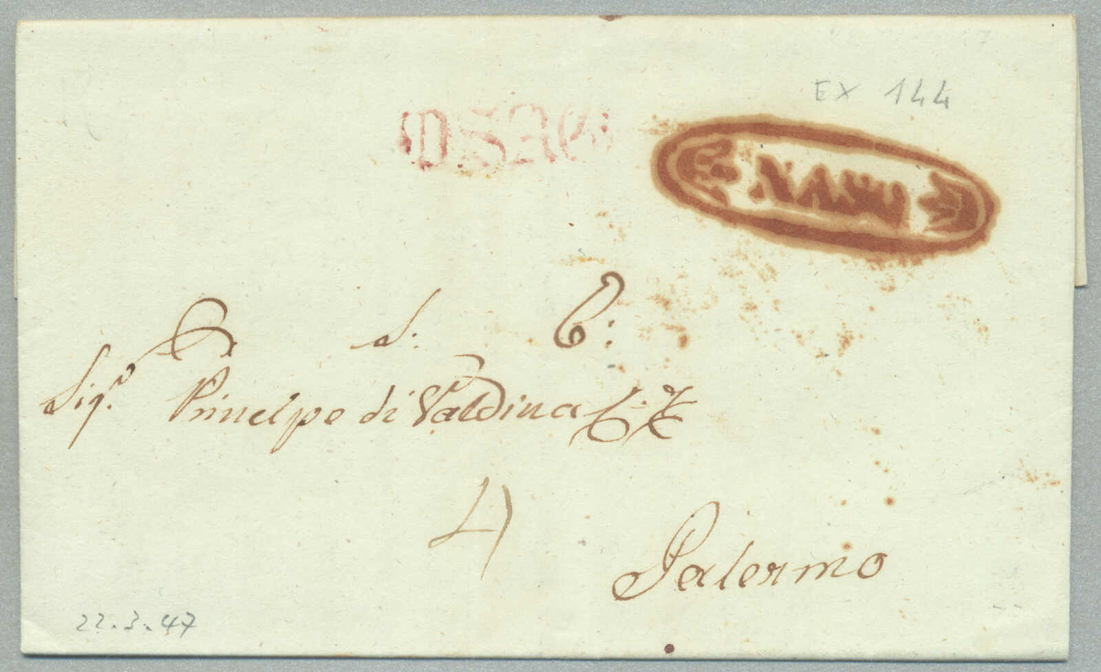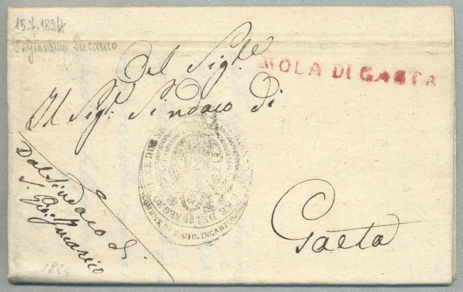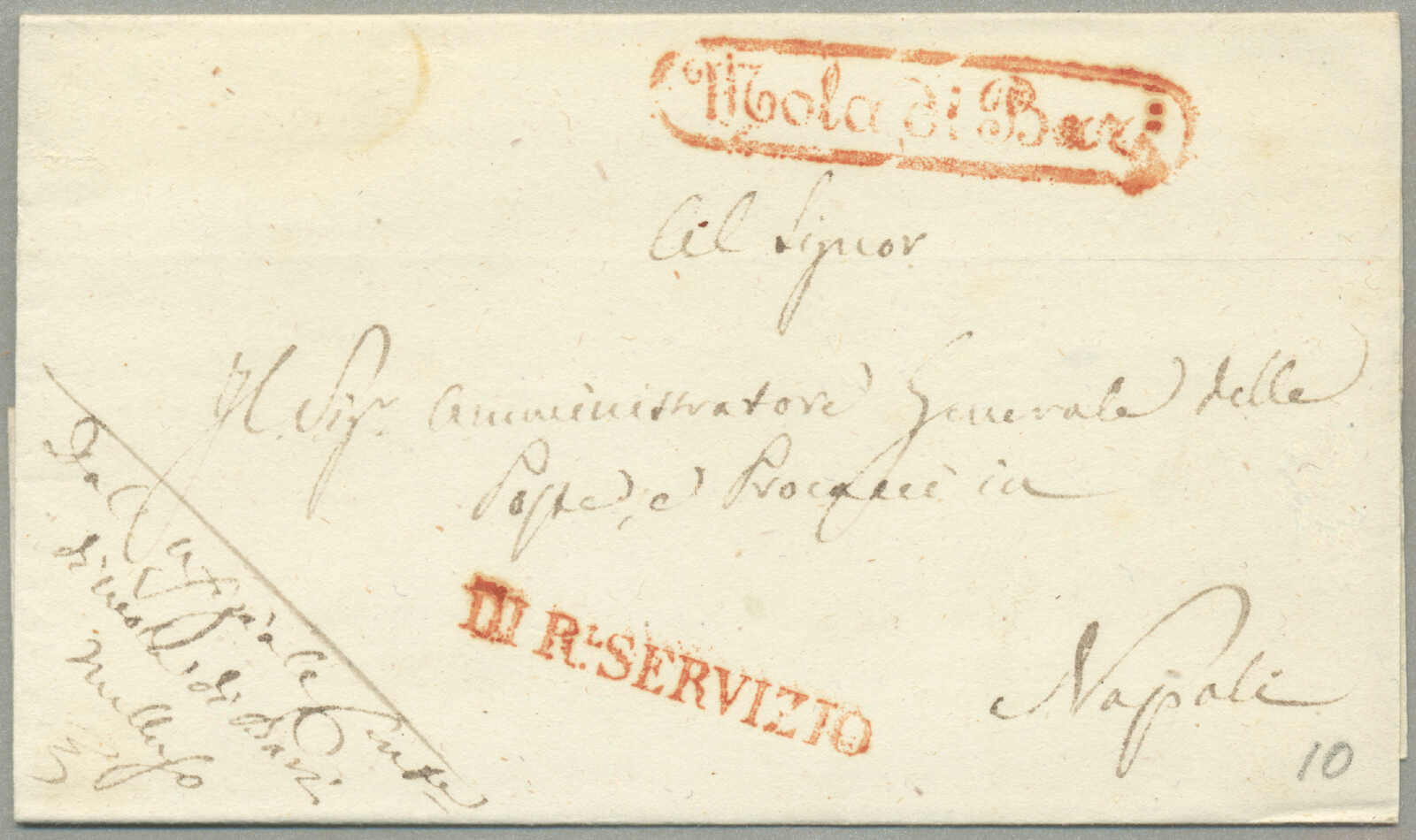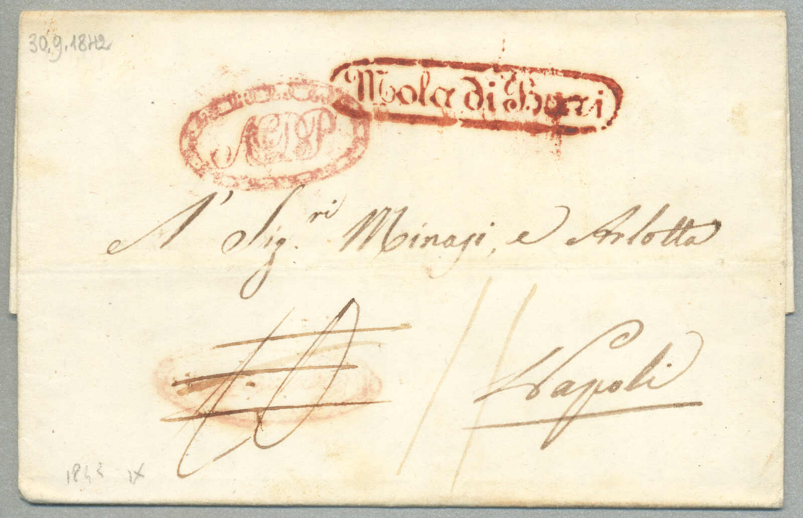 about 1830s, with neatly strike of red MOLA DI BARI, on folded letter, ex Provera, XF! Estimate 200€.