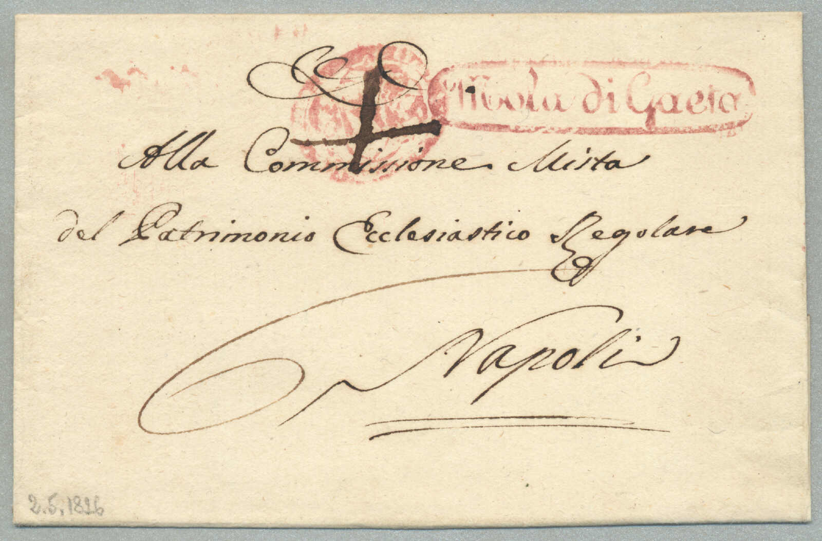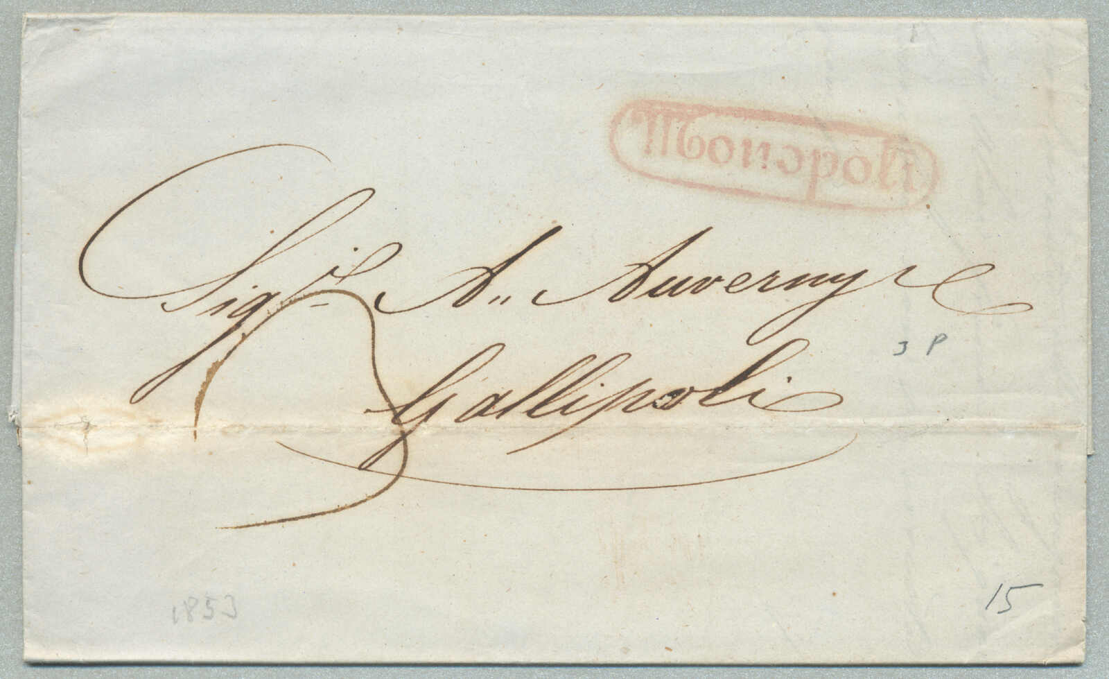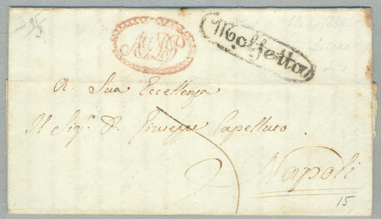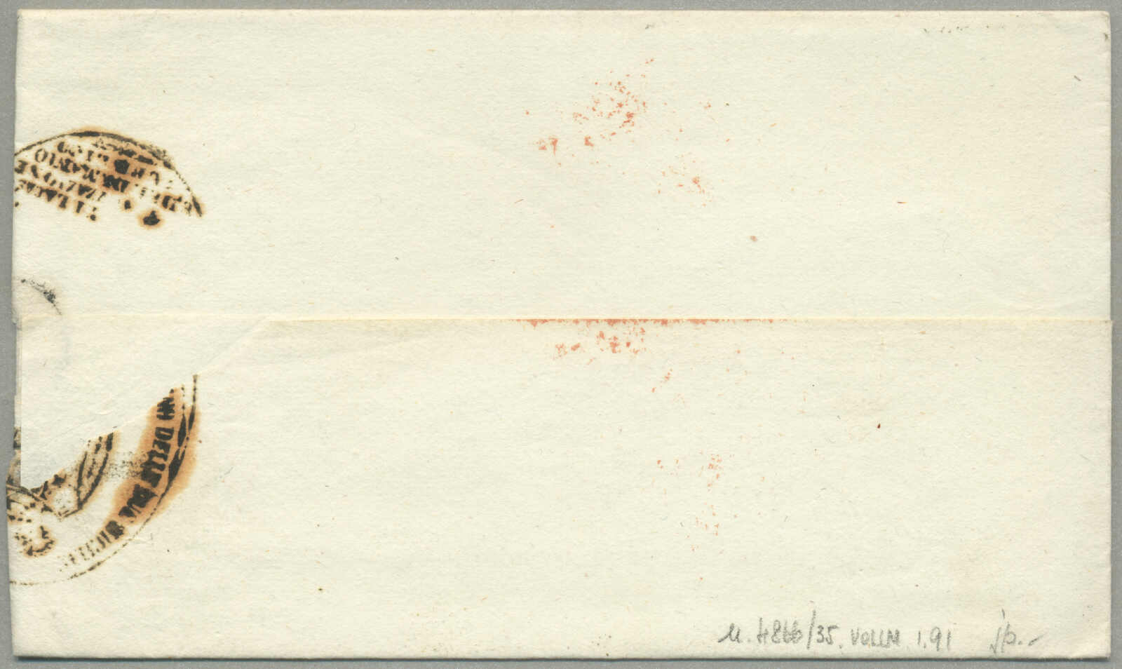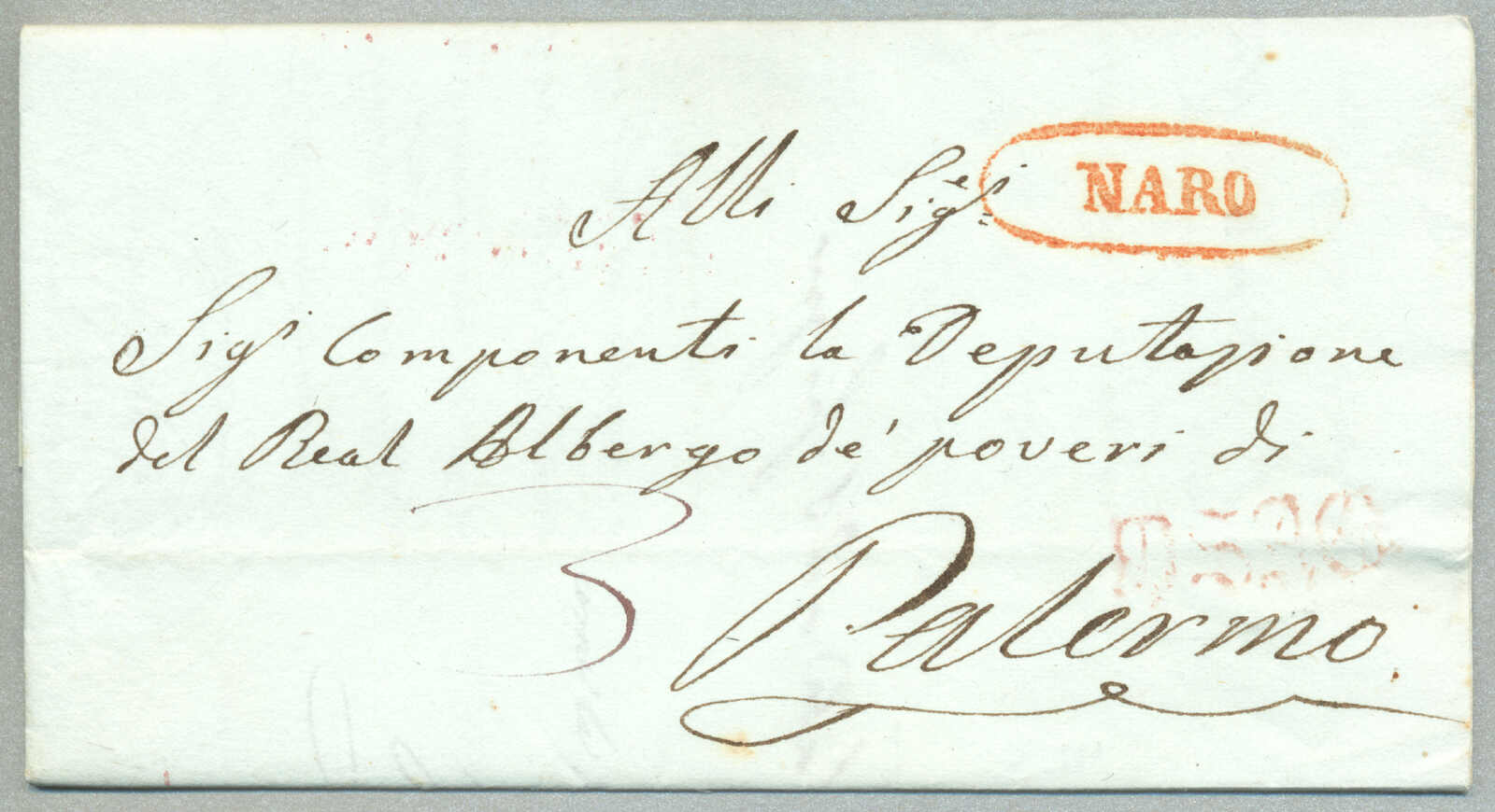 about 1830s, with neatly strike of red MOLA DI BARI, on folded letter, ex Provera, XF! Estimate 200€.