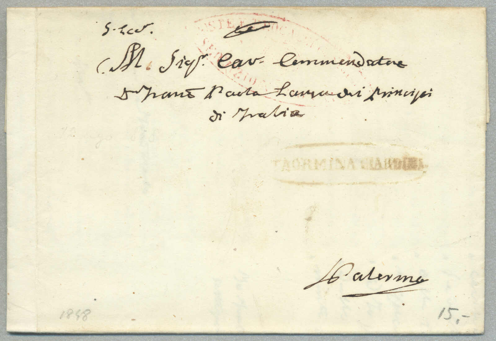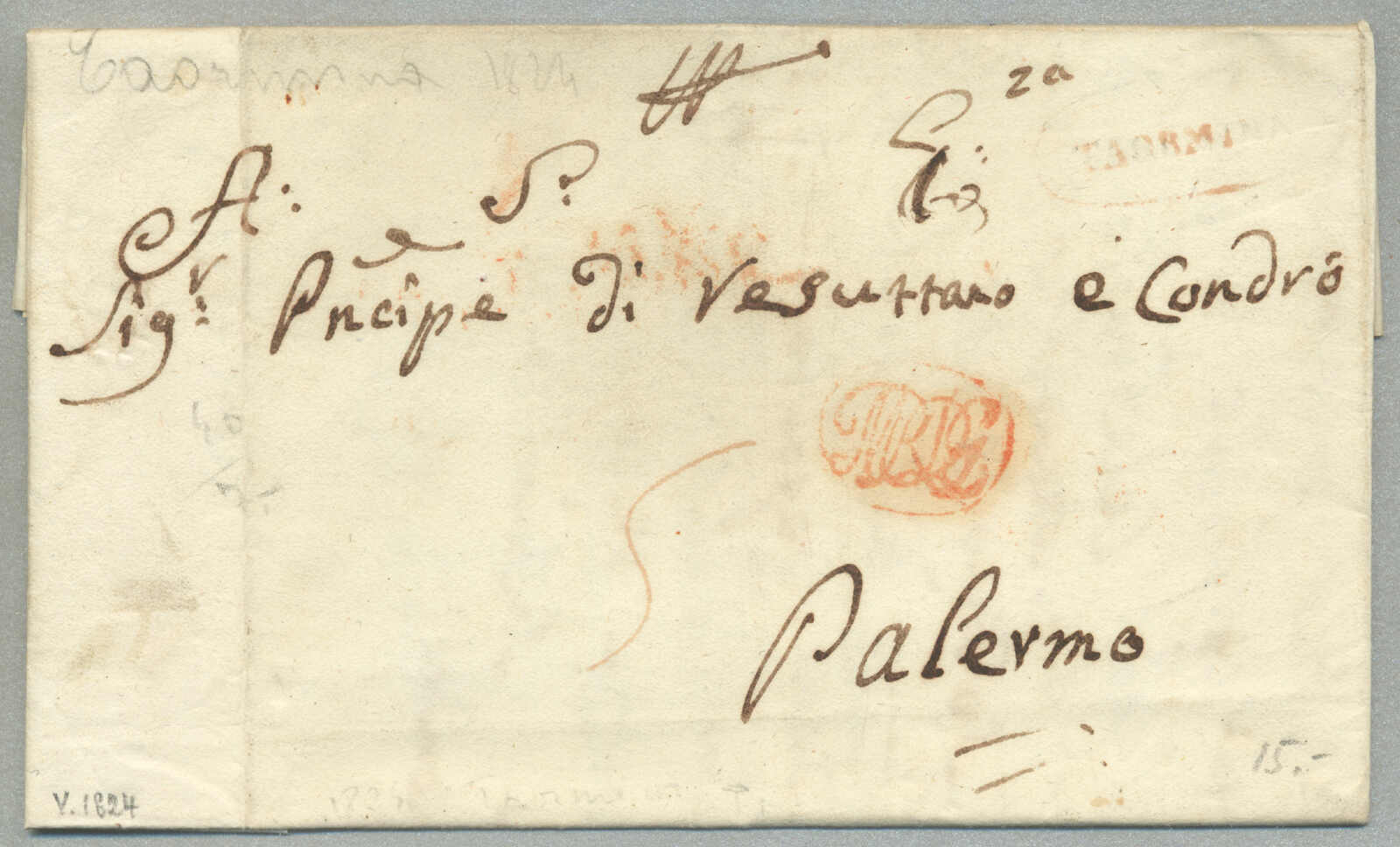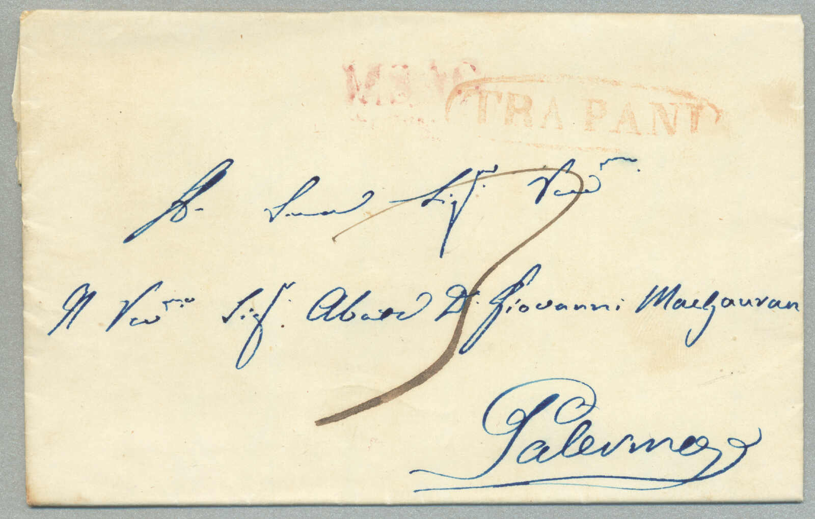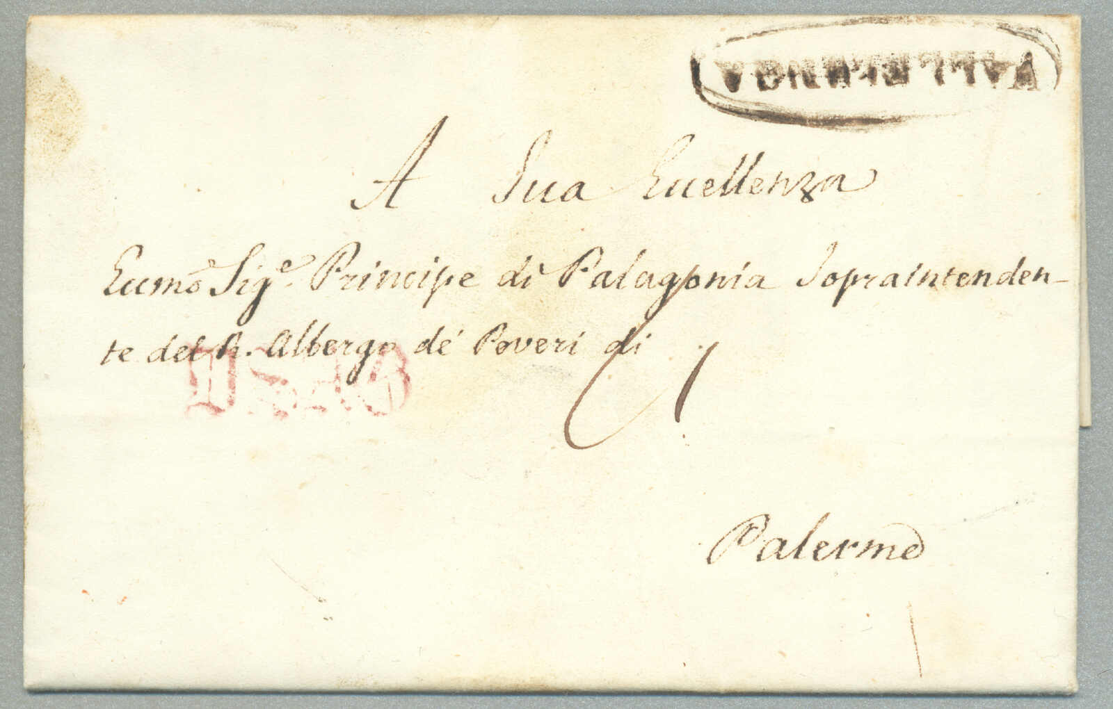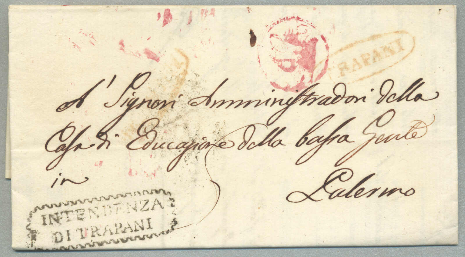 1831, with neatly strike of red TRAPANI and INTENDENZA DI TRAPANI, on folded letter, ex Provera, XF! Estimate 200€.