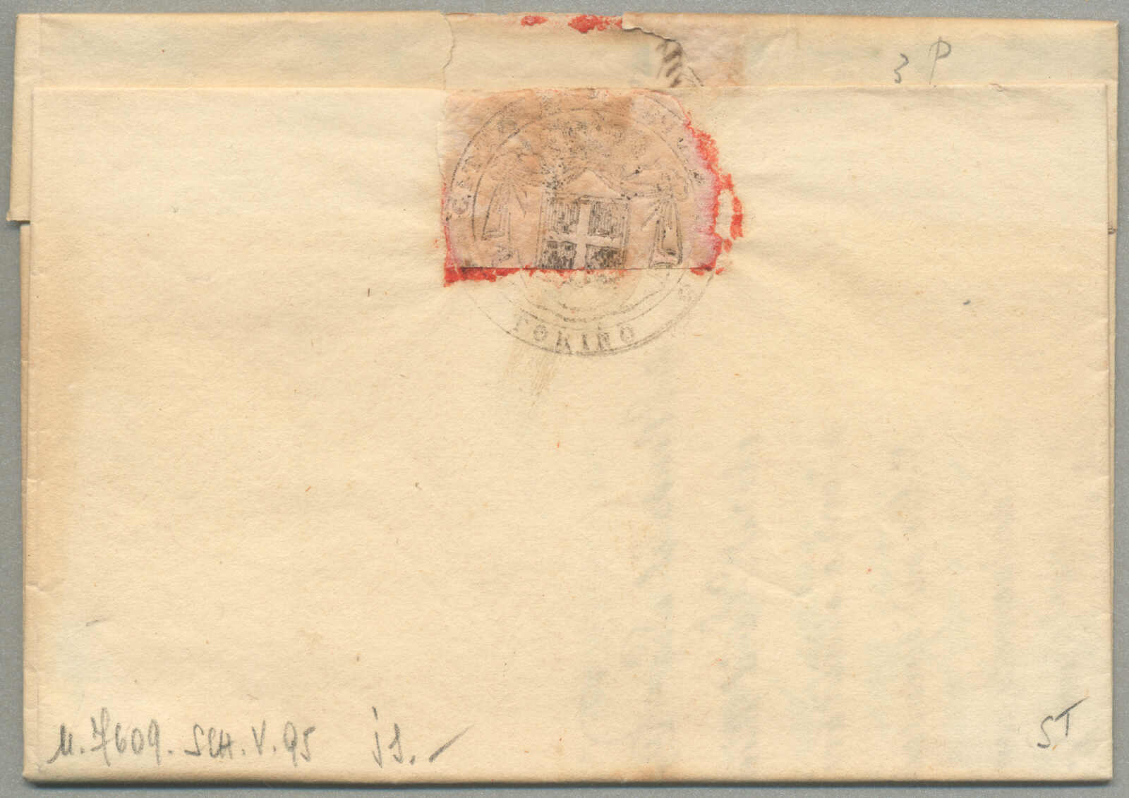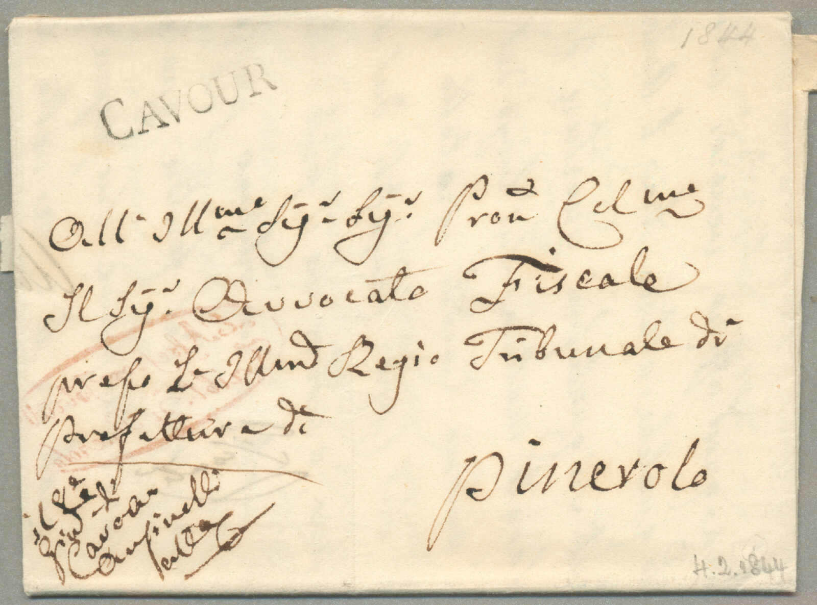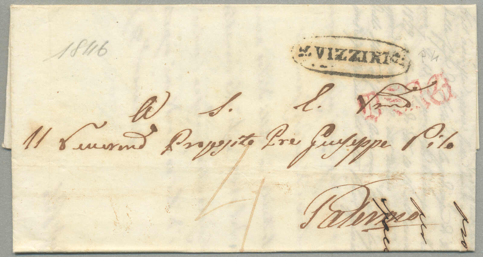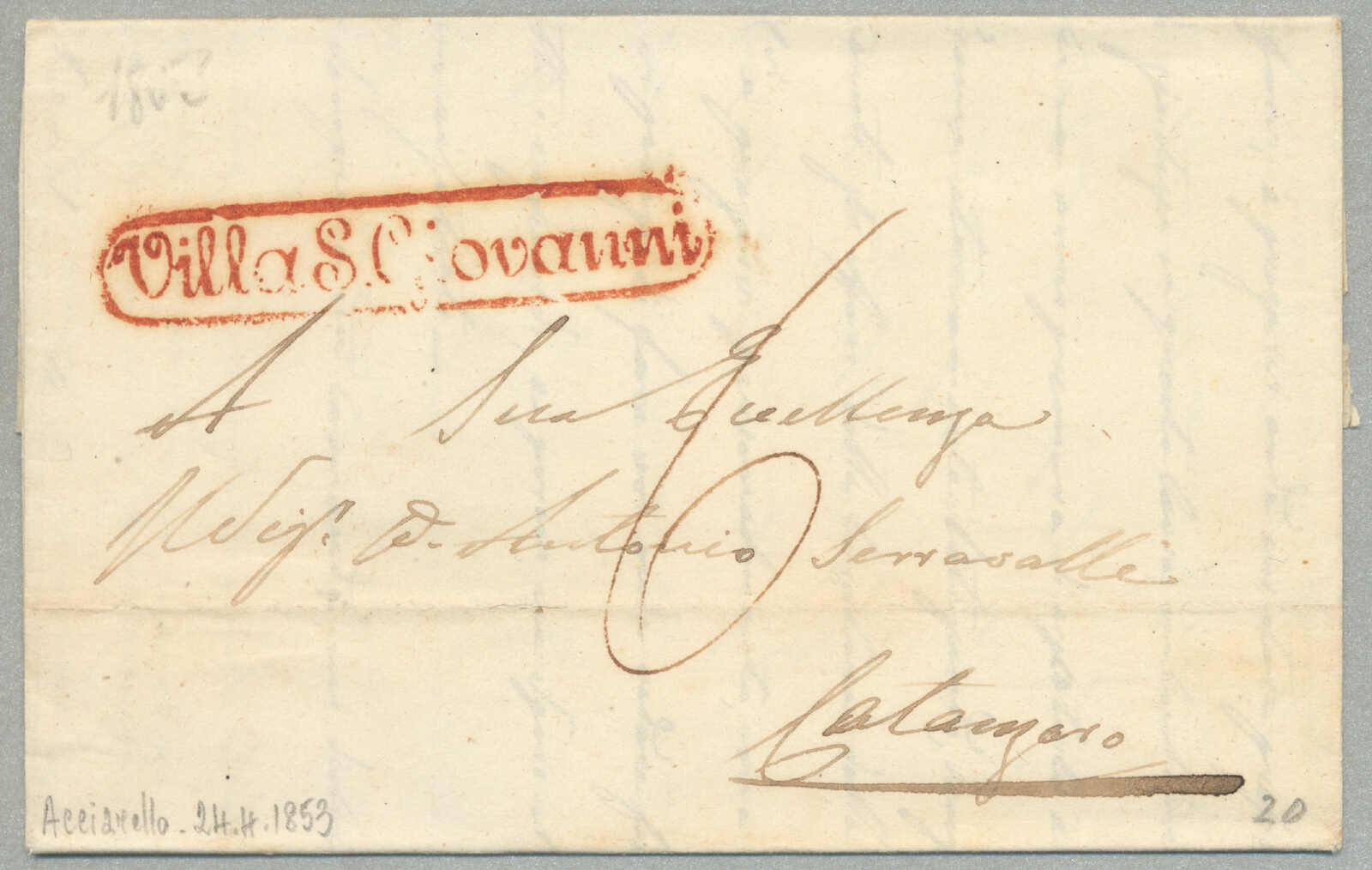 1847, with neatly strike of red VILLA S. GIOVANNI, on folded letter, ex Provera, XF! Estimate 200€.