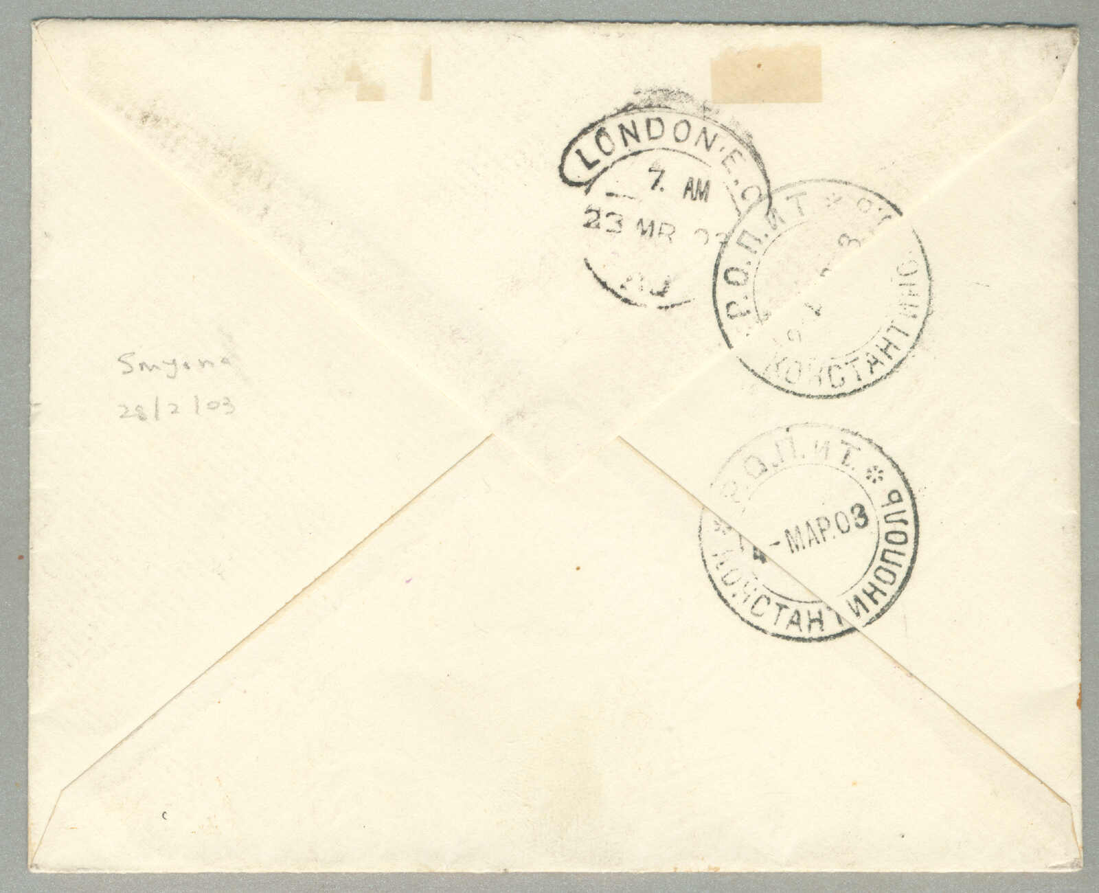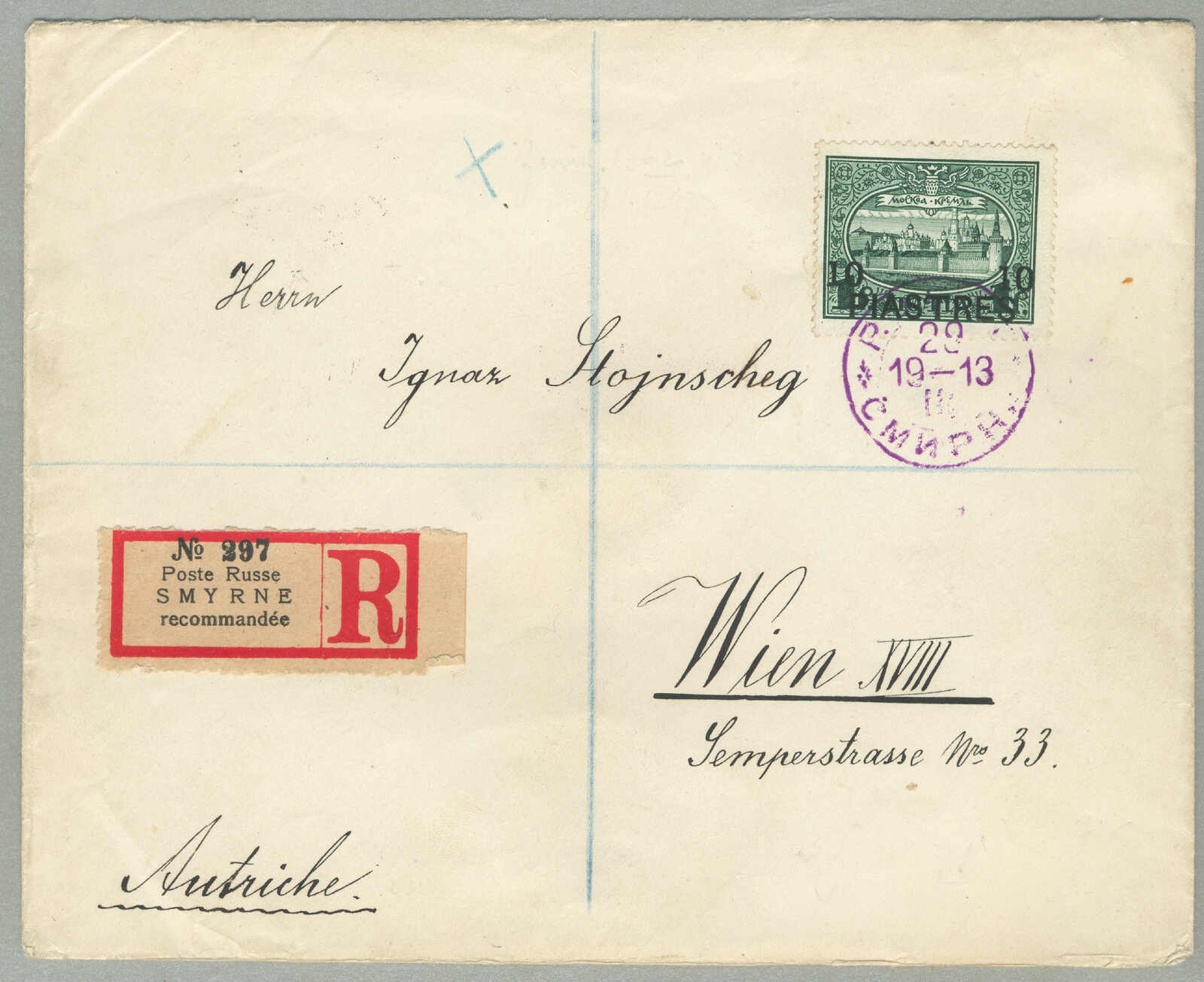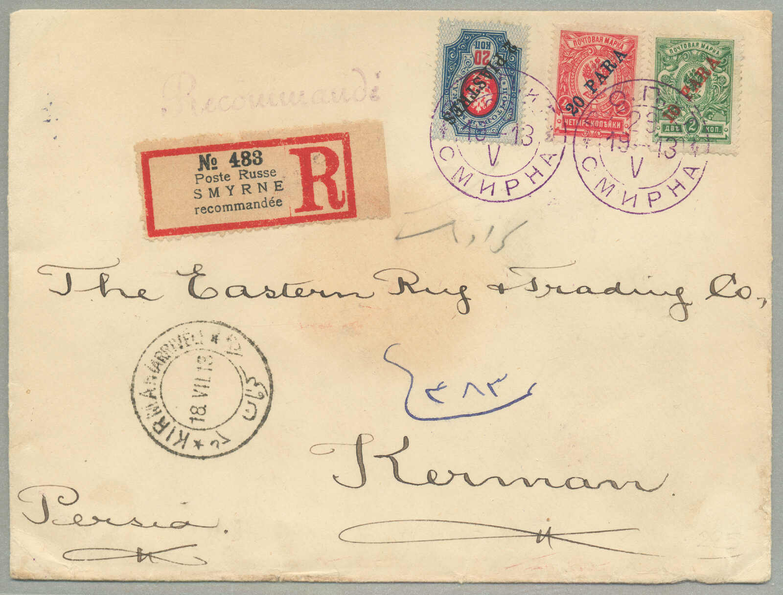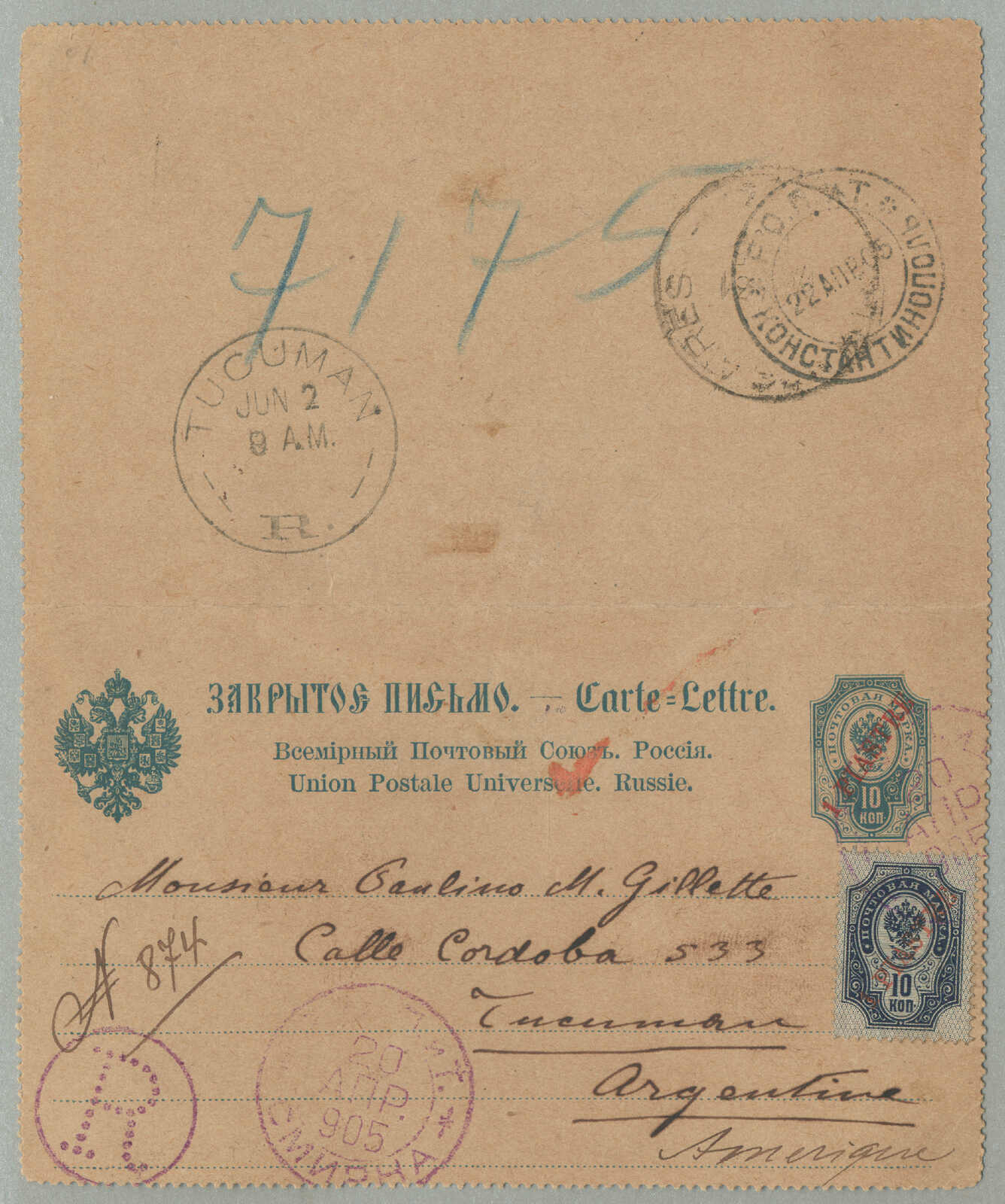 1905, 1pi. on 10 ko., blue, used and imprinted on letter card, from SMIRNE to TUCUMAN, Argentina, canceled with blue cds, Dotted R registered handstamp aside, script pencil no 874, reverse transfers CONSTANTINOPLE, ODESSA,