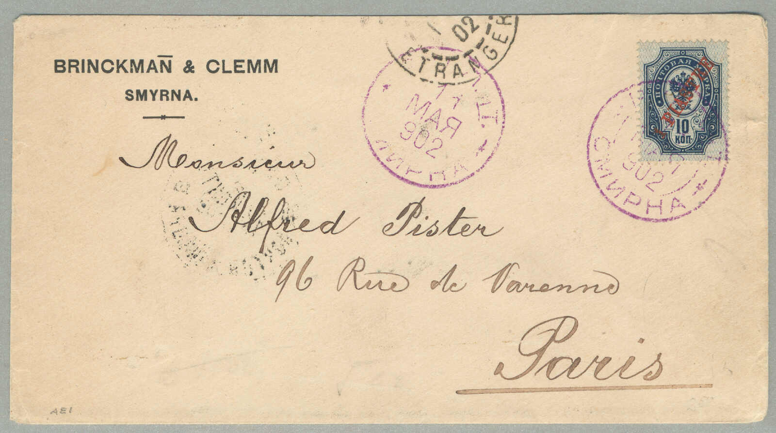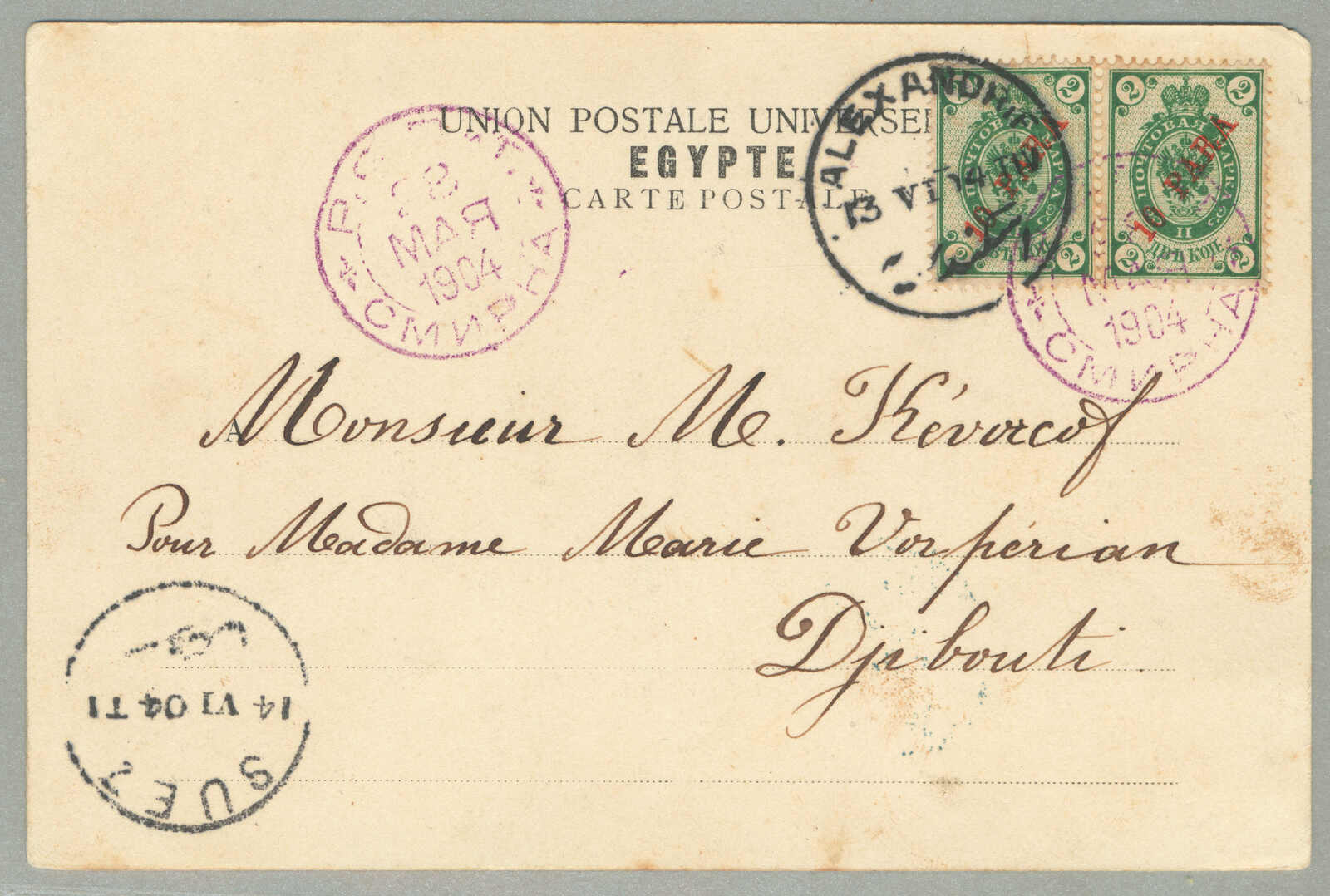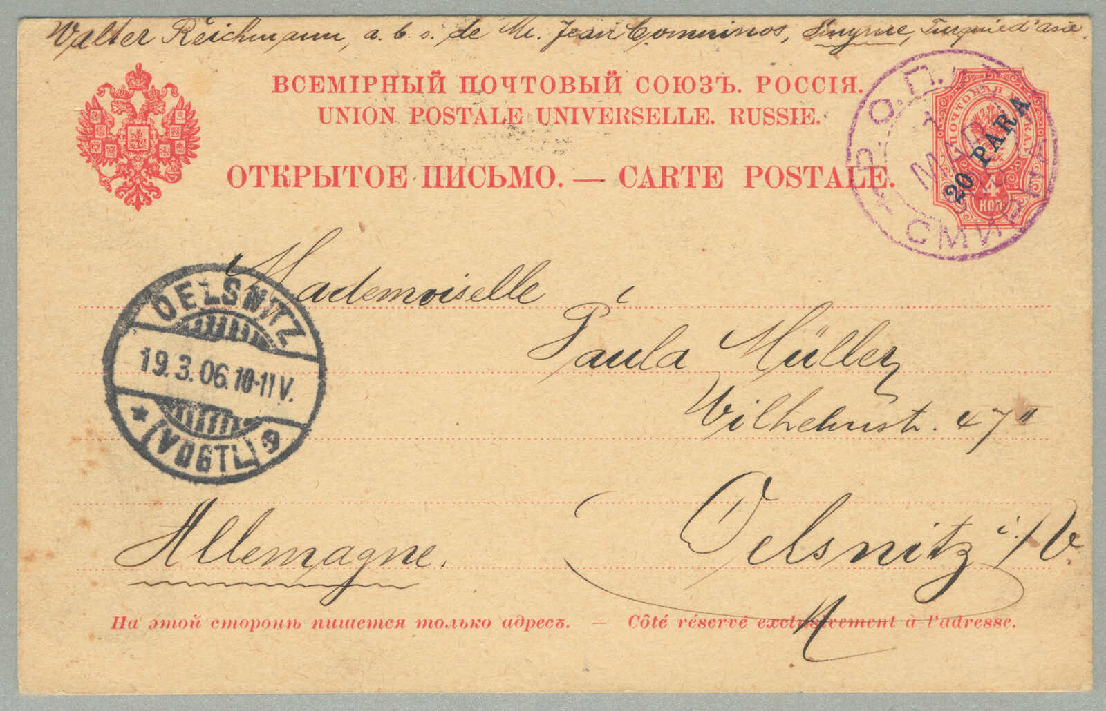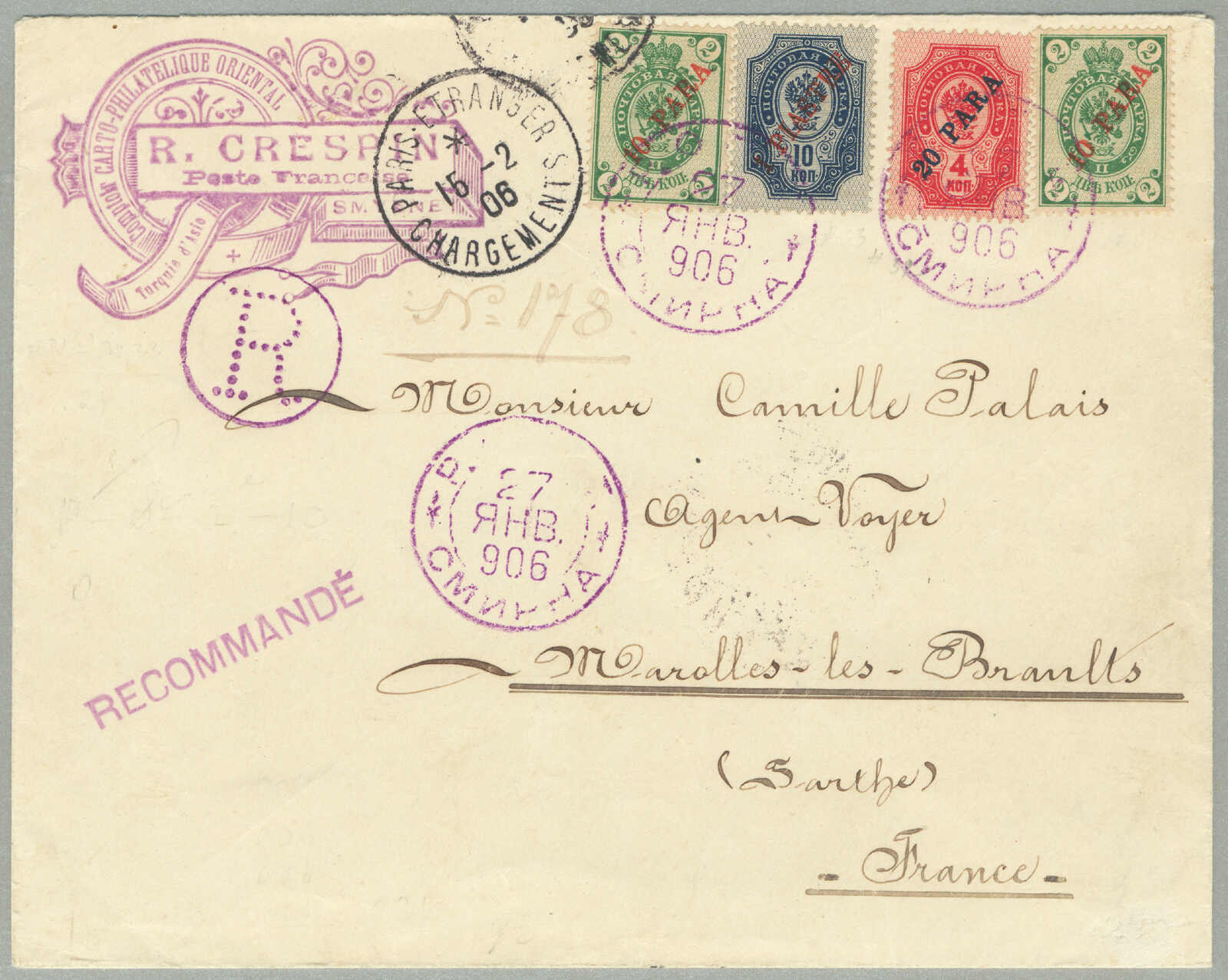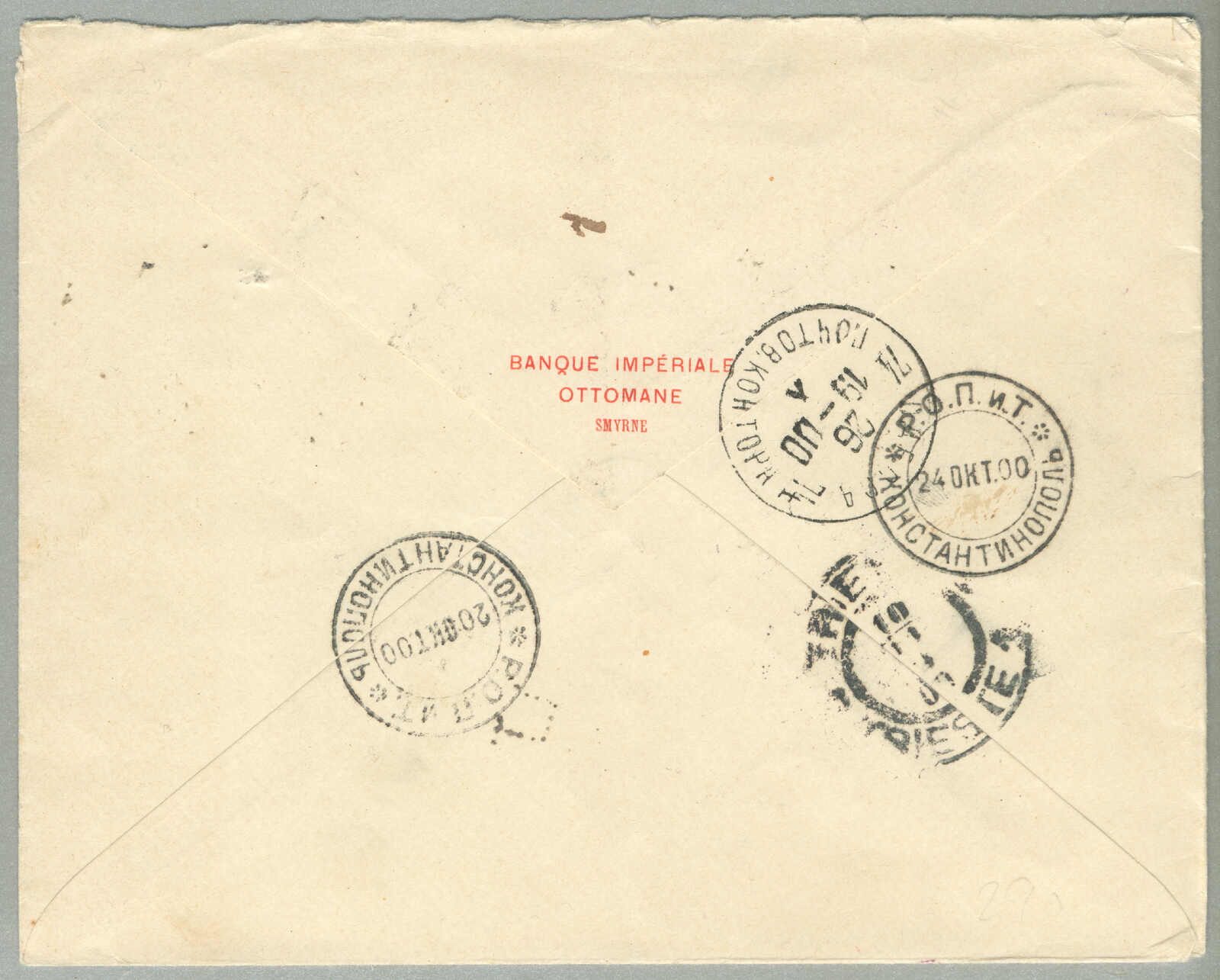 1905, 1pi. on 10 ko., blue, used and imprinted on letter card, from SMIRNE to TUCUMAN, Argentina, canceled with blue cds, Dotted R registered handstamp aside, script pencil no 874, reverse transfers CONSTANTINOPLE, ODESSA,