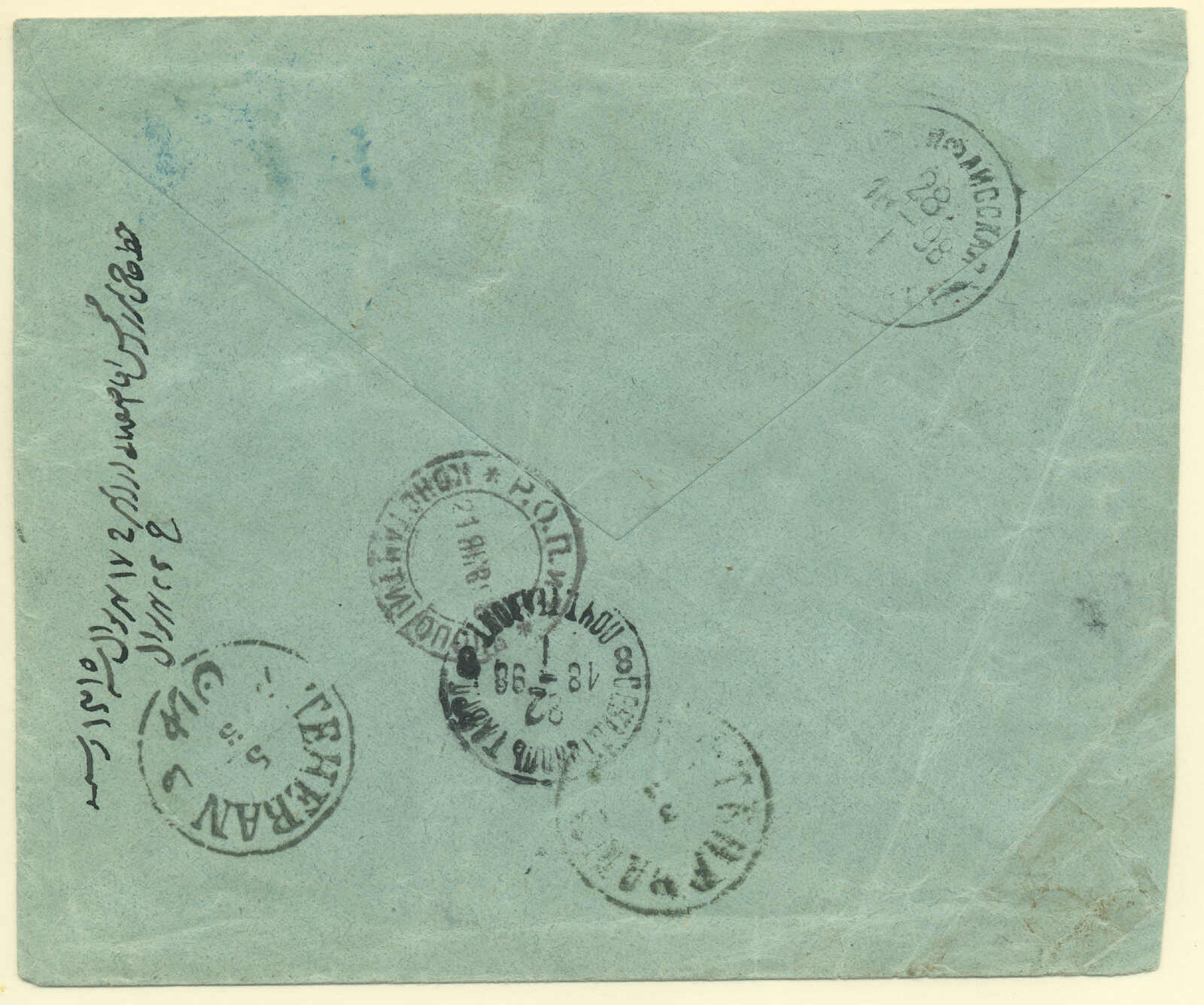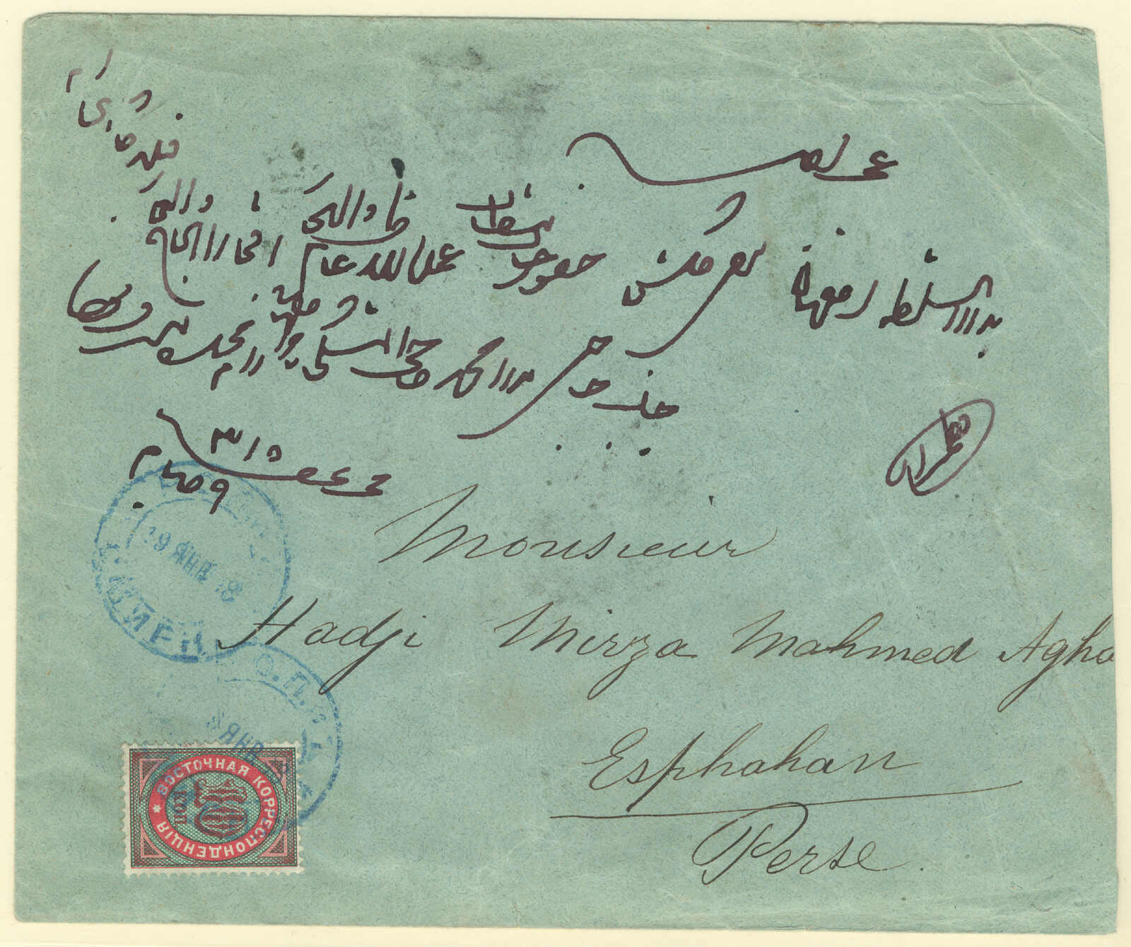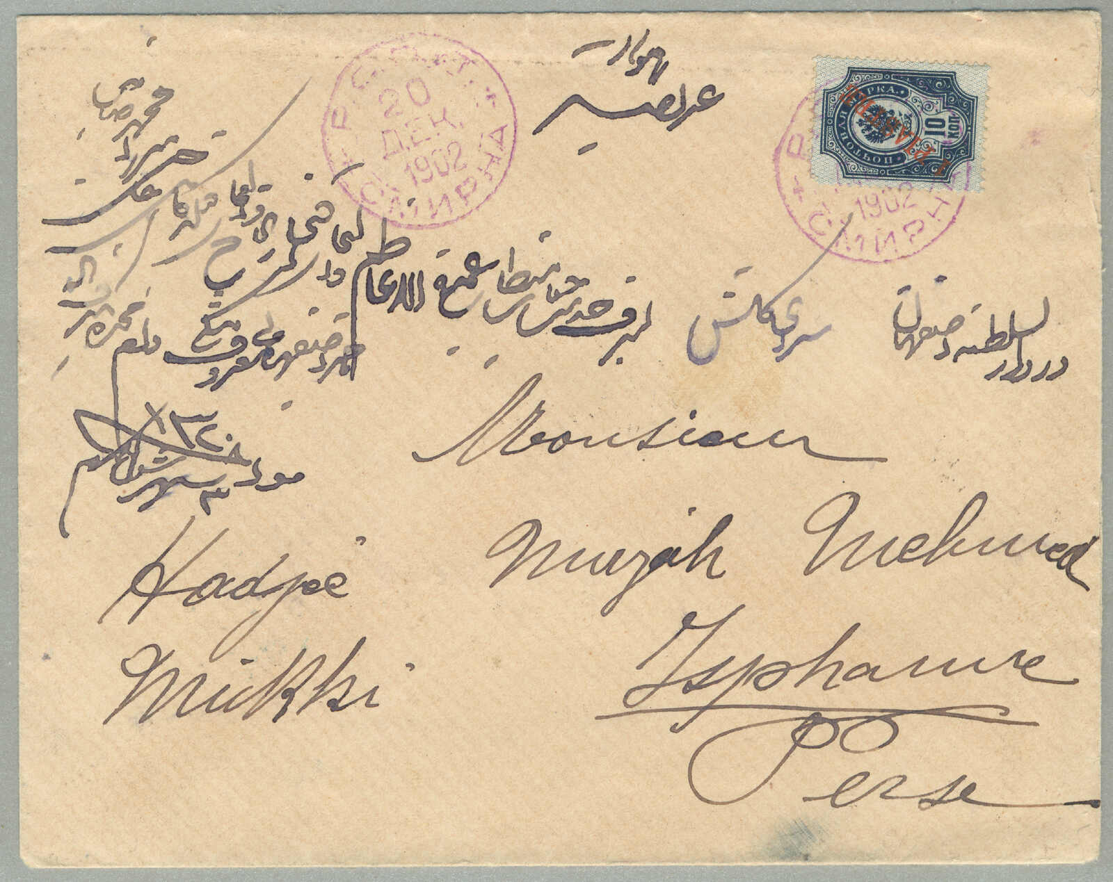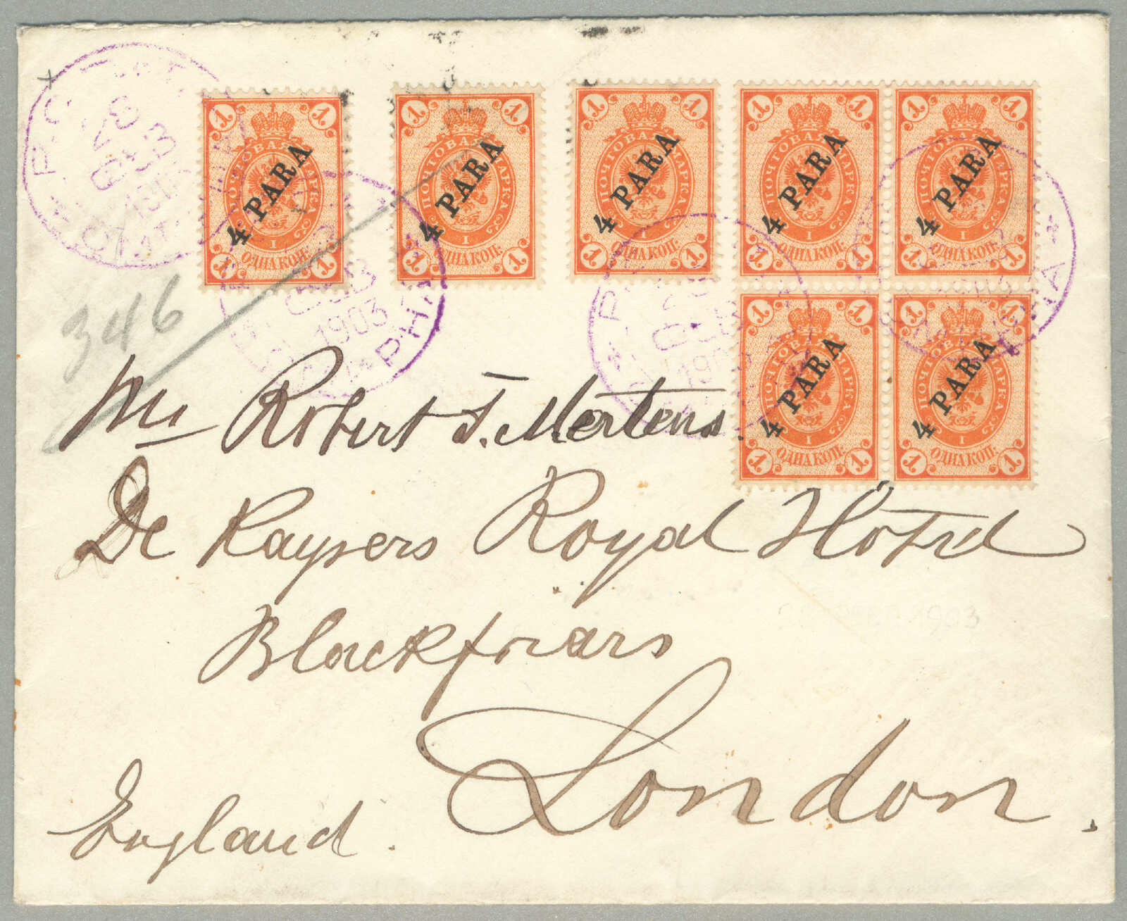 Argentinien, gestempelt mit blauem Kreisdatumsstempel, punktierter R Einschreibestempel beiseite, Schrift Bleistift nein 874, rückseitig schreibt um Konstantinopel, ODESSA, BUENOS AIRES und Ankunft TUCUMAN, interessant und gesucht, Pracht!