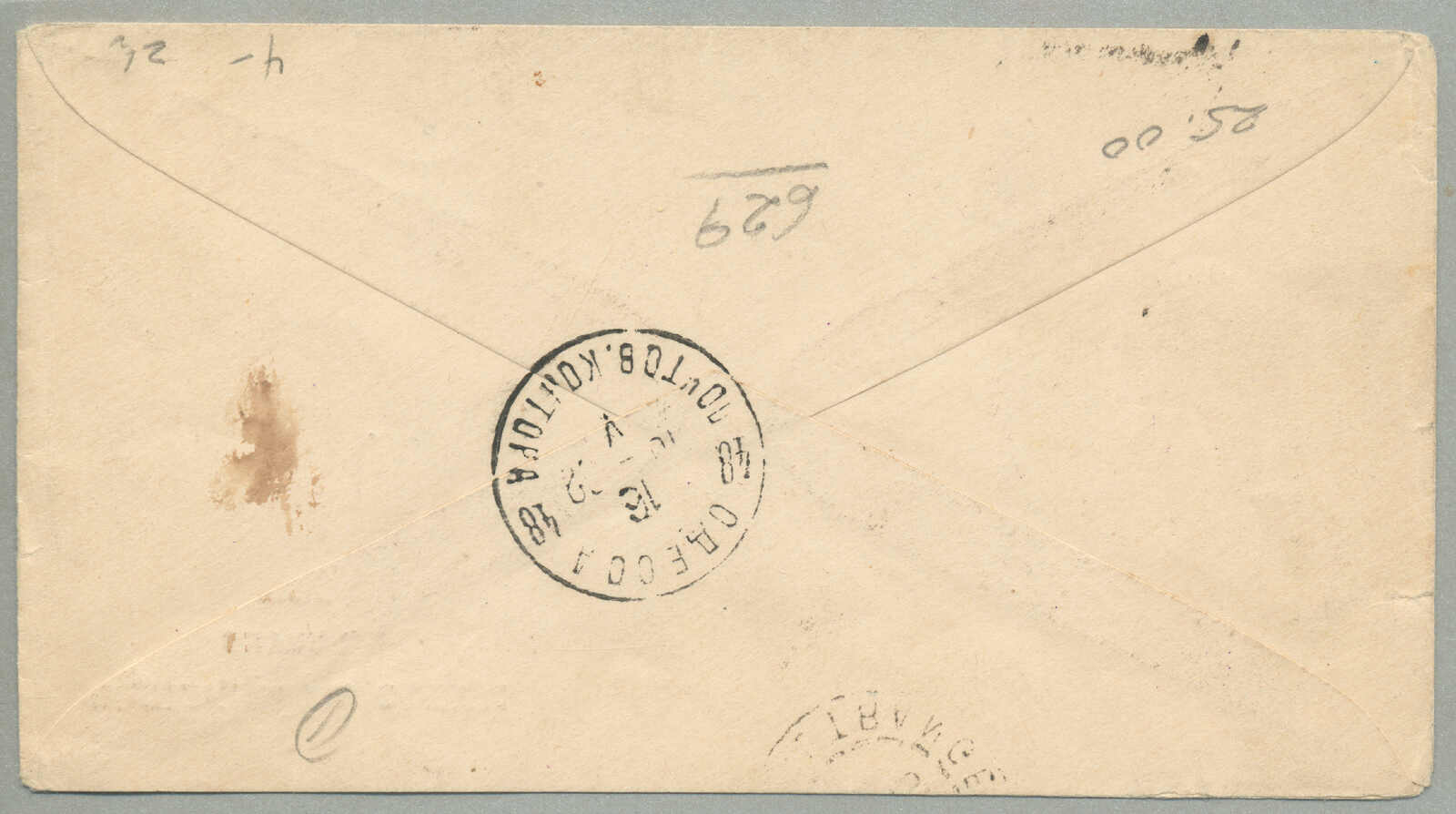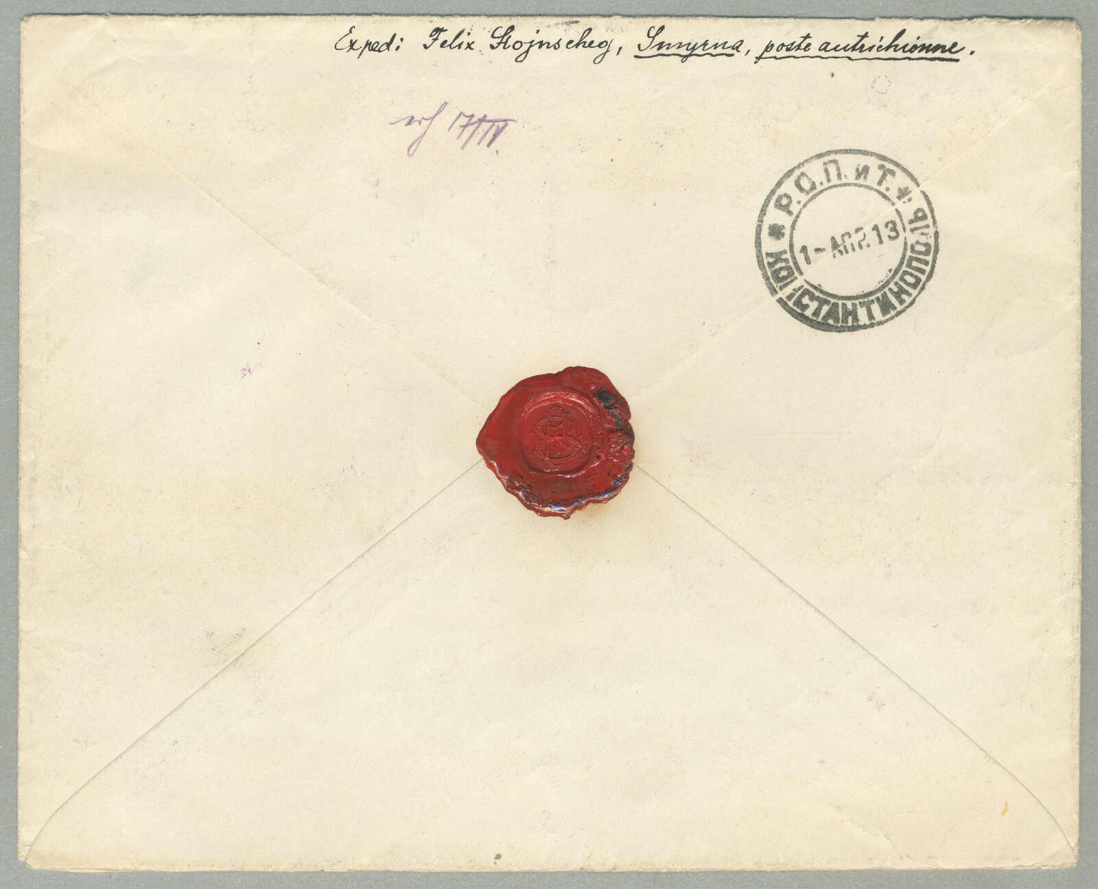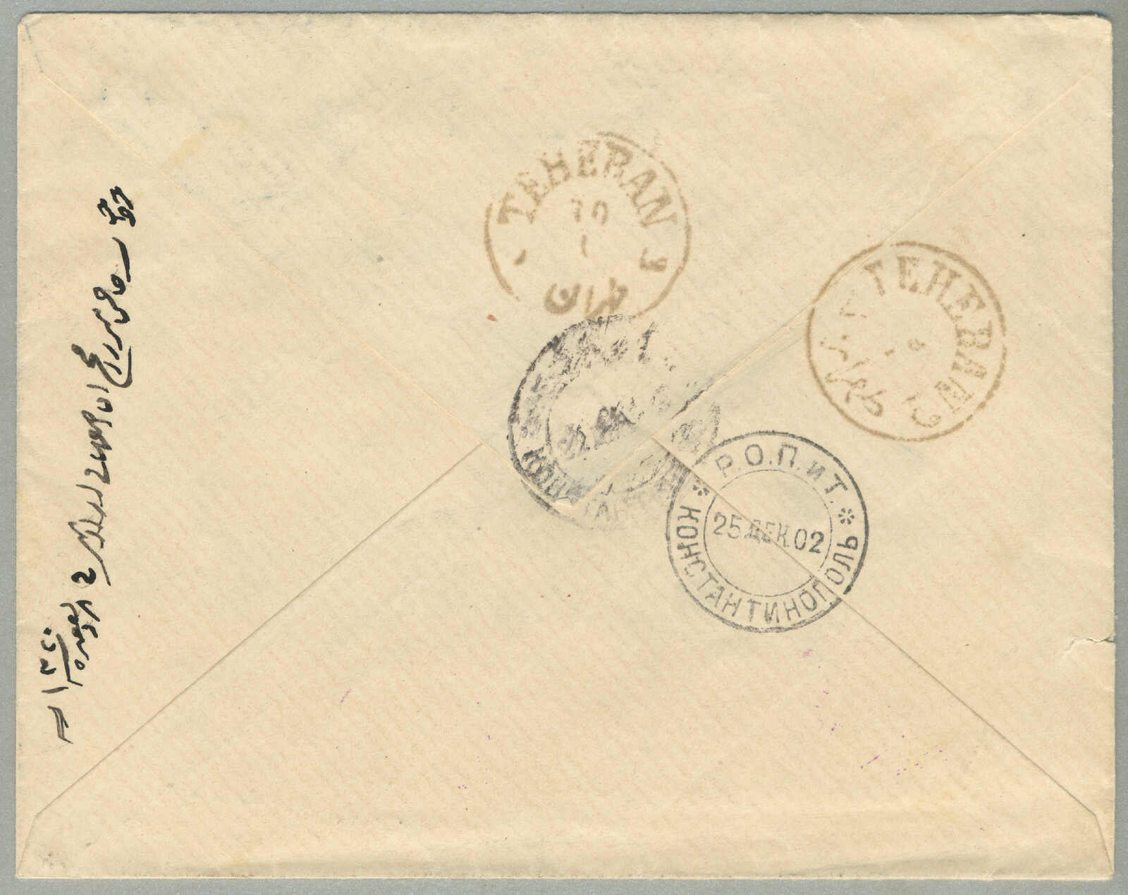 Argentinien, gestempelt mit blauem Kreisdatumsstempel, punktierter R Einschreibestempel beiseite, Schrift Bleistift nein 874, rückseitig schreibt um Konstantinopel, ODESSA, BUENOS AIRES und Ankunft TUCUMAN, interessant und gesucht, Pracht!
