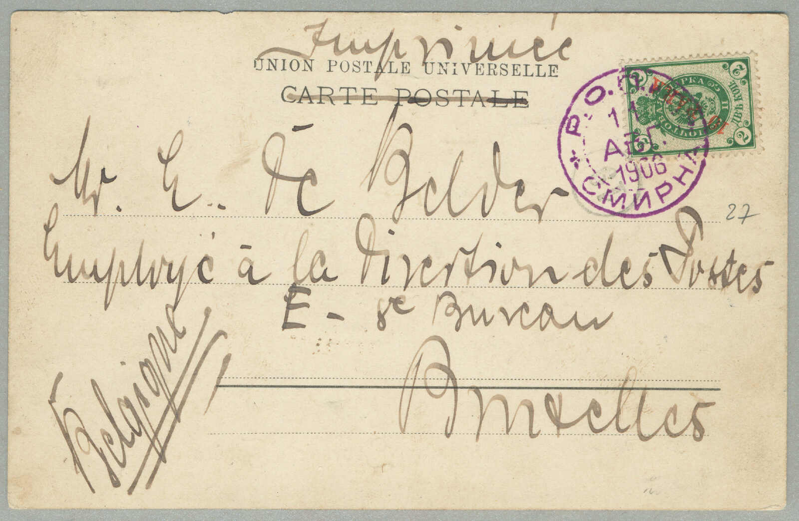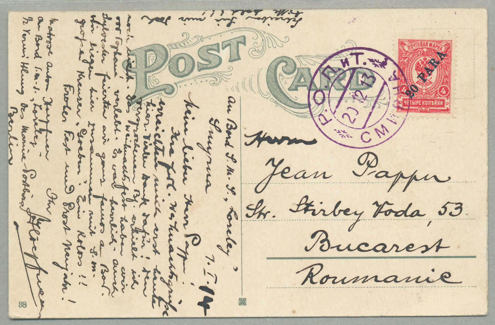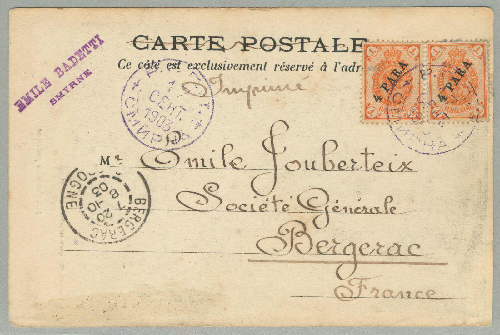 Automatisch generierte Übersetzung: 1905,1 pi. auf 10 ko. Blau, gebraucht und aufgedruckt auf Kartenbrief, von Smyrna nach Tucuman,