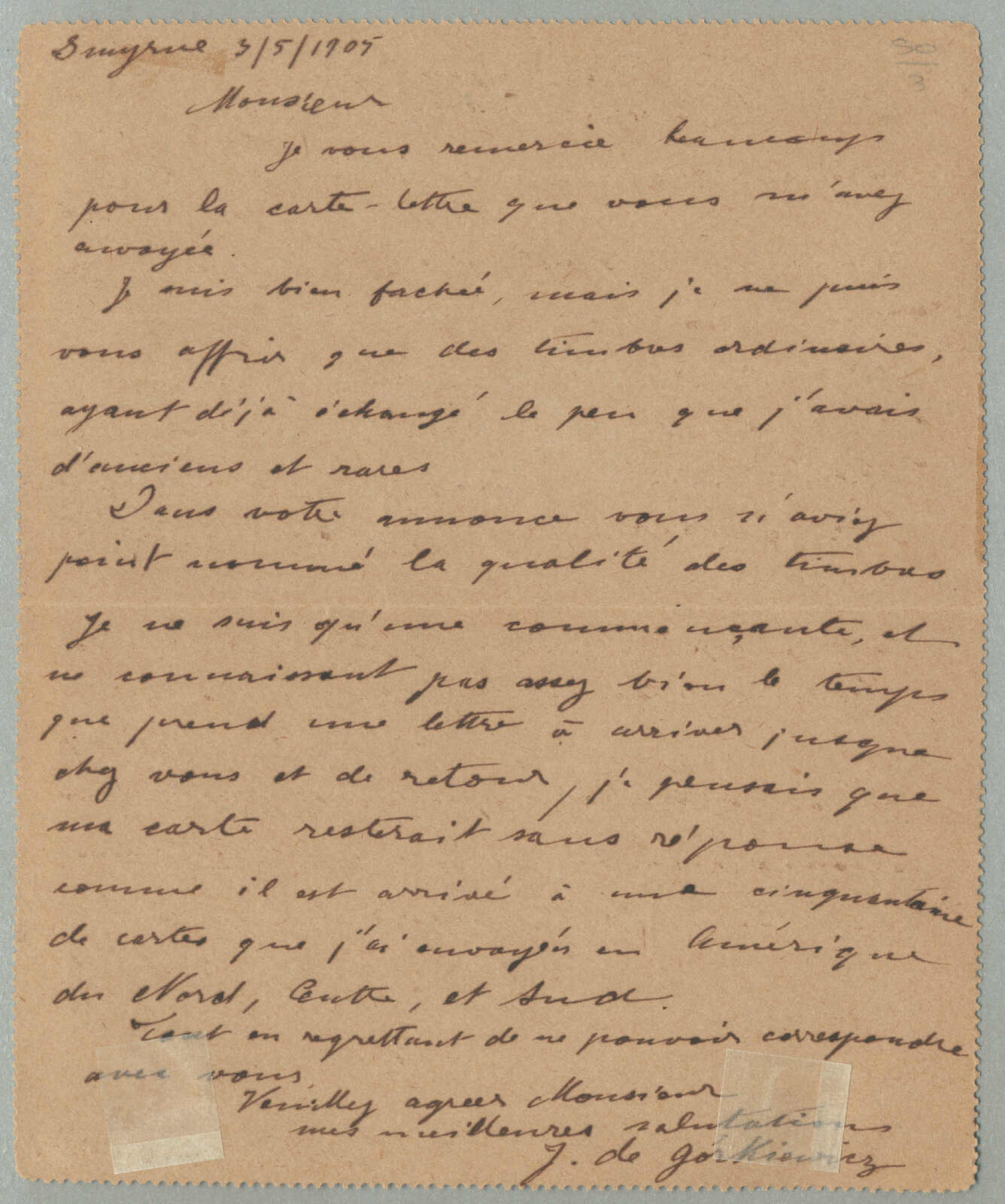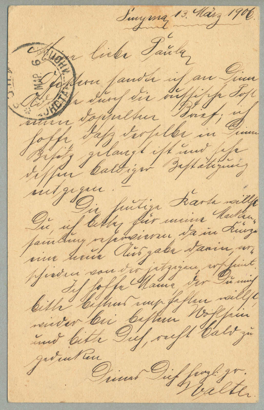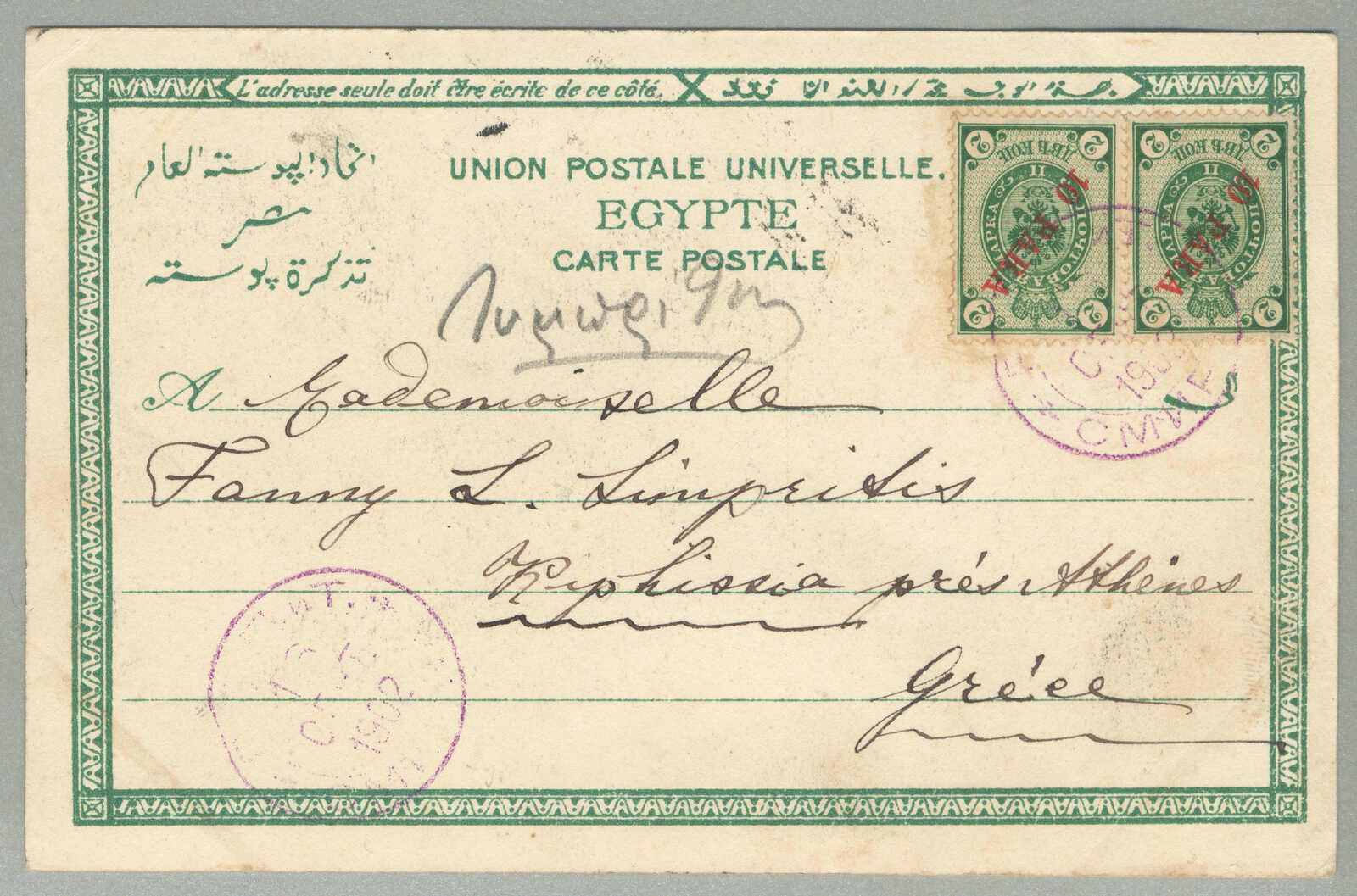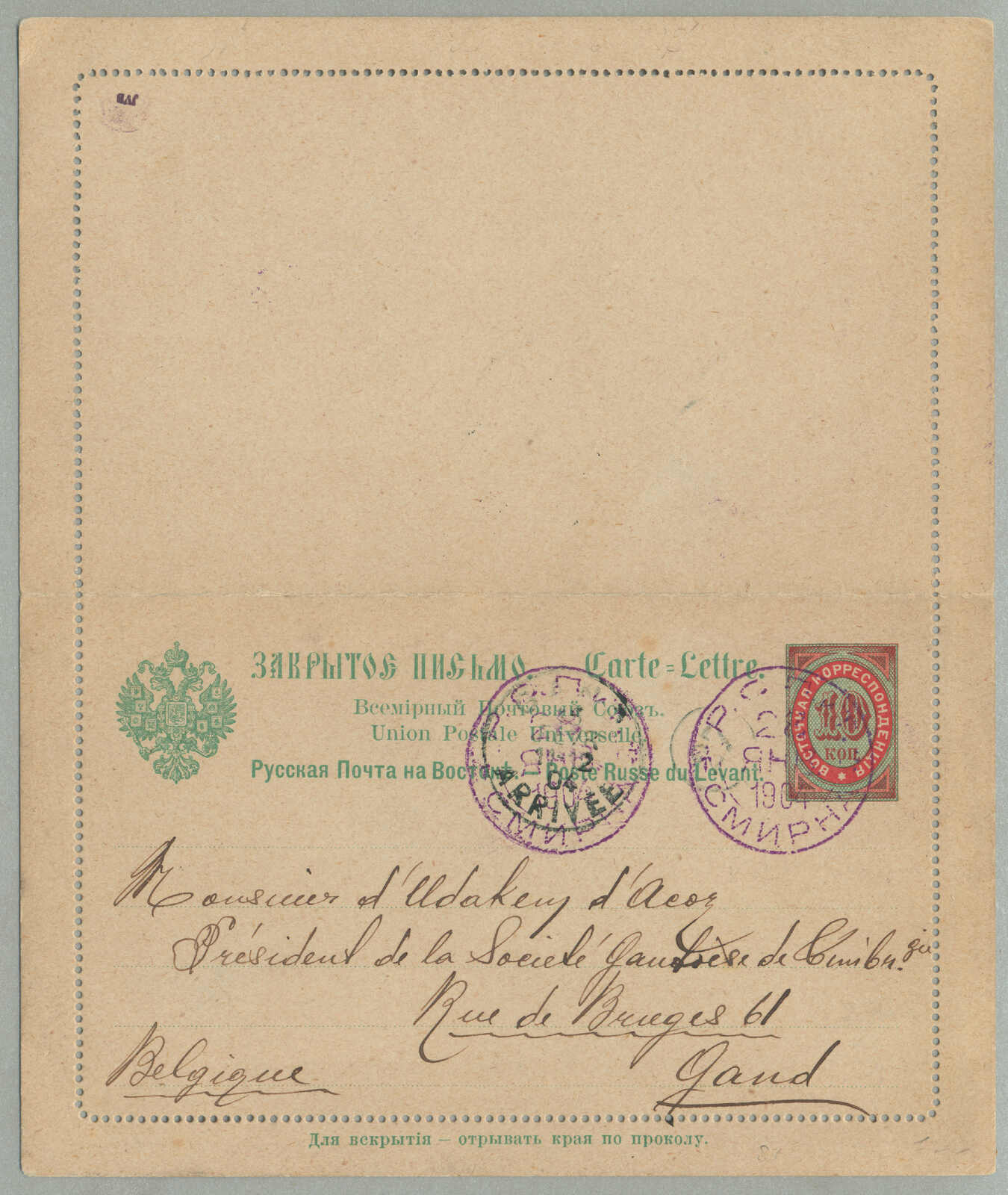 Automatisch generierte Übersetzung: 1905,1 pi. auf 10 ko. Blau, gebraucht und aufgedruckt auf Kartenbrief, von Smyrna nach Tucuman,