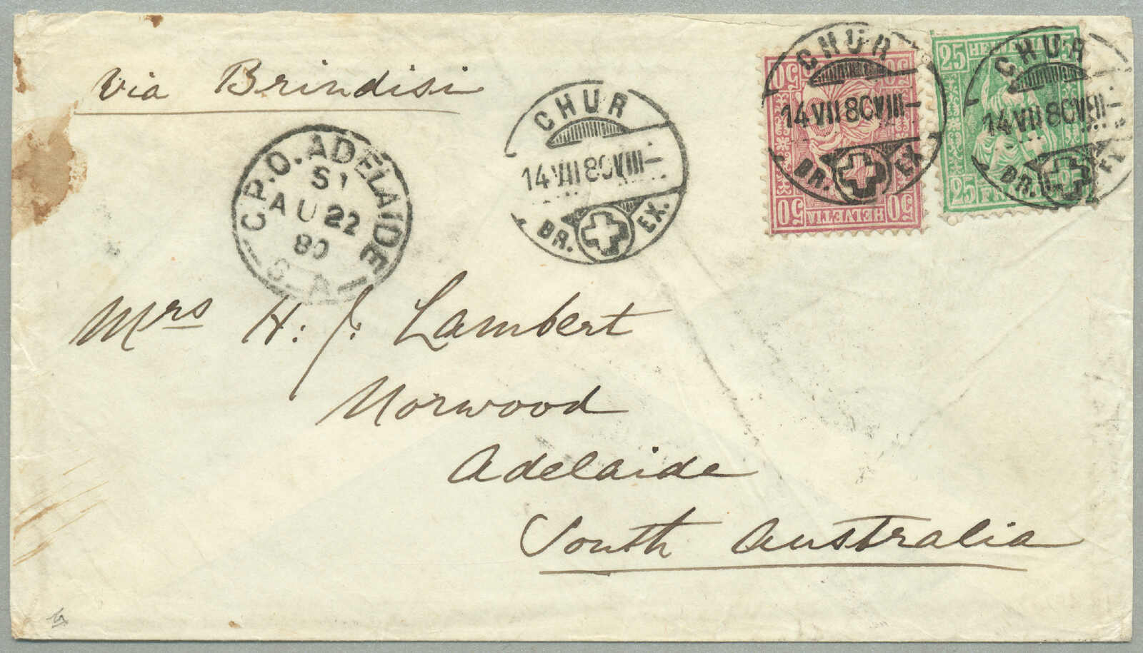 1880, Incoming Mail Overland via Brindisi & Suez, 25 c. light green and 50 c. pale purple on cover from Chur, Switzerland to Adelaide, South Australia, cancelled by the Chur datestamp and prepaying 75 cents for a 1/2
