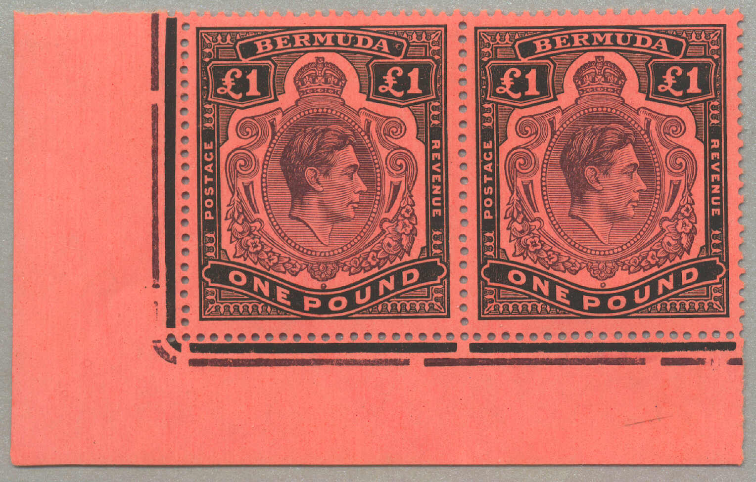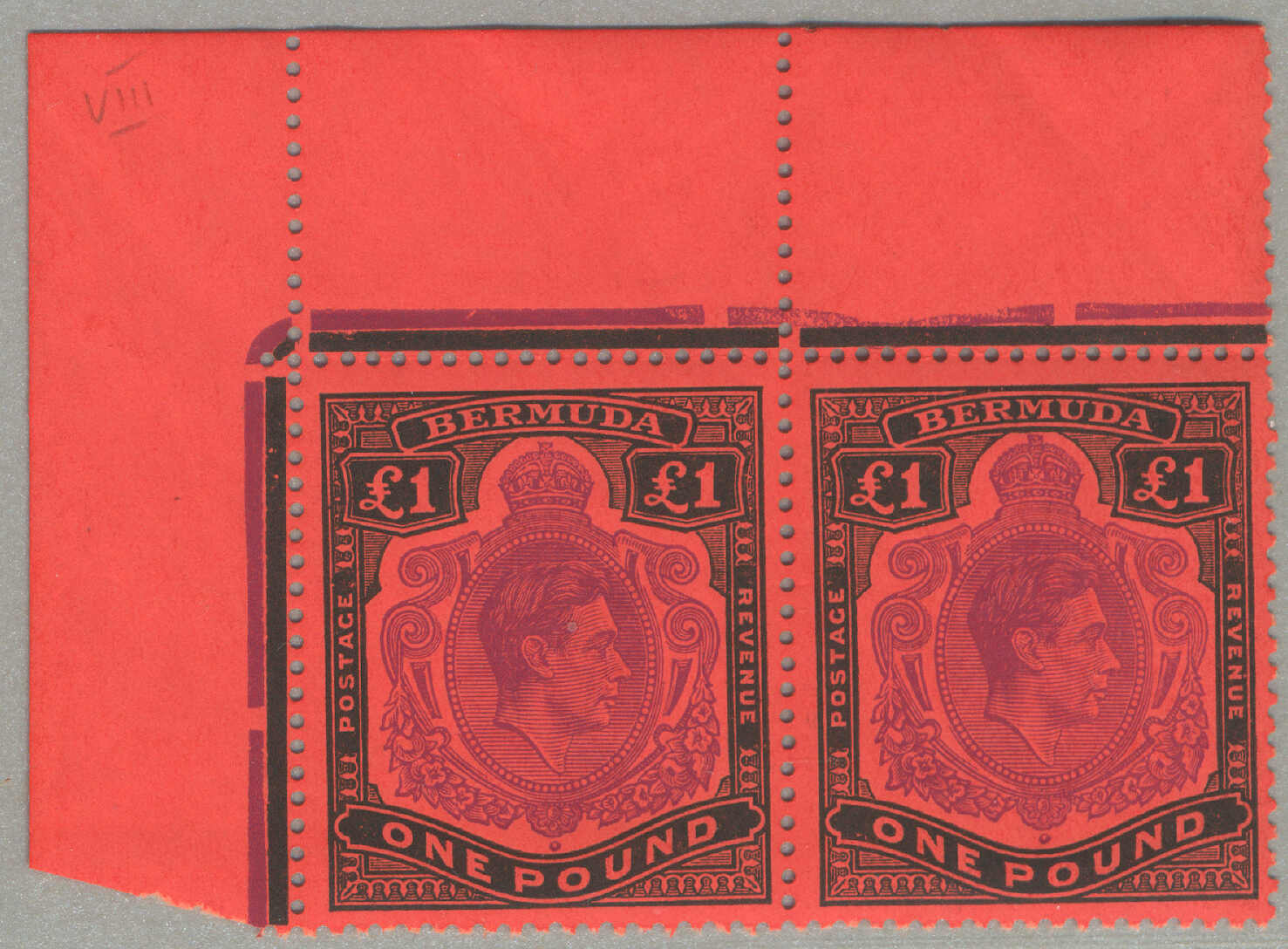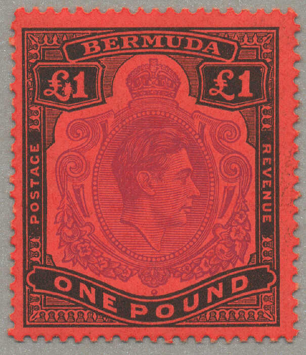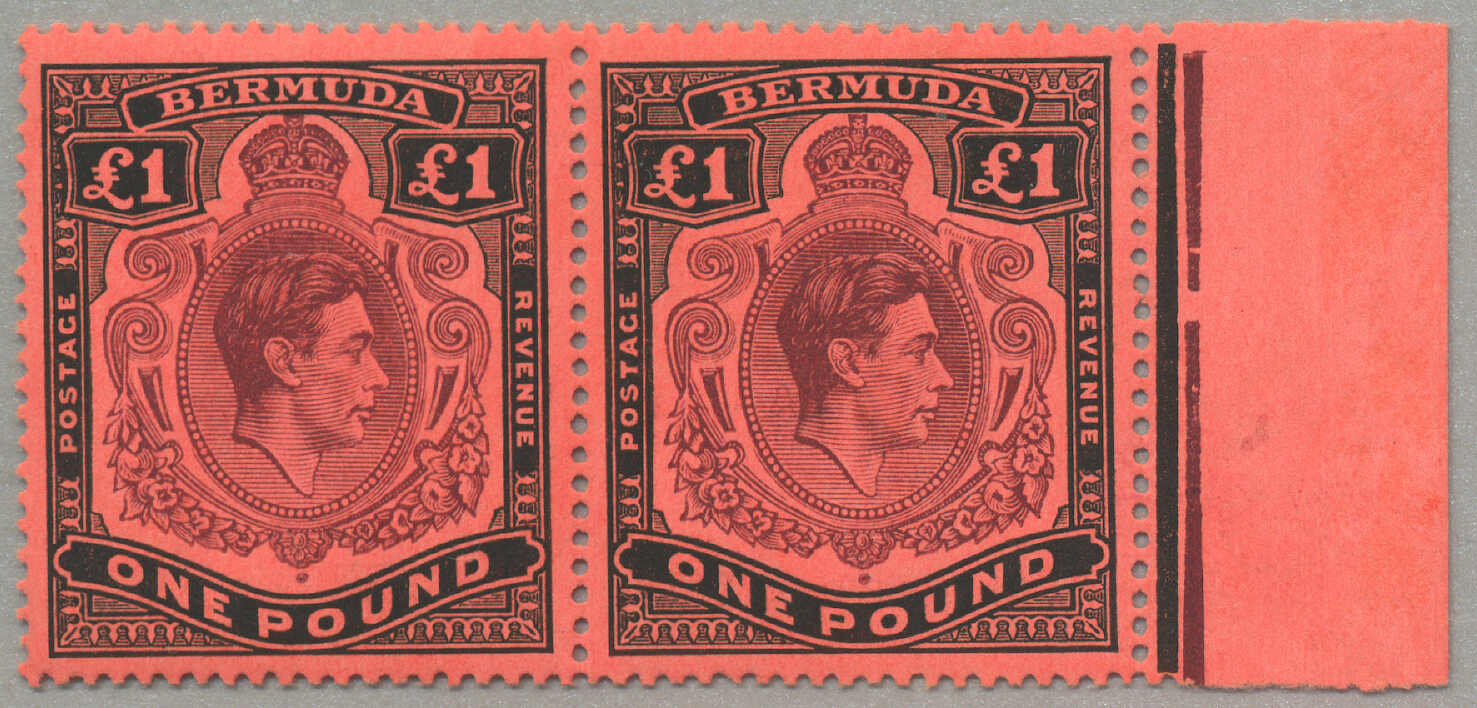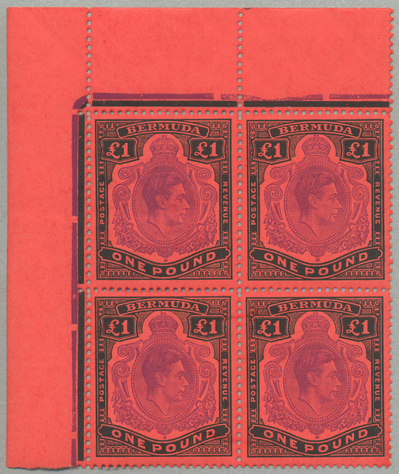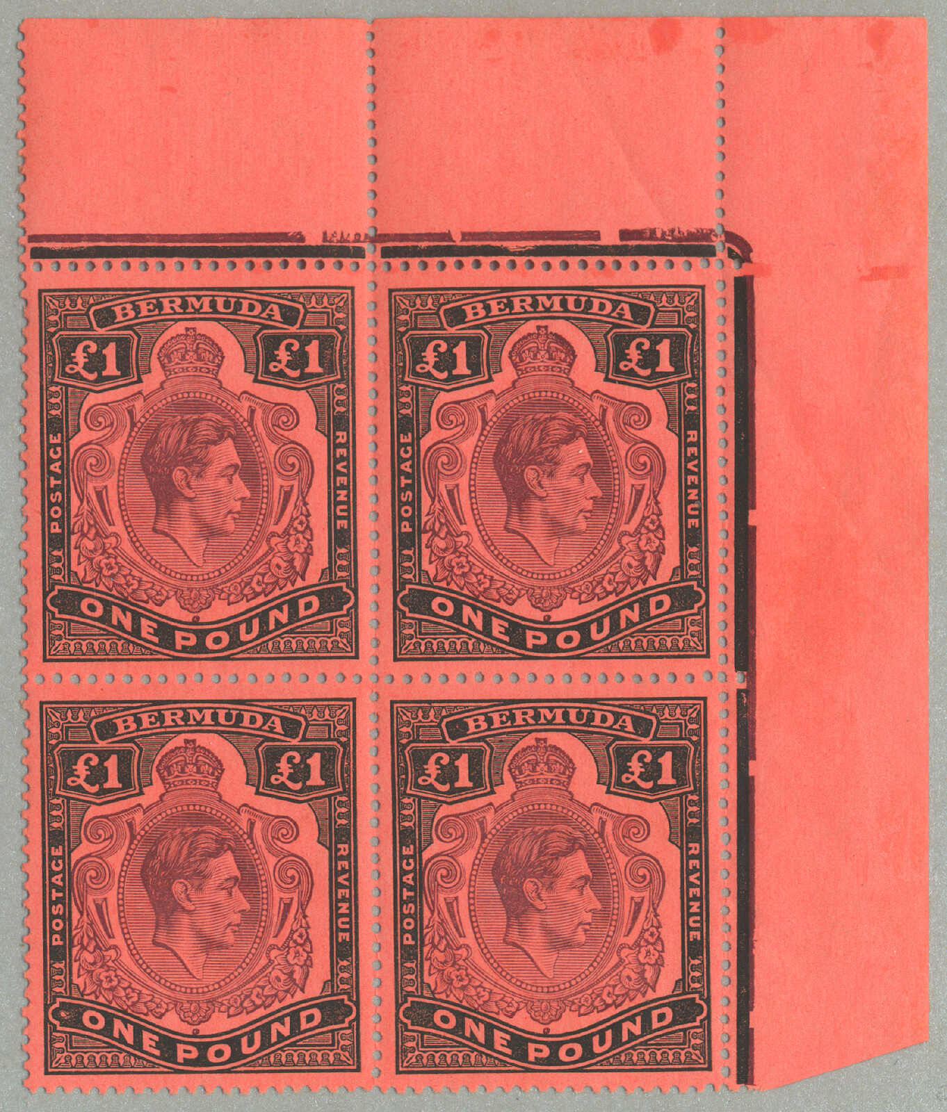 Automatisch generierte Übersetzung: 1938-53, £1, tief reddish-purple und schwarz / scharlachrot, gebrochene Rolle rechts, Feld 60, Reihe 5, Briefmarke 12, Wasserzeichen mehrfach Krone CA, Zähnung 13, großer Teil Originalgummi,