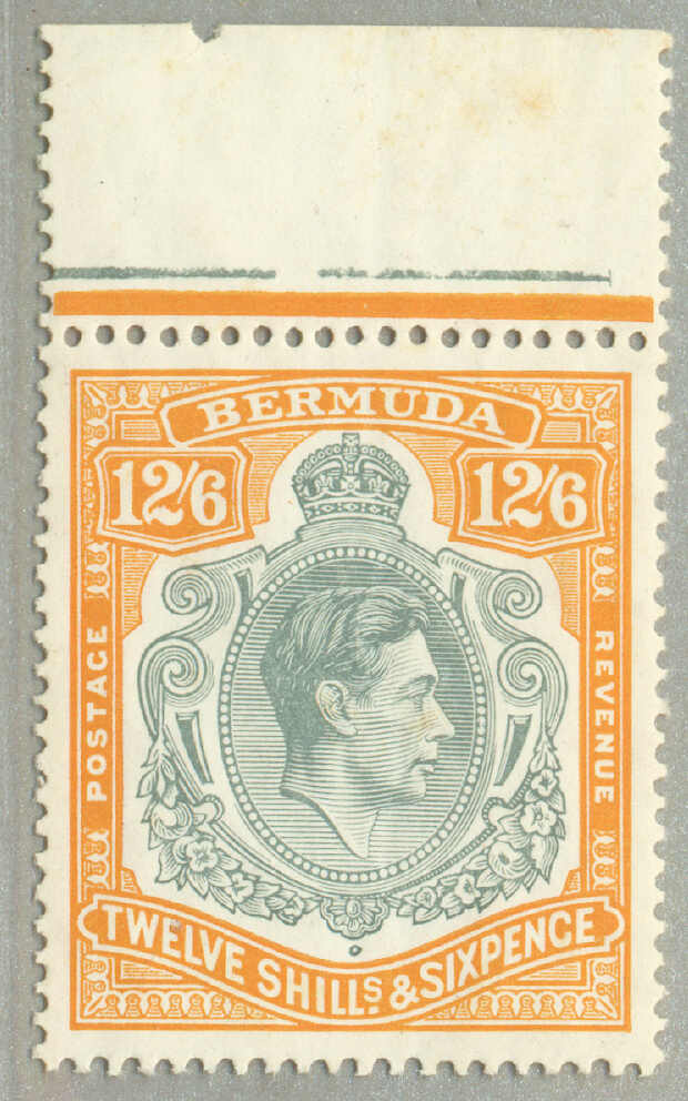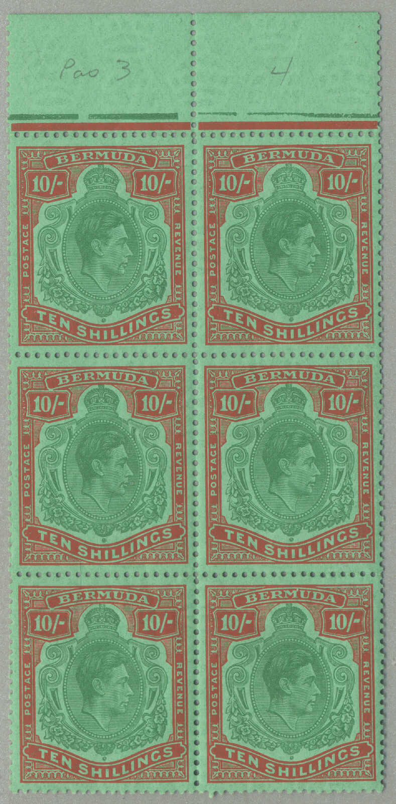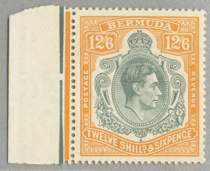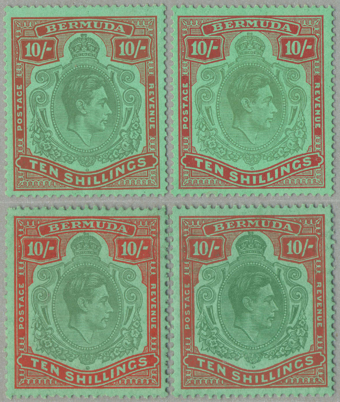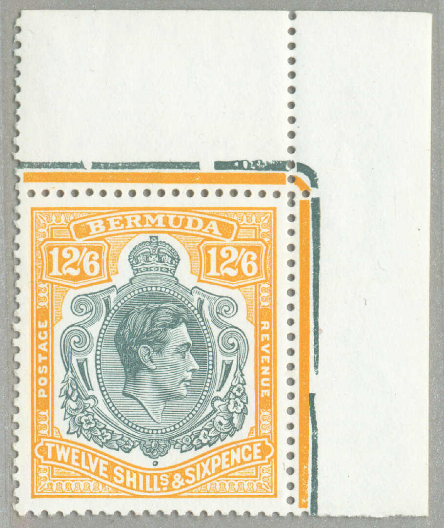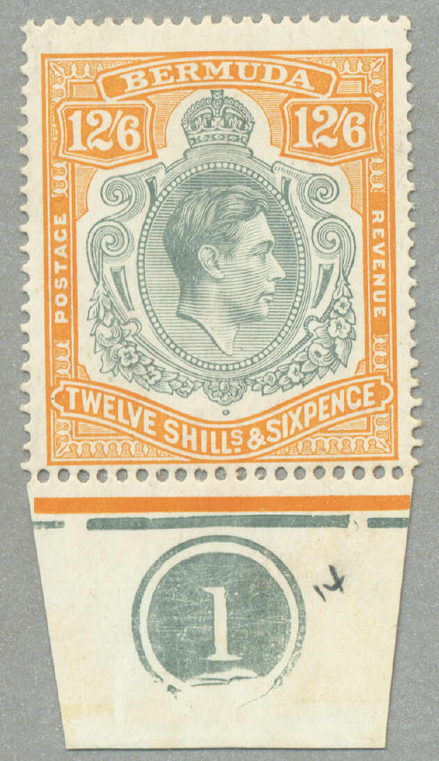 Automatisch generierte Übersetzung: 1938-53, £1, tief reddish-purple und schwarz / scharlachrot, gebrochene Rolle rechts, Feld 60, Reihe 5, Briefmarke 12, Wasserzeichen mehrfach Krone CA, Zähnung 13, großer Teil Originalgummi,