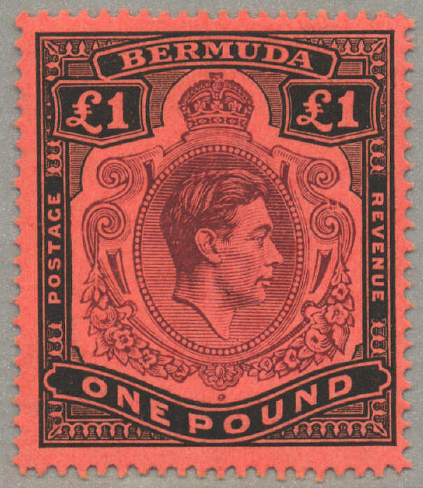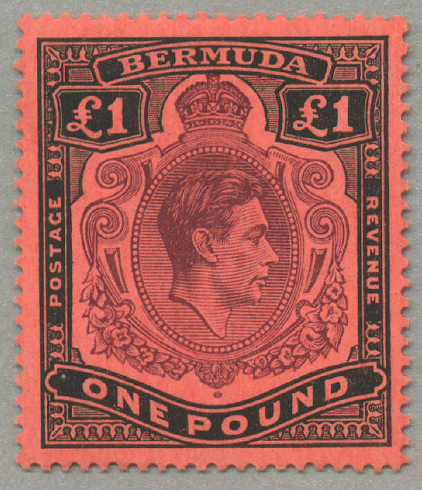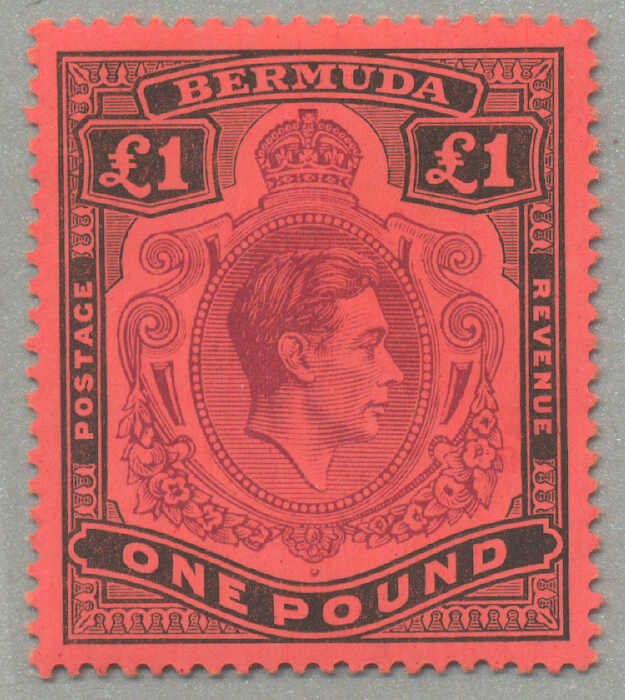 1938-53, £1, deep reddish-purple and black/scarlet, BROKEN SCROLL at right, Position 60, Row 5, stamp 12, wmk Multi Crown CA, perf. 13, LPOG, fresh and very fine, scarce stamp CV £1800, very fresh, XF! Estimate 2.200€.