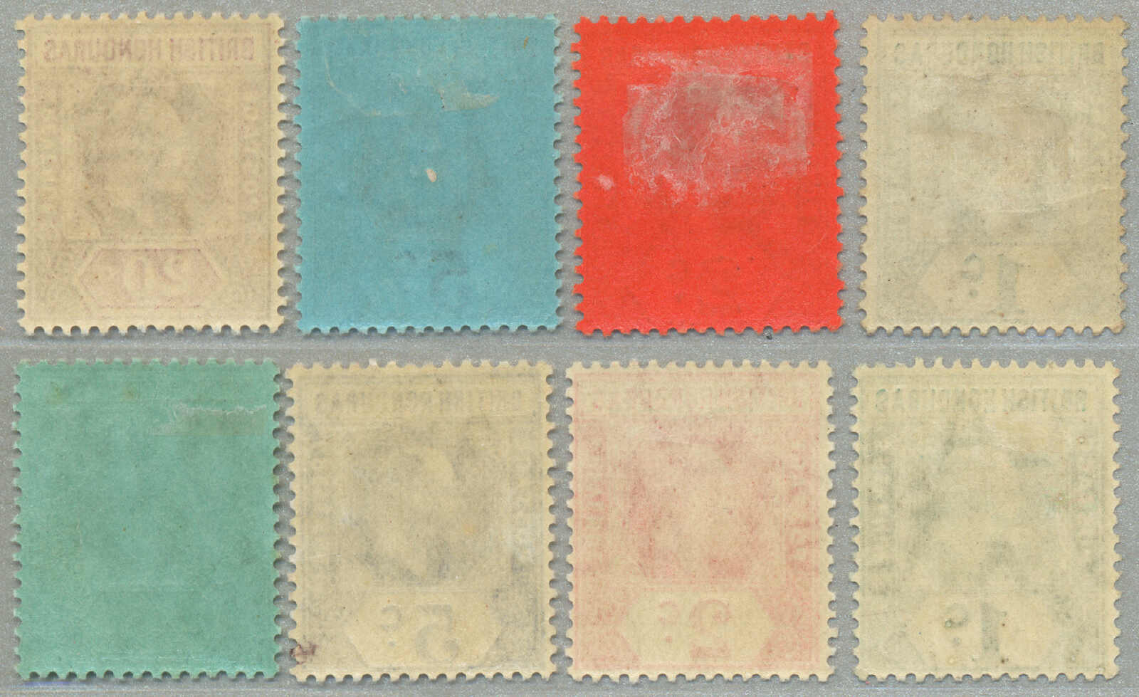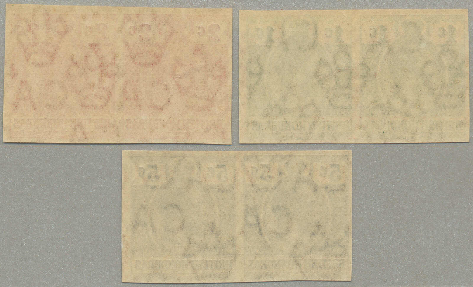 Wasserzeichen, 1c purpur und orangebraun, Farbprobe auf Papier ohne Wasserzeichen, 1c schwarz / rot Farbprobe auf Krone CA Wasserzeichen Papier und 1c purpur und rot / rot Farbprobe auf Krone CA Wasserzeichen Papier, alle frisch und mit großem Teil