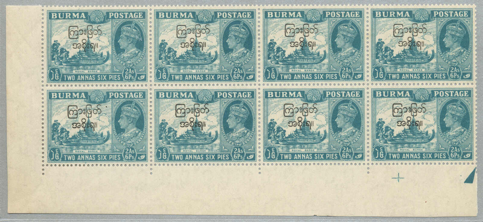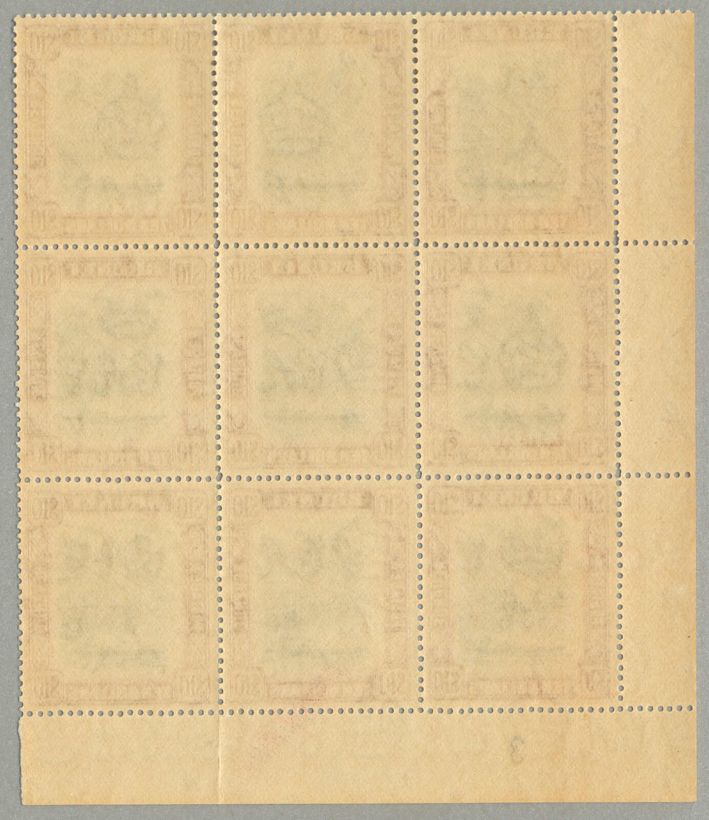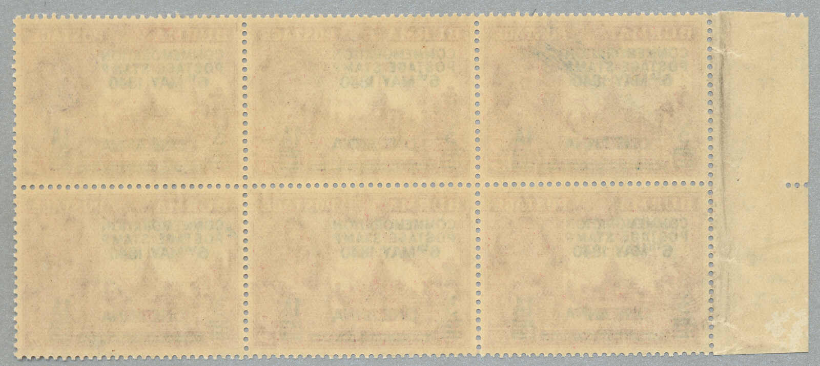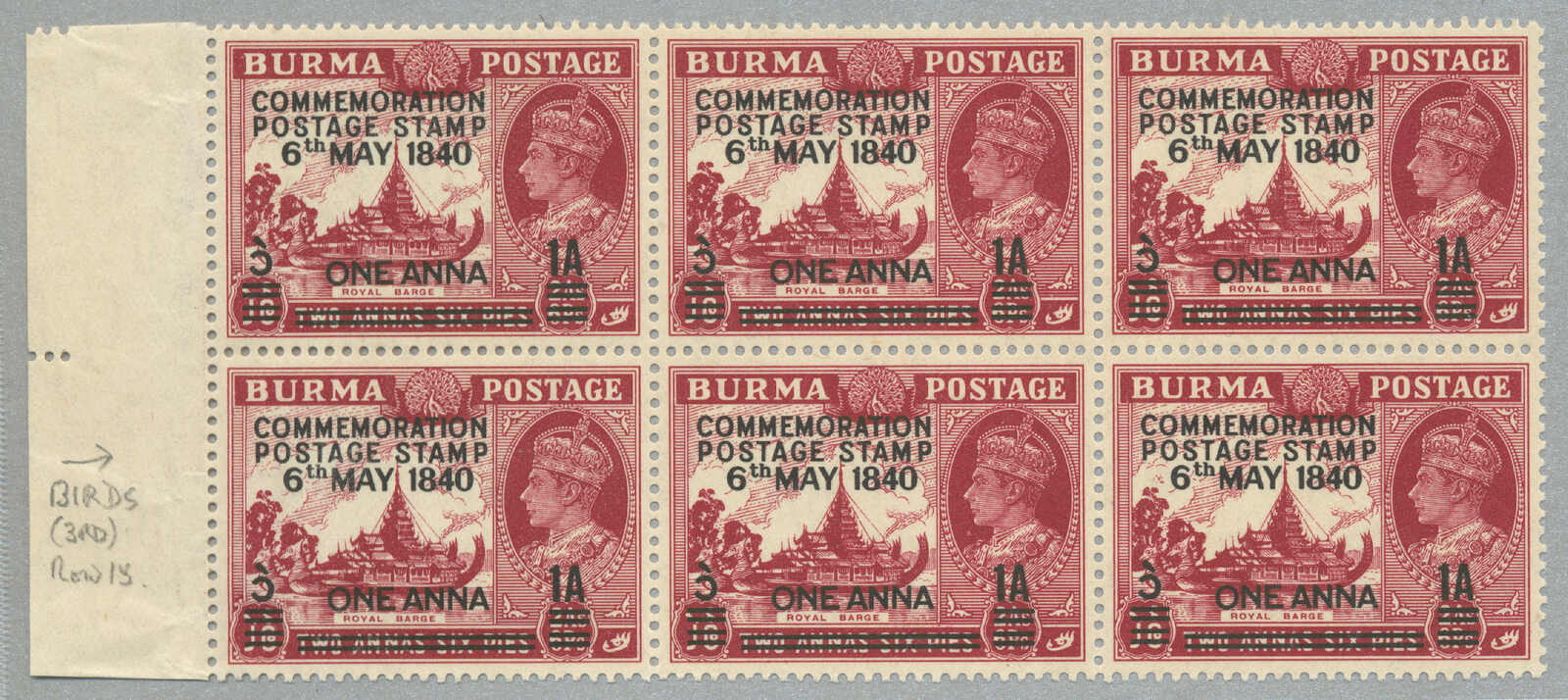 Übersetzung: 1940, 1a auf 2a 6p, weinrot, Schwarzaufdruck, linker Rand Sechserblock, unten Reihe 3. Briefmarke ab links mit Abart Vögel über Bäume-, großer Teil Originalgummi postfrisch, sehr frisch, VF-XF! Schätzpreis 180. (SG 34, 34a)