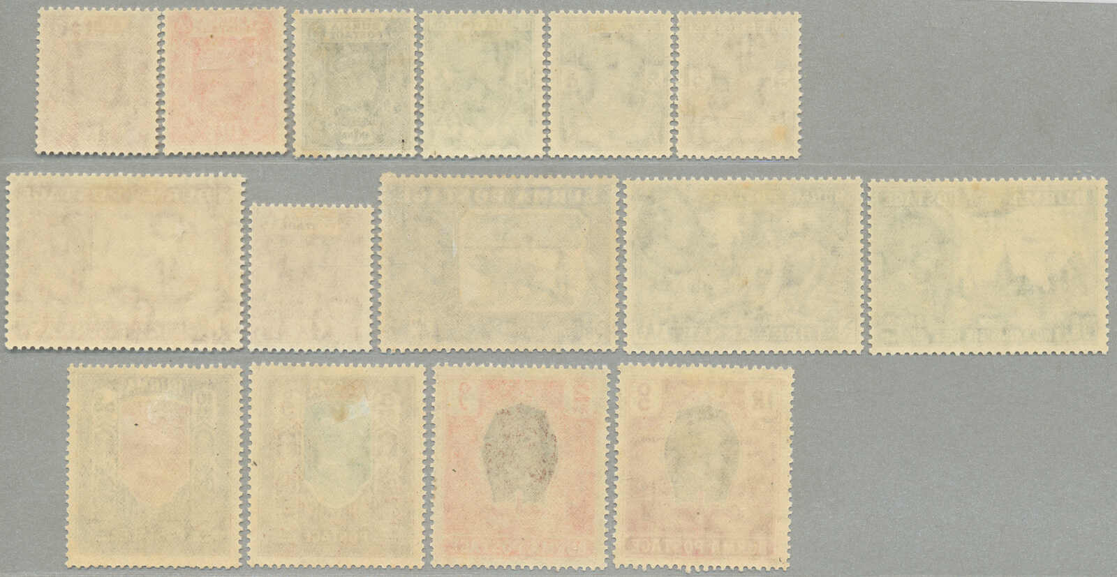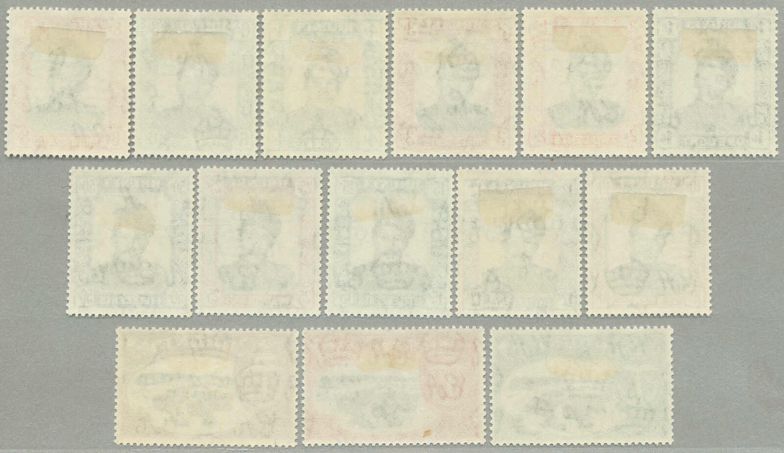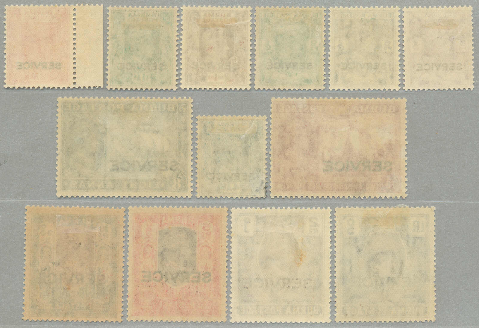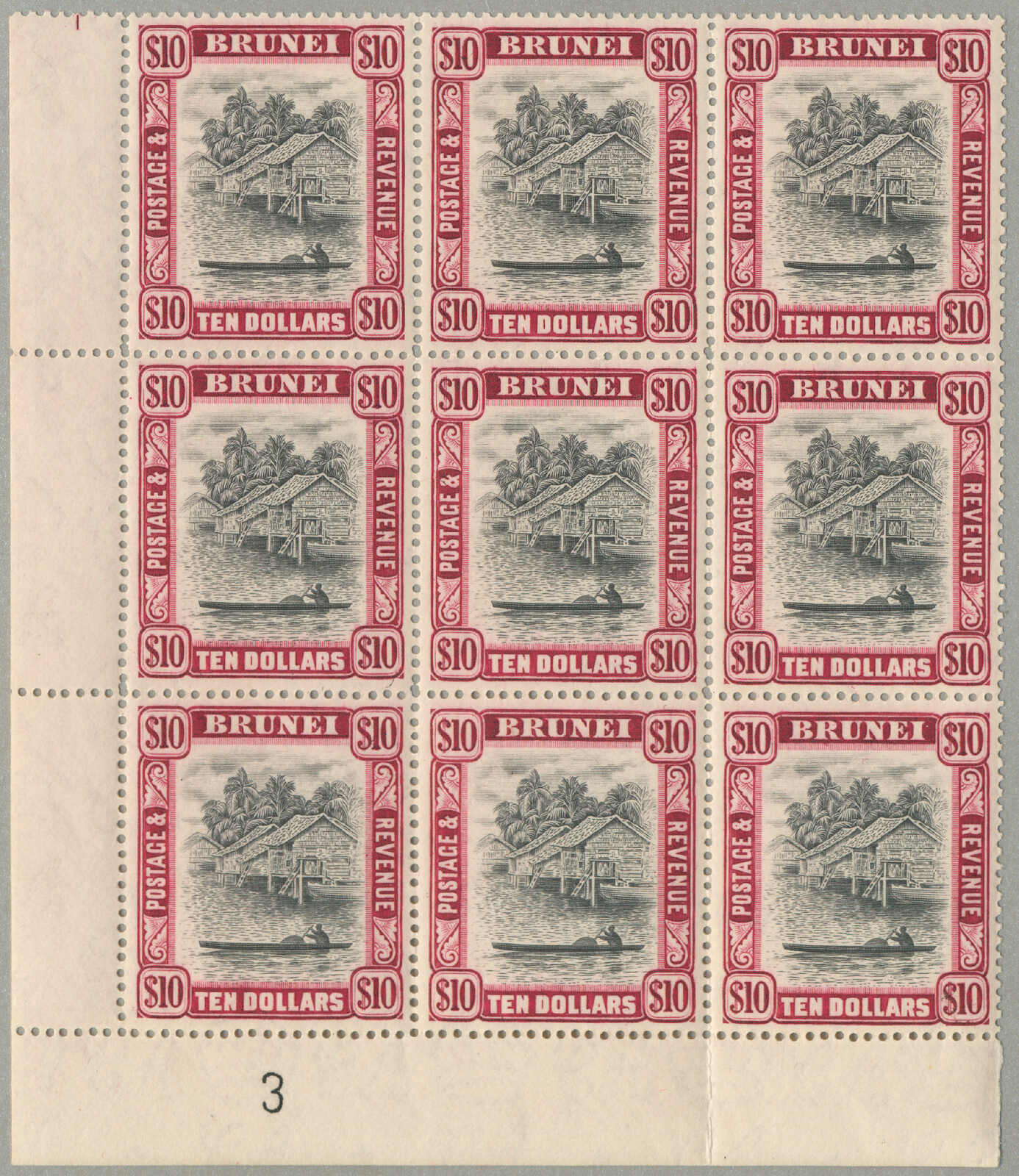 Übersetzung: 1940, 1a auf 2a 6p, weinrot, Schwarzaufdruck, linker Rand Sechserblock, unten Reihe 3. Briefmarke ab links mit Abart Vögel über Bäume-, großer Teil Originalgummi postfrisch, sehr frisch, VF-XF! Schätzpreis 180. (SG 34, 34a)