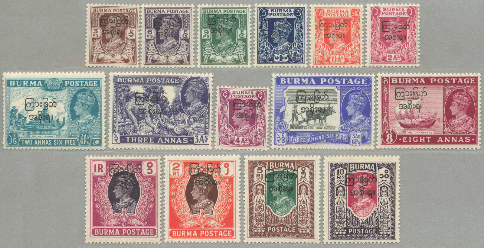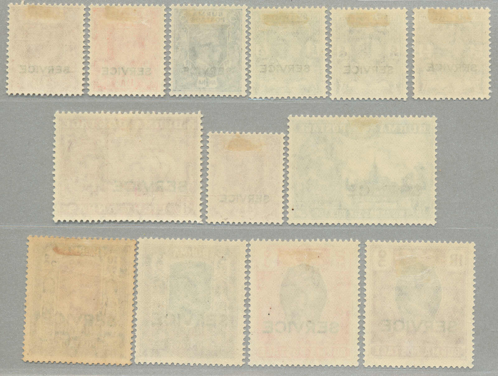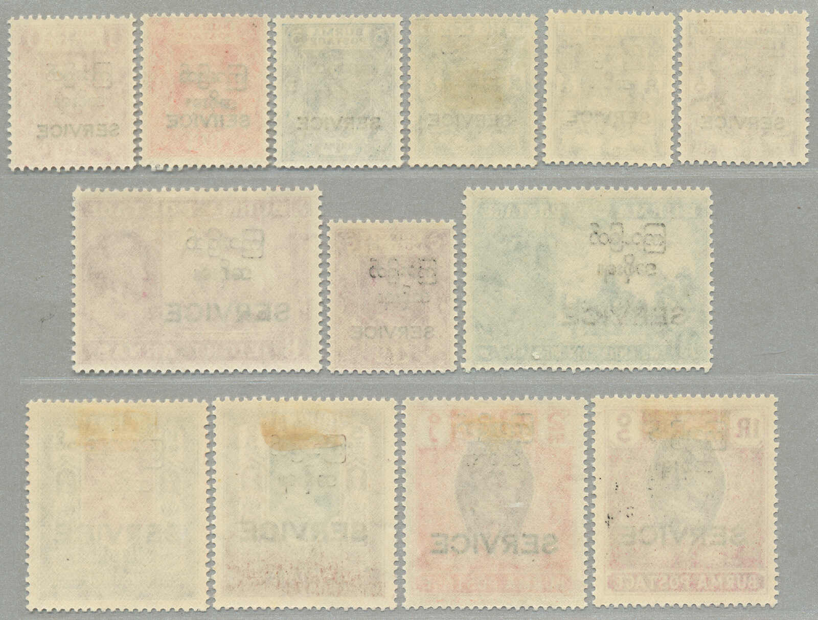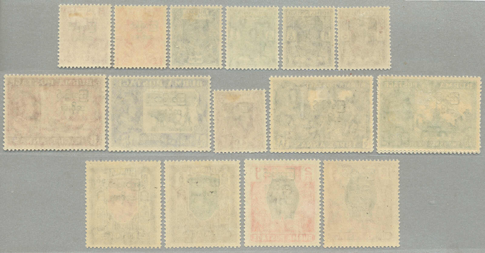 Übersetzung: 1940, 1a auf 2a 6p, weinrot, Schwarzaufdruck, linker Rand Sechserblock, unten Reihe 3. Briefmarke ab links mit Abart Vögel über Bäume-, großer Teil Originalgummi postfrisch, sehr frisch, VF-XF! Schätzpreis 180. (SG 34, 34a)