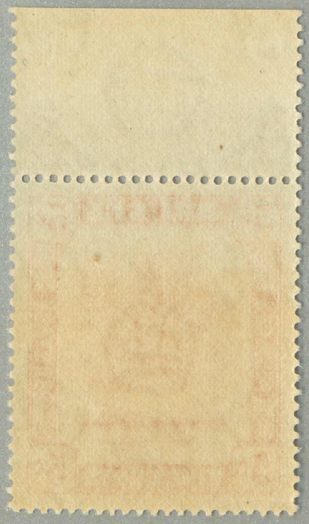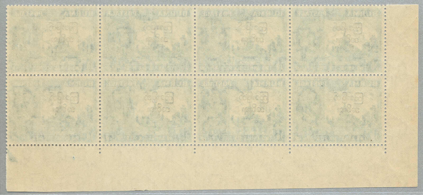 1940, 1a on 2a6p, claret, black opt, left margin block of (6), bottom row 3rd stamp from left with variety BIRDS OVER TREES, LPOG never hinged, very fresh, VF-XF! Estimate 180€.