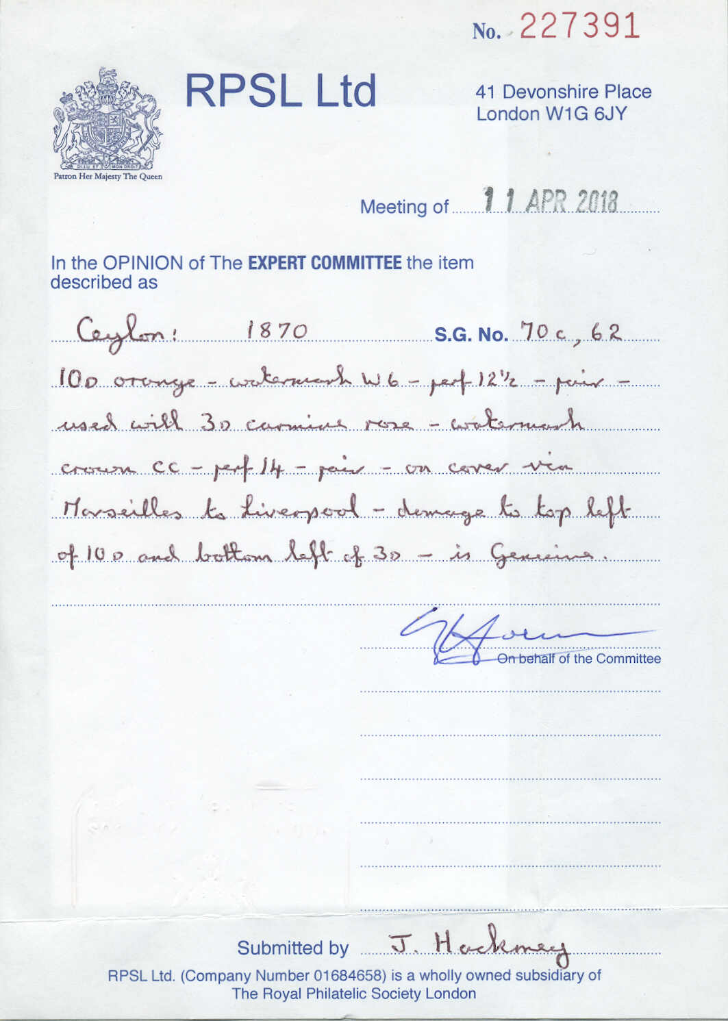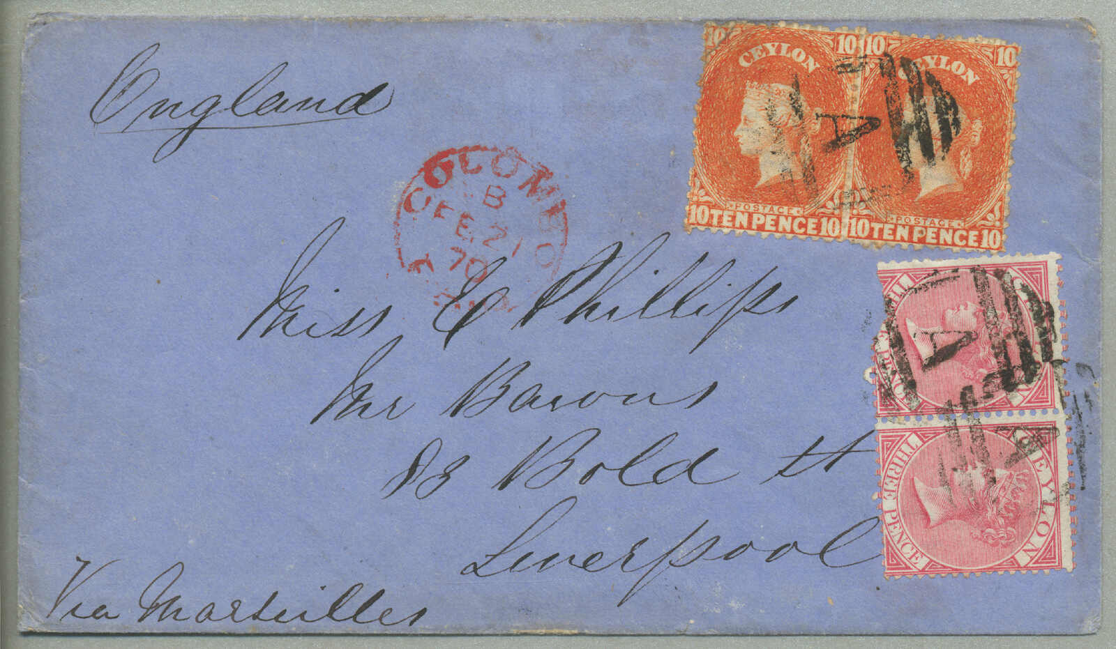 Liverpool, Vermerk über Marseilles, entwertet durch einen Stempel, beiseite rot COLOMBO PAID Kreisdatumsstempel, Ankunftsstempel (März 21), eine seltene attraktive Frankatur, Attest RPSL (2018), Provenienz: Sammlung Joseph Hackmey, Spink Shreves