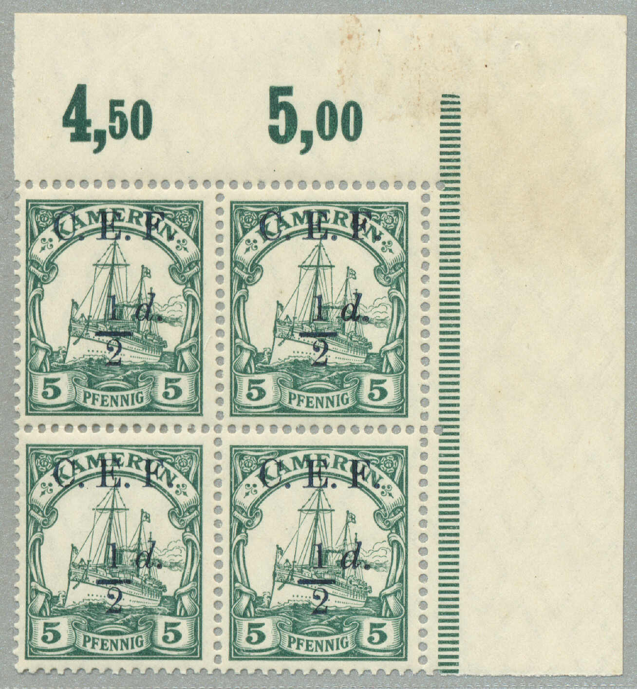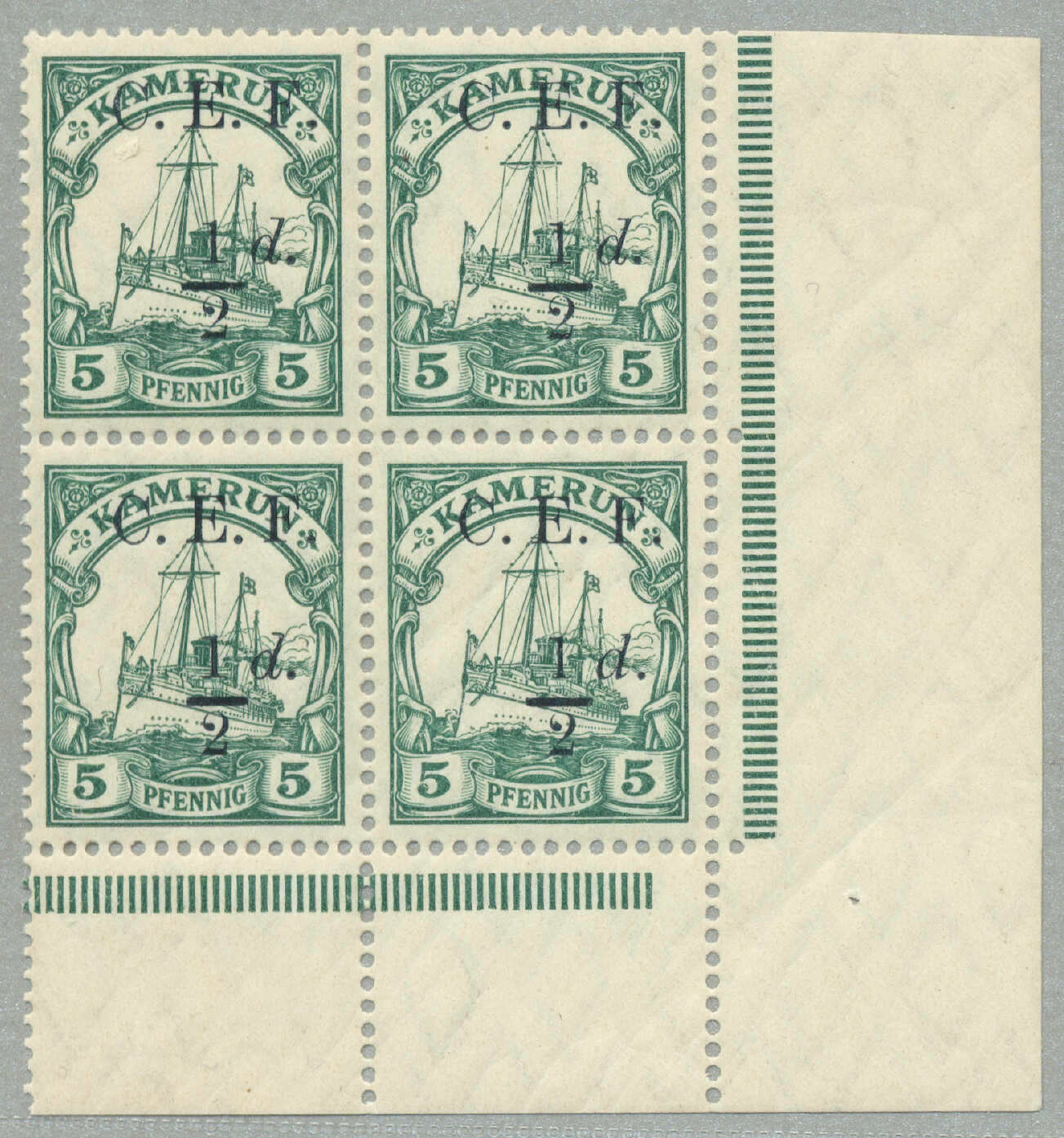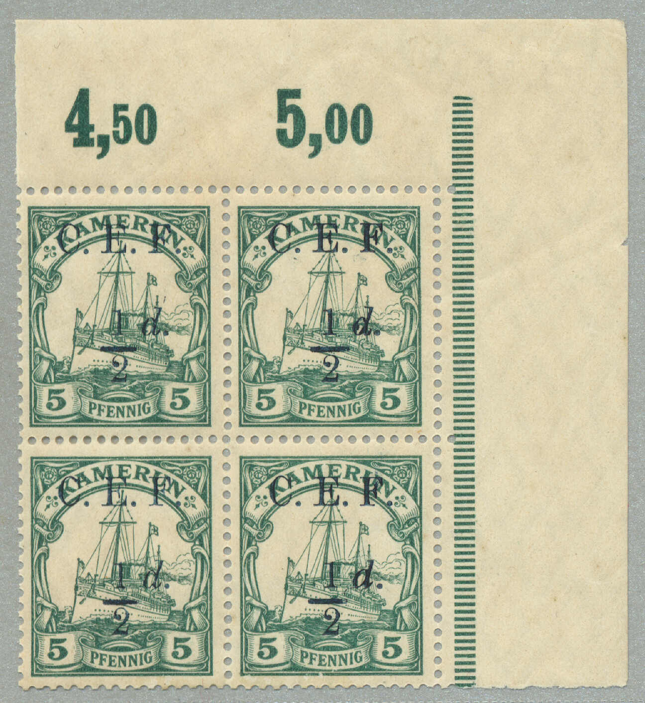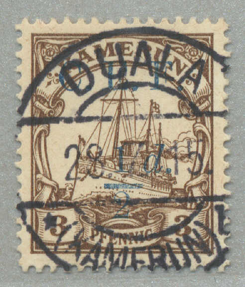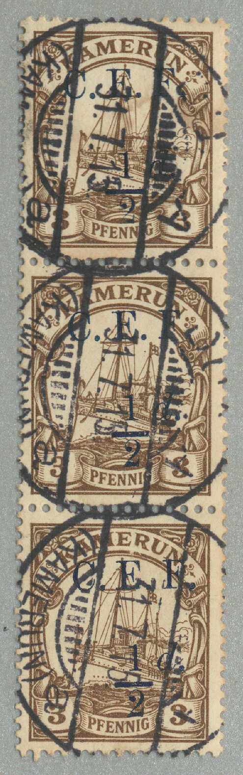 Automatisch generierte Übersetzung: 1916,2 1 / 2 d. auf 20 Pf., ultramarin, (3) mit schwarz G. R. I und Aufdruck Überdruck, (1) mit Abart 1 links von 2 nicht katalogisiert, auf eingeschriebenem, Zensurbrief von Apia / Samoa zu FUNAFUTI / Ellice Inseln, weitergeleitet nach TARAWA /