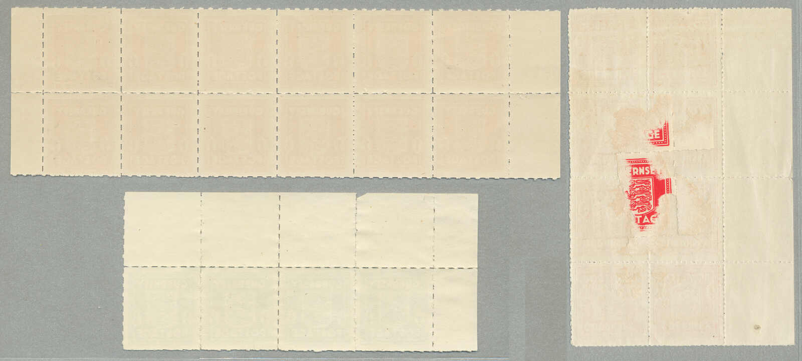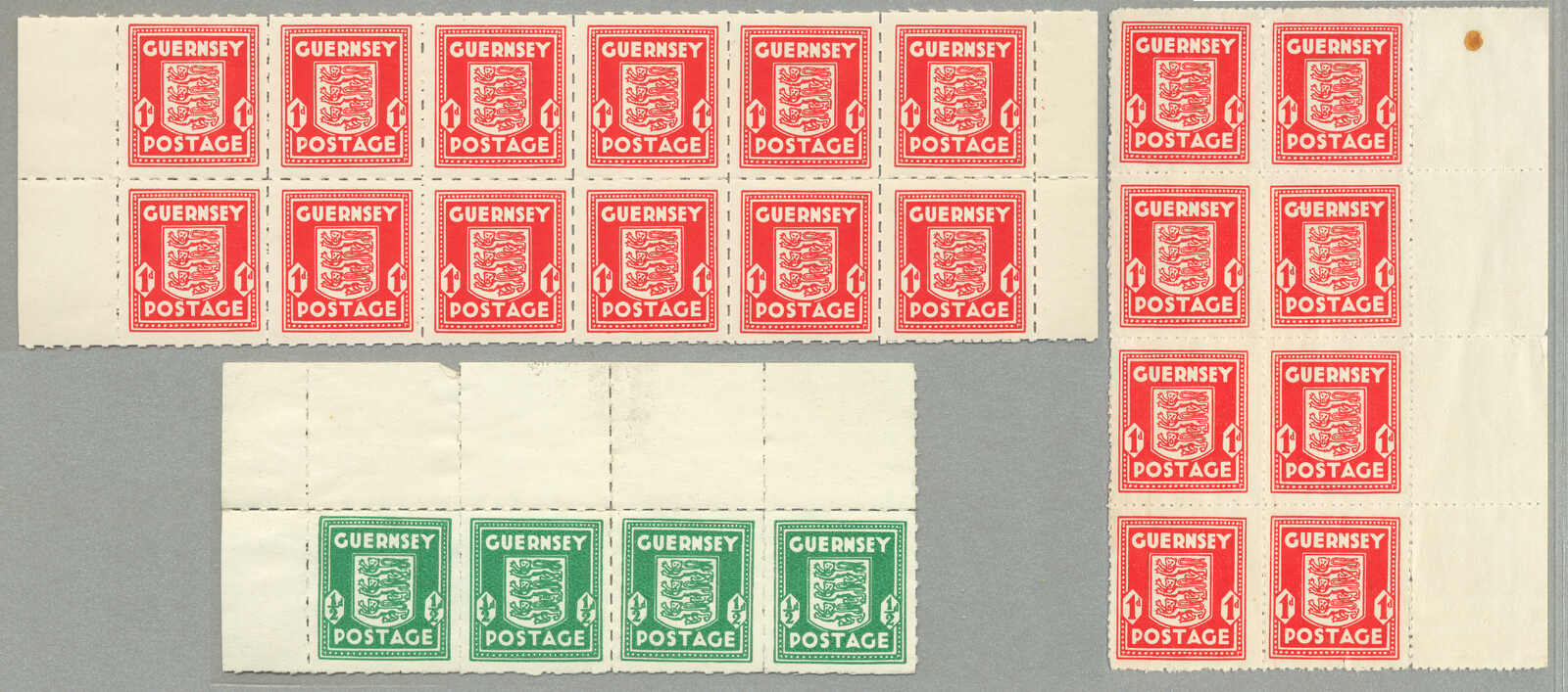 1941, 1/2d. light green, horiz. strip of 4, 1d., scarlet, 6x2 block of 12 and 2x4 block of 8, with margins attached, LPOG, never hinged, stamp remainder stuck on reverse of 1d. 2x4 block, not affecting front, interesting