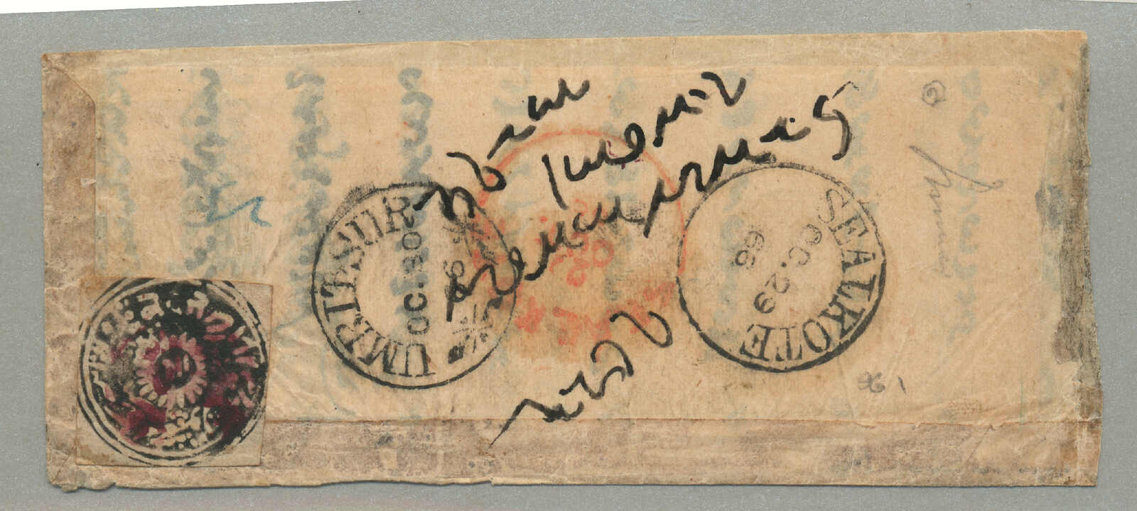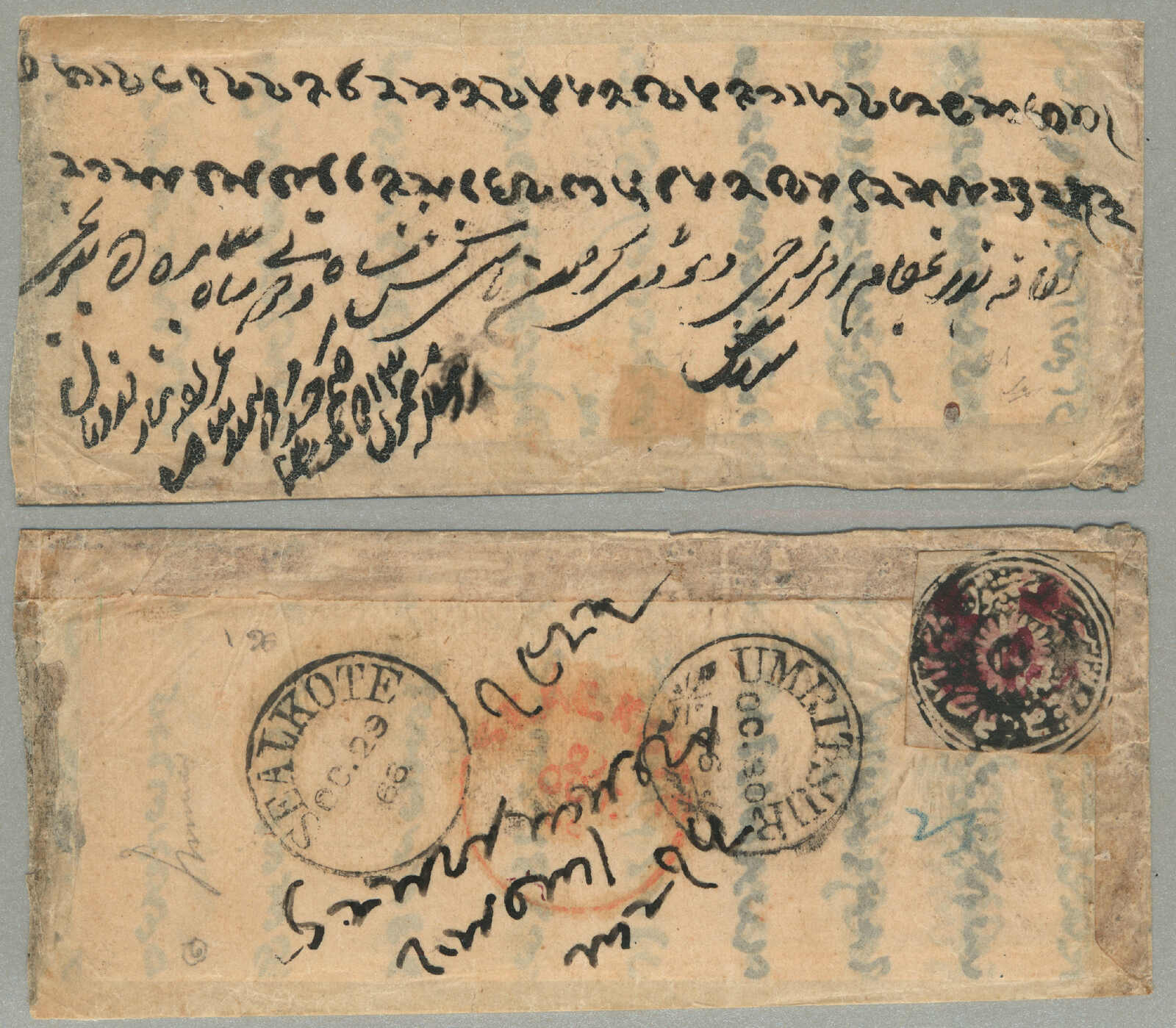 1866, Jammu & Kashmir, 1/2 a, grey-black in watercolour, native off white wove paper, on full letter from JAMMU to AMRITSAR, cancelled magentea Jammu seal handstamp, SEALKOTE transits cds in both red and black, Oct 29