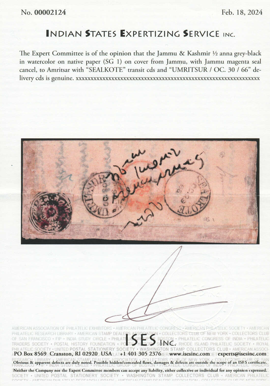 Aquarell, inländischen entfernt weiß Handpapier, auf Ganzbrief ab JAMMU zu AMRITSAR, gestempelt magentea Jammu Siegelabdruck, SEALKOTE Durchgangs Kreisdatumsstempel in beide rot und schwarz, Oct 29 und UMRITSAR Ankunft in schwarz, Oct 30, Attest ISES