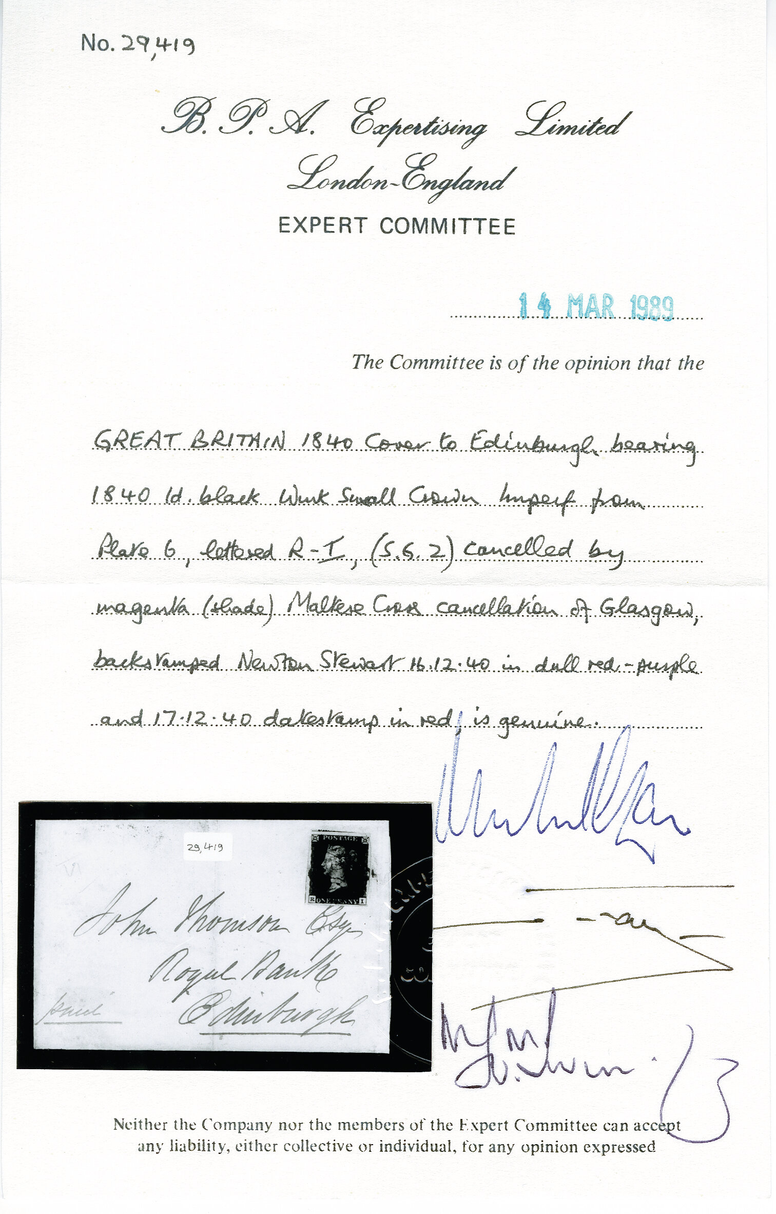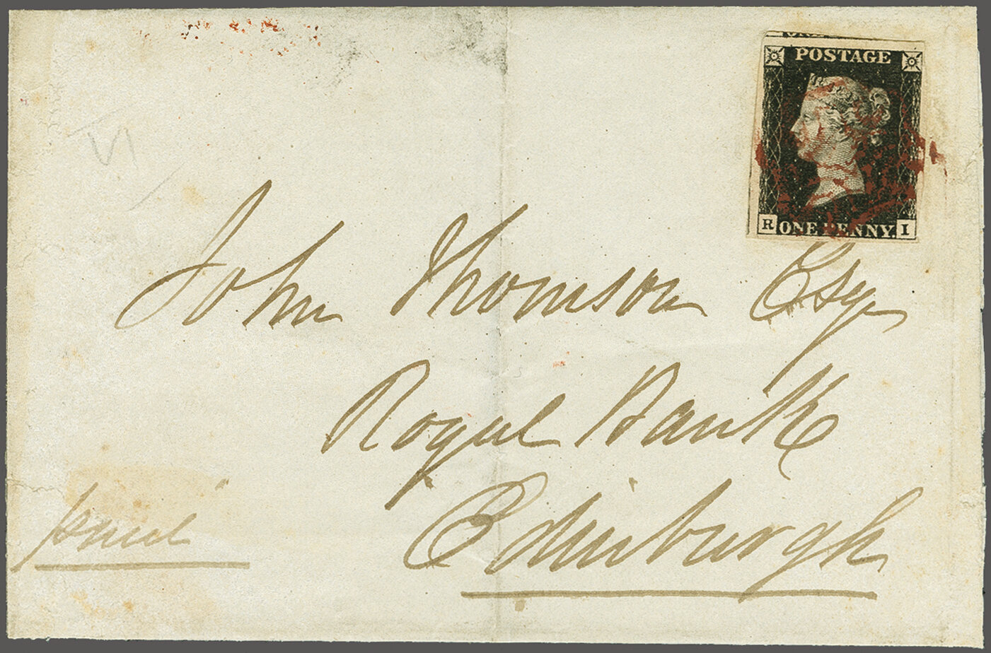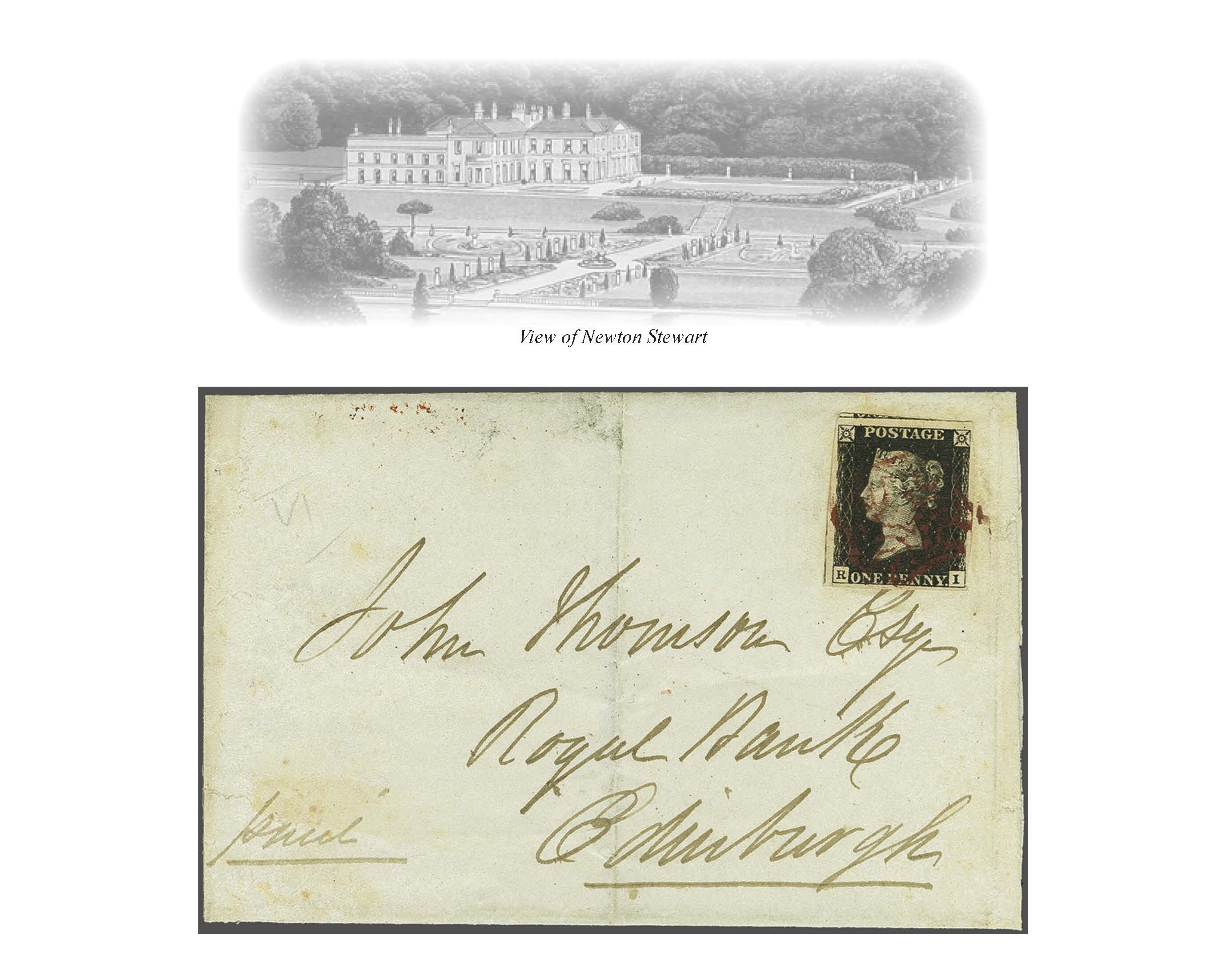 1840: 1 d. black, Plate 6, lettered RI, a used example with large margins all round and portions of adjoining stamps at left and at top, tied to 1840 cover from Newton Stewart to Edinburgh by Maltese Cross struck in "magenta /