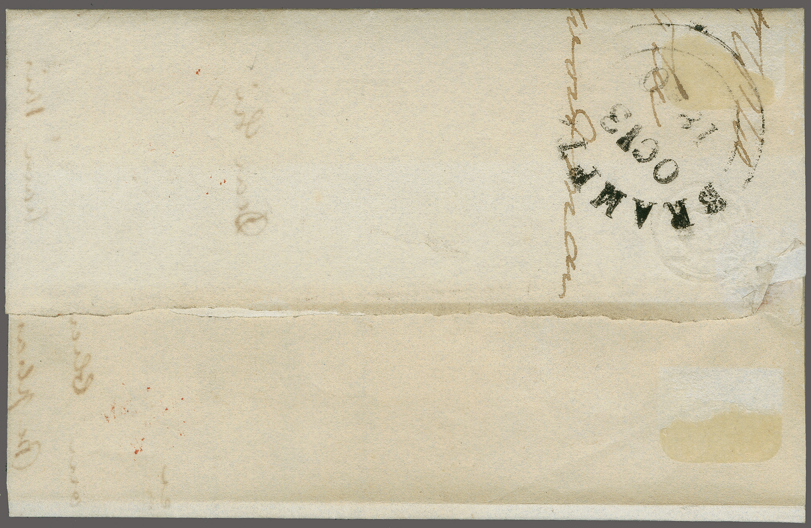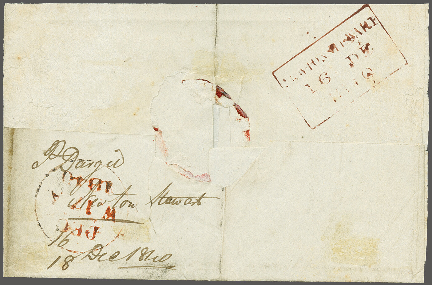 dull reddish purple" ink. Reverse with framed "Newton Stewart" despatch handstamp (Dec 16) in the same ink as the Cross and Edinburgh arrival in orange-red. This cover mentioned in Alcock & Holland on page 31 and listed in Rockoff & Jackson