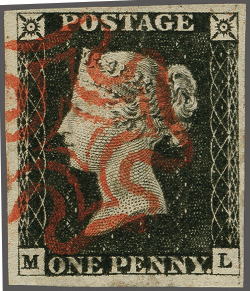 1840: 1 d. black, plate 3, lettered ML, a fine used example with good to large margins all round, neatly cancelled by Maltese Cross in red Gi = £ 500. (Image 1)
