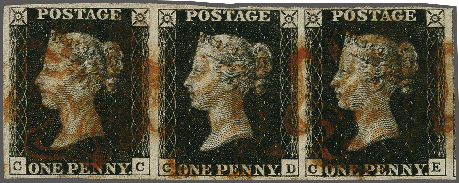1840: 1 d. black, plate 5, a used horizontal strip of three with good to ample margins all round and showing portion of adjoining stamp at right, cancelled by Maltese Crosses in red. An attractive and scarce multiple Gi AS25 =
