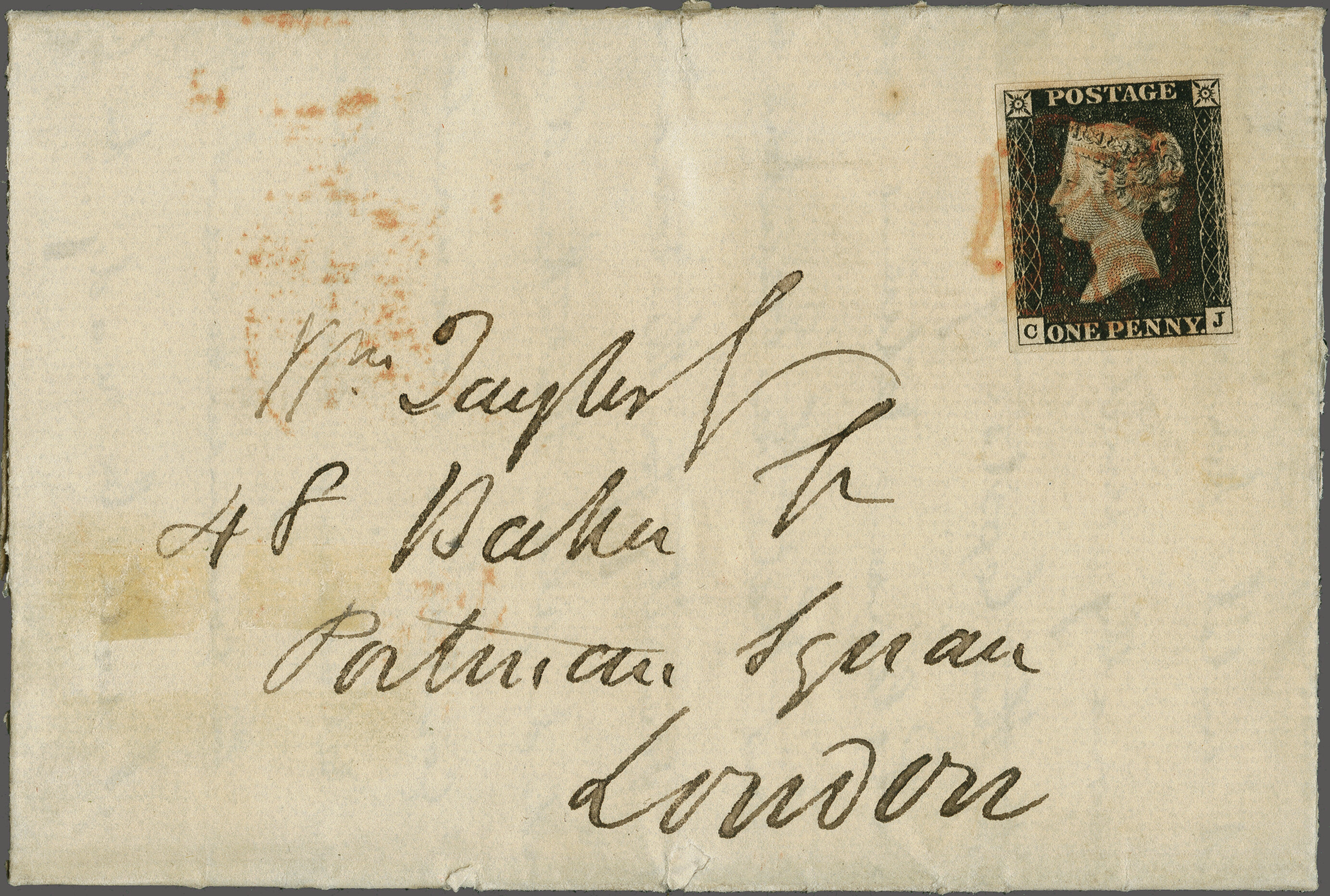 1840: 1 d. black, plate 4, lettered SG, a used example with three large margins and shaved at top with small inclusion, on 1840 entire letter to Peckham, Surrey tied by two strikes of the Maltese Cross alongside two strikes of