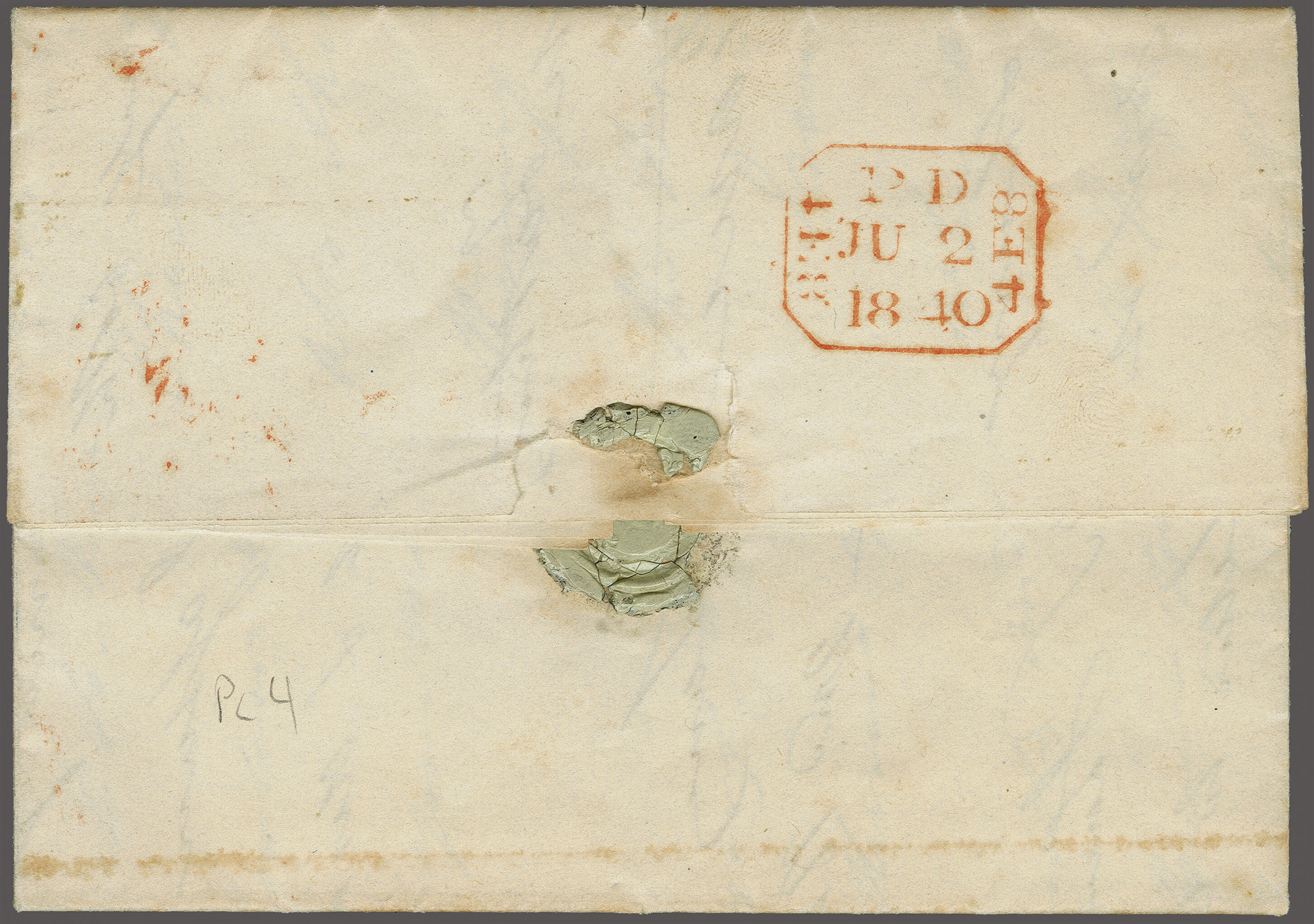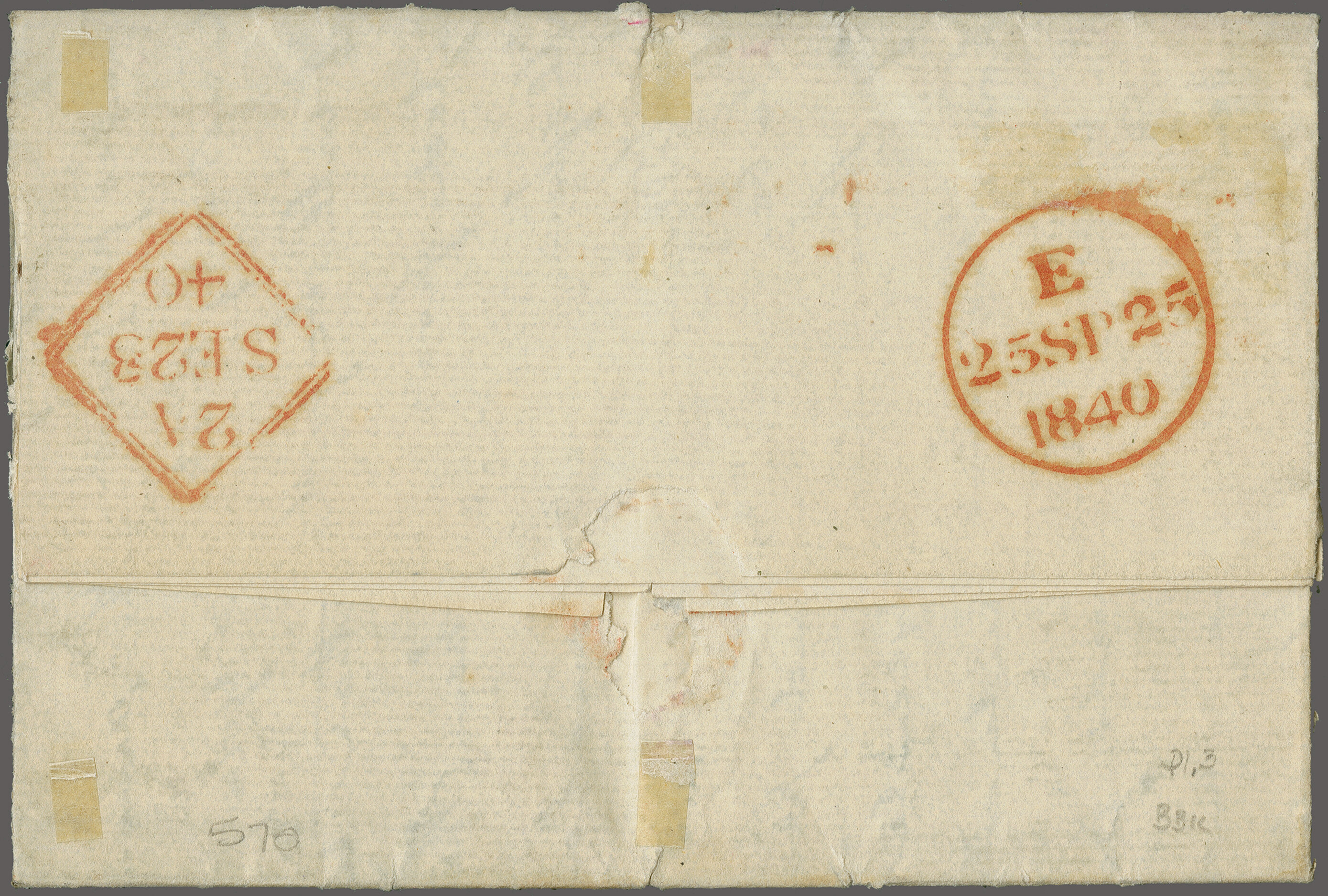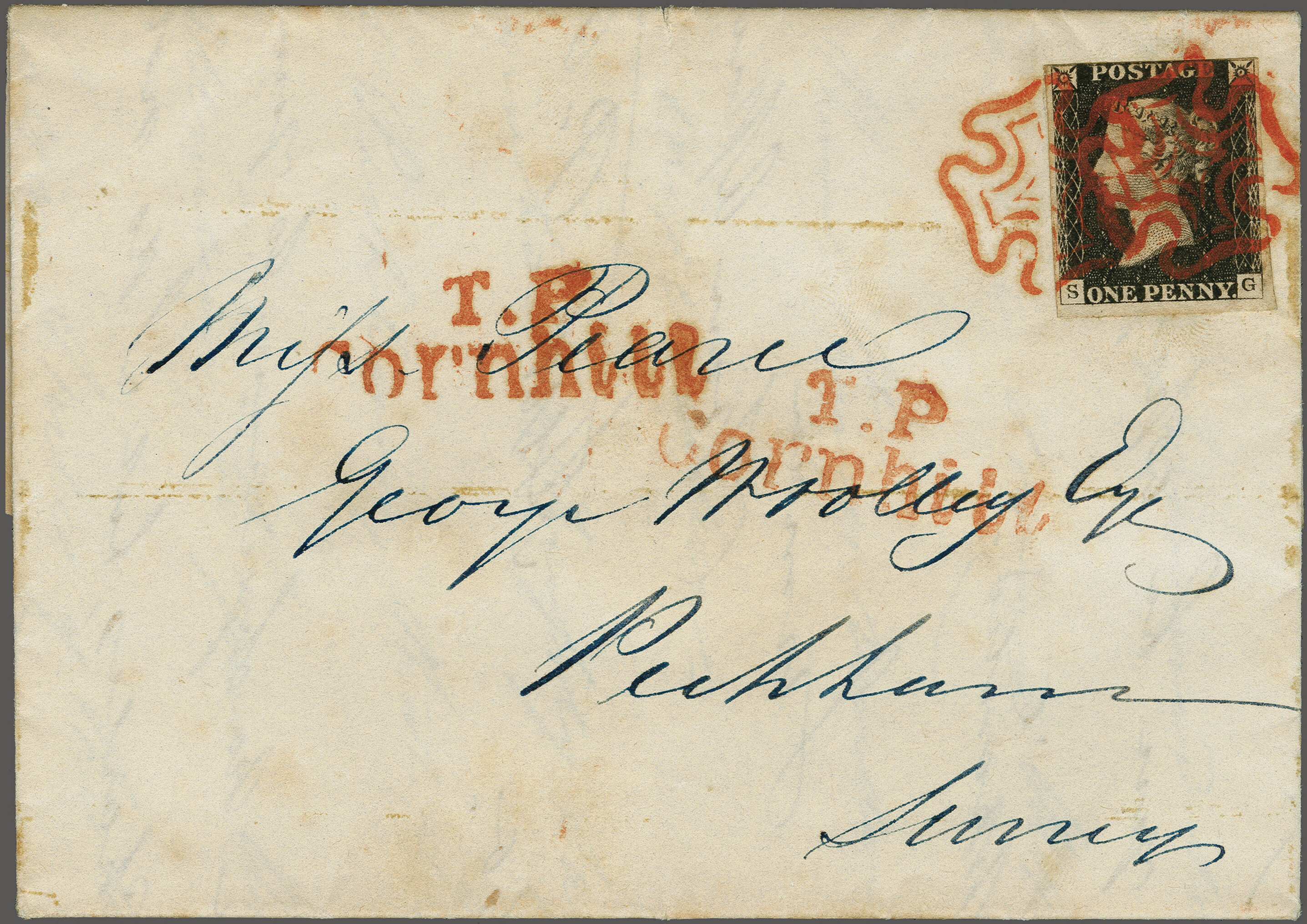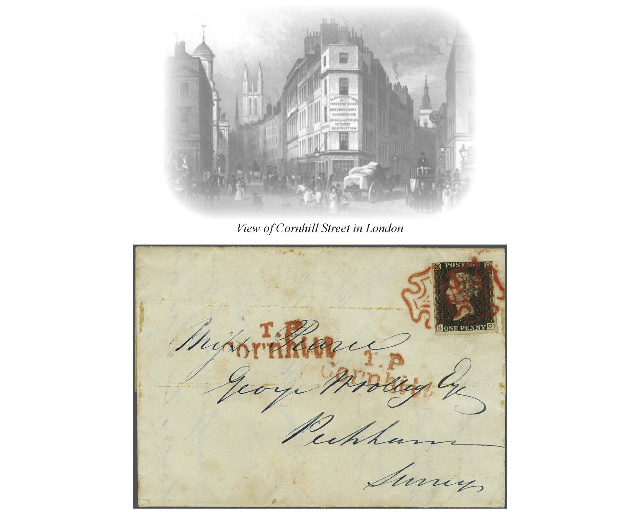 "T.P. / Cornhill" all in red. Reverse with framed despatch (2 June 1840). An unusual and attractive cover and an early usage from this Plate. (Image 1)