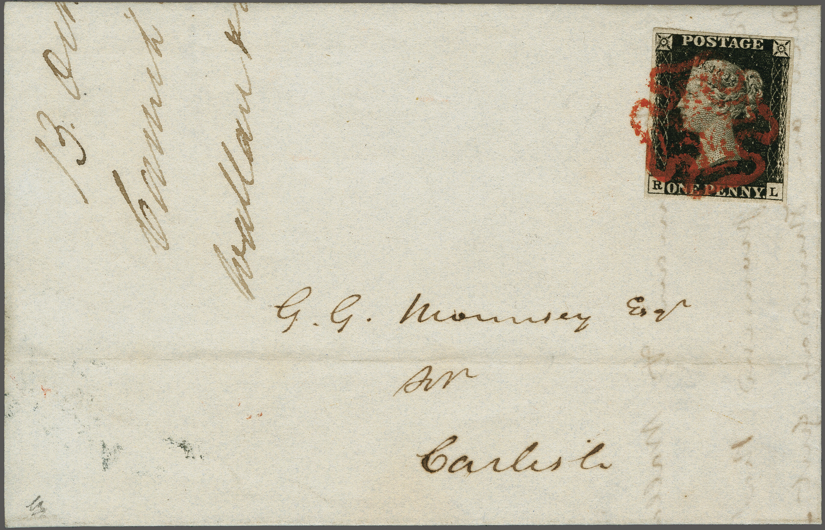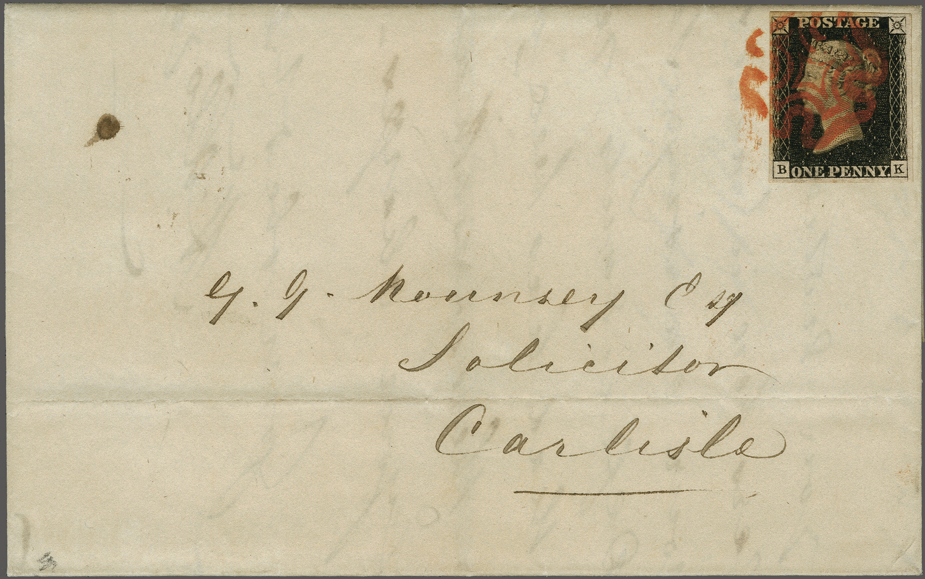 1840: 1 d. black, plate 4, lettered RK, a fine used example with good even margins all round, on 1840 entire letter from Brampton to Carlisle tied by red Maltese Cross. Reverse with Brampton (Cumberland) despatch cds (Oct 13)