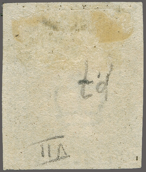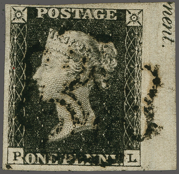 1840: 1 d. black, plate 4, lettered PL, a used example with ample to good margins and showing part of "Cement" marginal inscription at right, lightly cancelled by Maltese Cross in black. Fine and scarce thus Gi AS23 = £