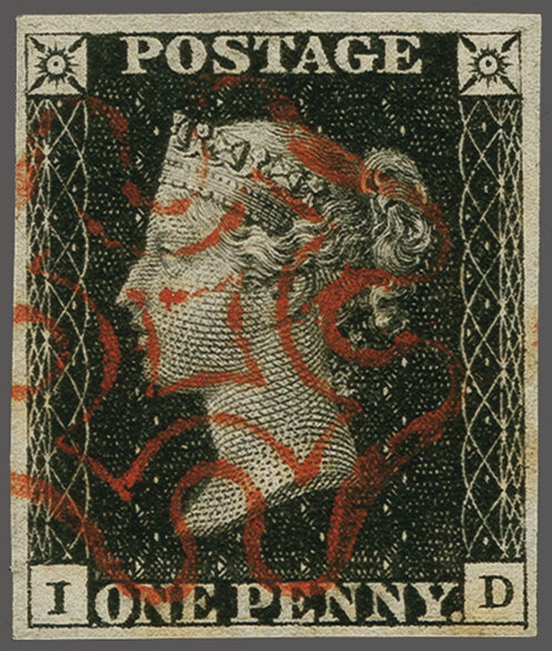 1840: 1 d. black, plate 5, lettered ID, a fine used example with good to large margins all round, neatly cancelled by crisp strike of the Maltese Cross in red Gi AS25 = £ 400. (Image 1)