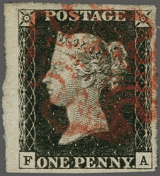 1840: 1 d. black, plate 5, lettered FA, a used example with close to large margins, sheet margin at left, lightly cancelled by red Maltese Cross Gi AS25 = £ 400. (Image 1)